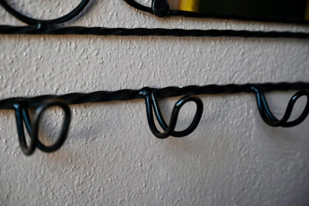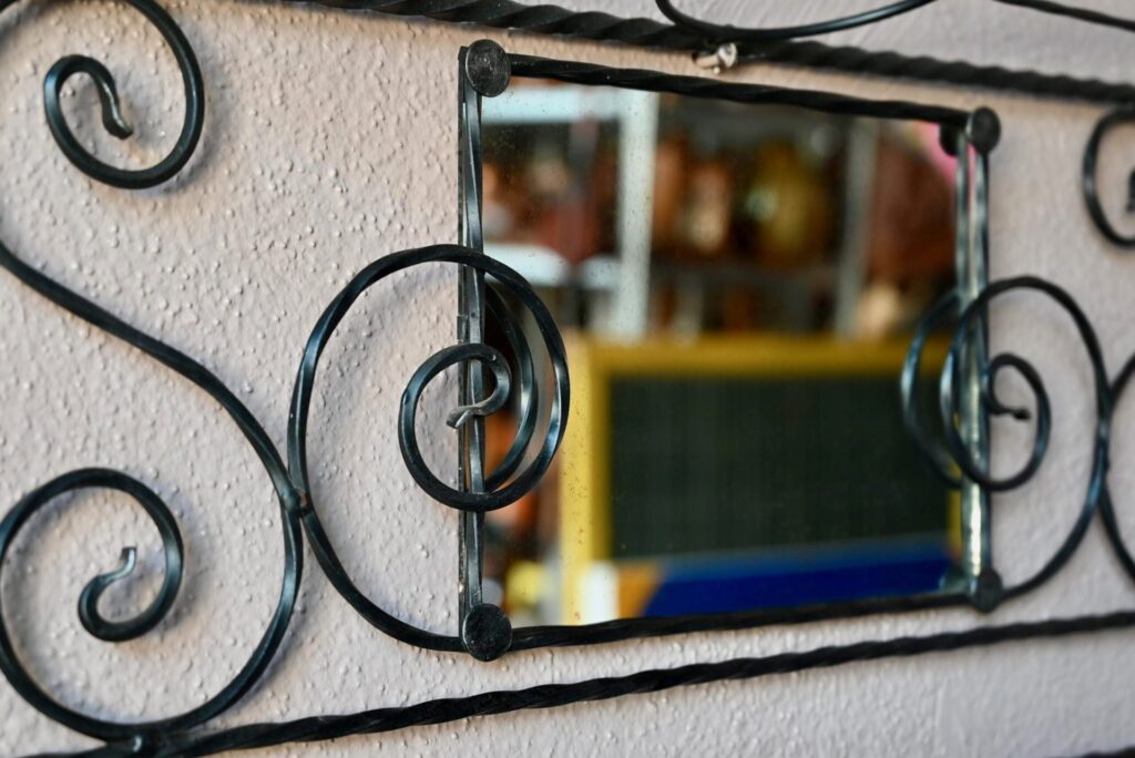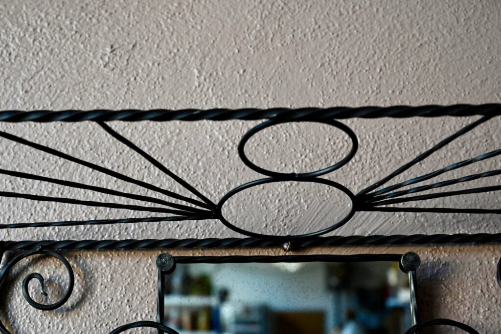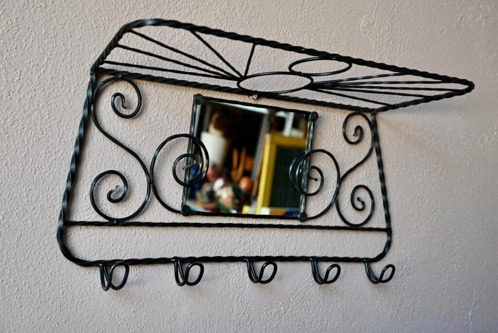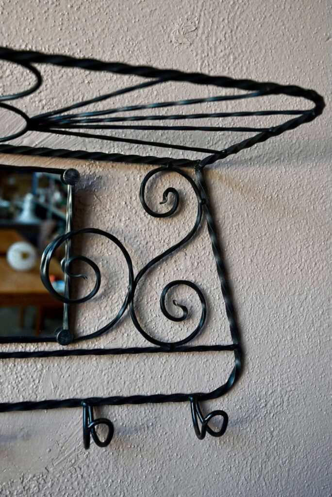 Voilà une pièce de déco murale midcentury comme on aime! 5 crochets, un miroir et un porte-chapeaux, il ne manque rien à ce porte-manteaux des années 50. Et comme s’il fallait encore nous convaincre, les détails du fer forgé sont plutôt délicats et originaux. Prêt à faire décoller l’ambiance de votre entrée?