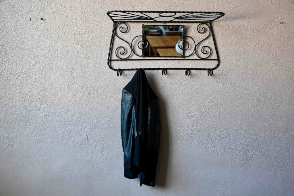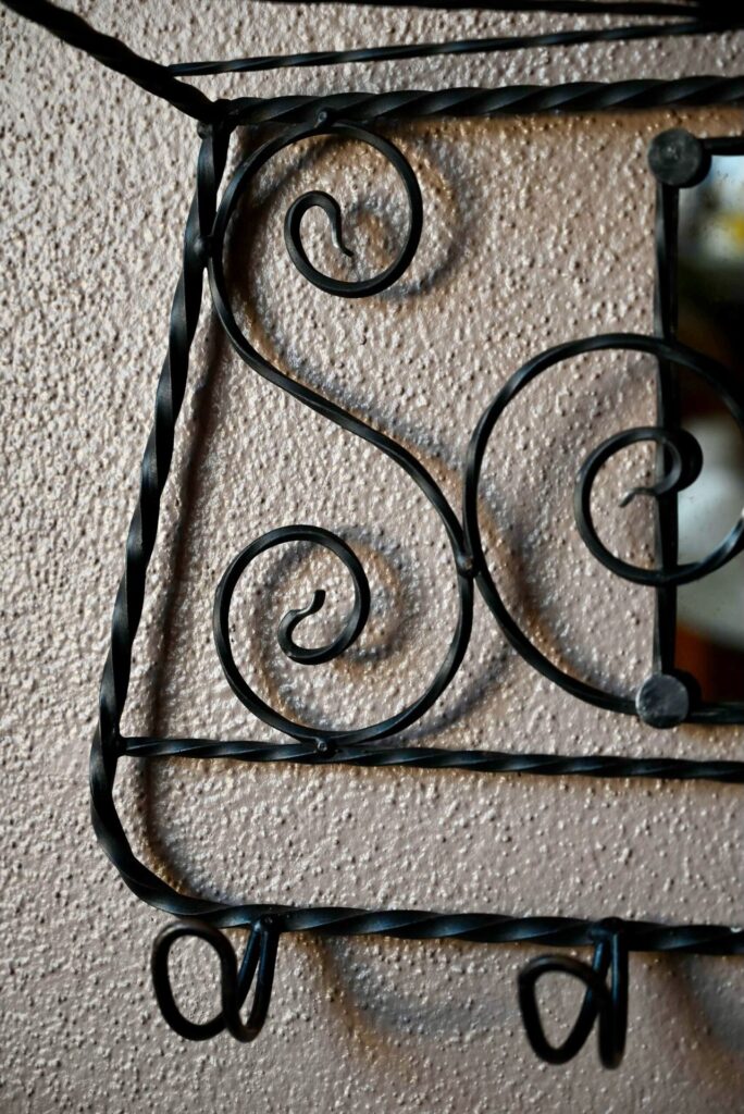 L’ensemble porte-manteaux, miroir est ancien, il date des années 50. Il est en fer forgé joliment travaillé. Il est composé de 5 patères et d’un porte-chapeaux. Le miroir est ancien, légèrement incliné. Le tain est légèrement marqué. L’ensemble est original et en bel état.