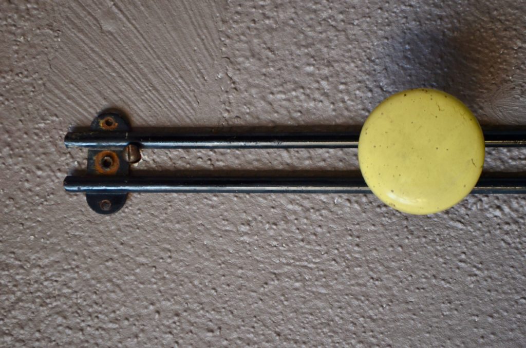 La structure du porte-manteaux est en métal noir. 4 patères de forme libre en métal doré y sont fixées. L’ensemble est joliment patiné par les années. Des traces sont visibles et de légers manques de peinture. Des trous situés aux extrémités permettent la suspension du porte-manteaux.
