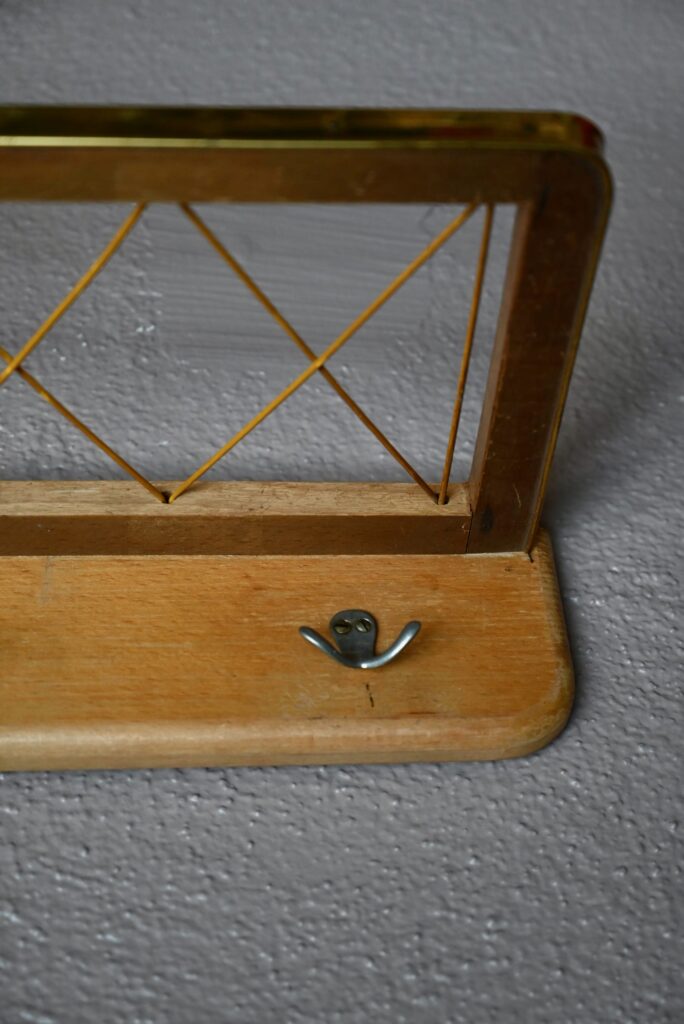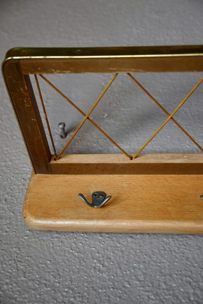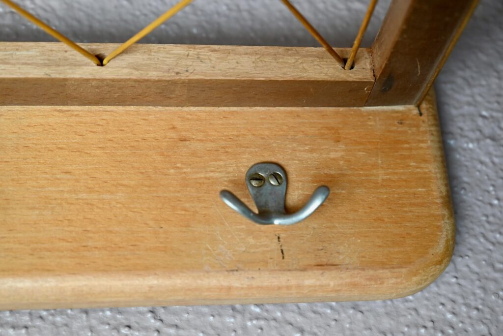 Le porte-manteaux est en bois, bordé d’un chant en vinyle doré. Le porte-chapeaux est en scoubidou jaune. 3 crochets double en métal sont présents. Il est parfaitement fonctionnel quelques traces d’usage sont visibles à la surface du bois. Des trous permettent sa suspension murale.