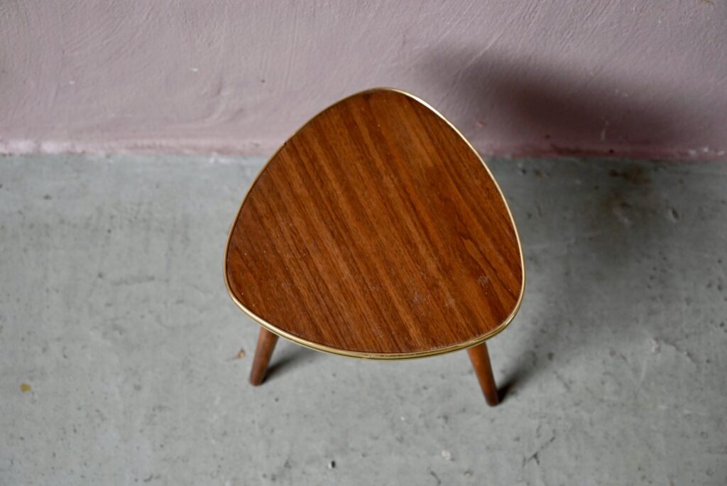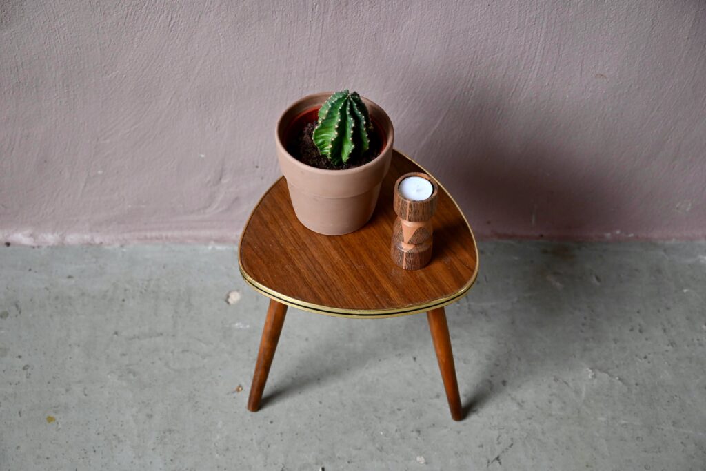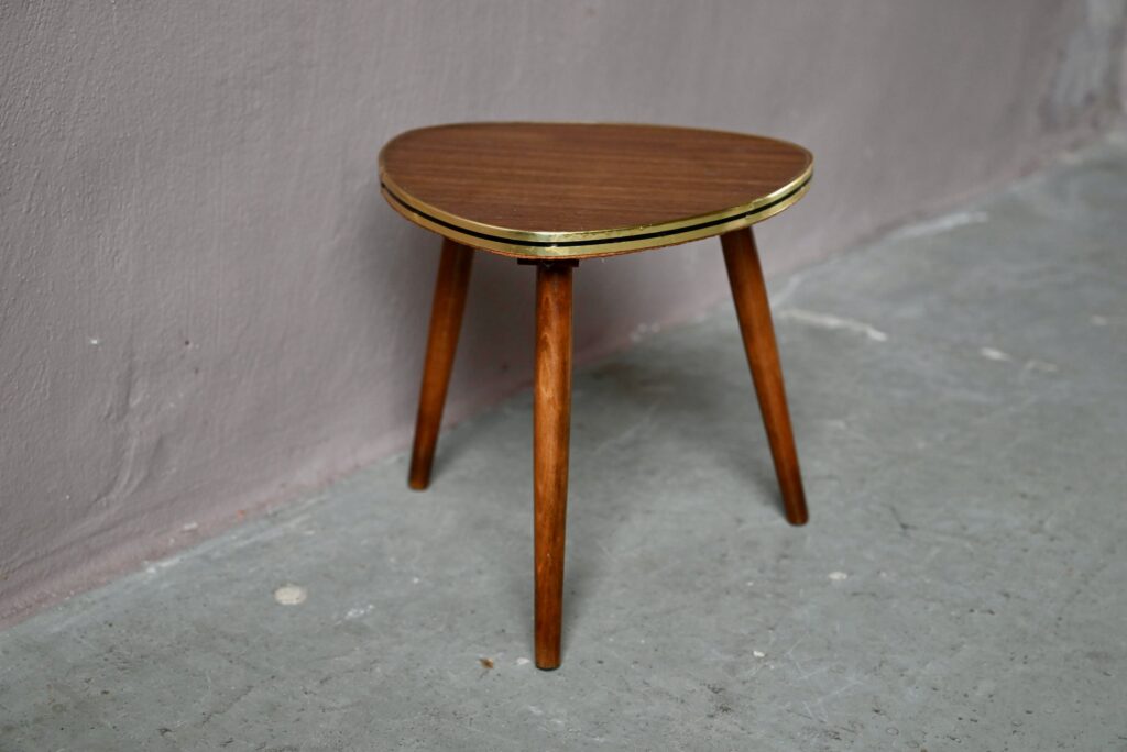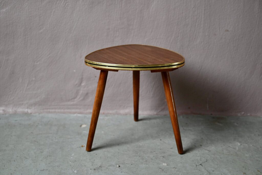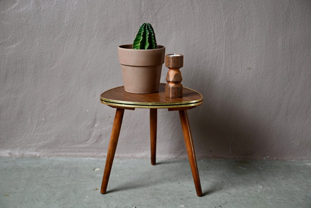 Guéridon ou table miniature des années 70, ce mignon accessoire déco est particulièrement attachant et rétro. Il deviendra le support parfait de vos cactées ou d’une petite lampe colorée. Doté d’un plateau triangulaire imitation bois et porté par de fins pieds compas, ce petit porte-plantes est un parfait accessoire déco.