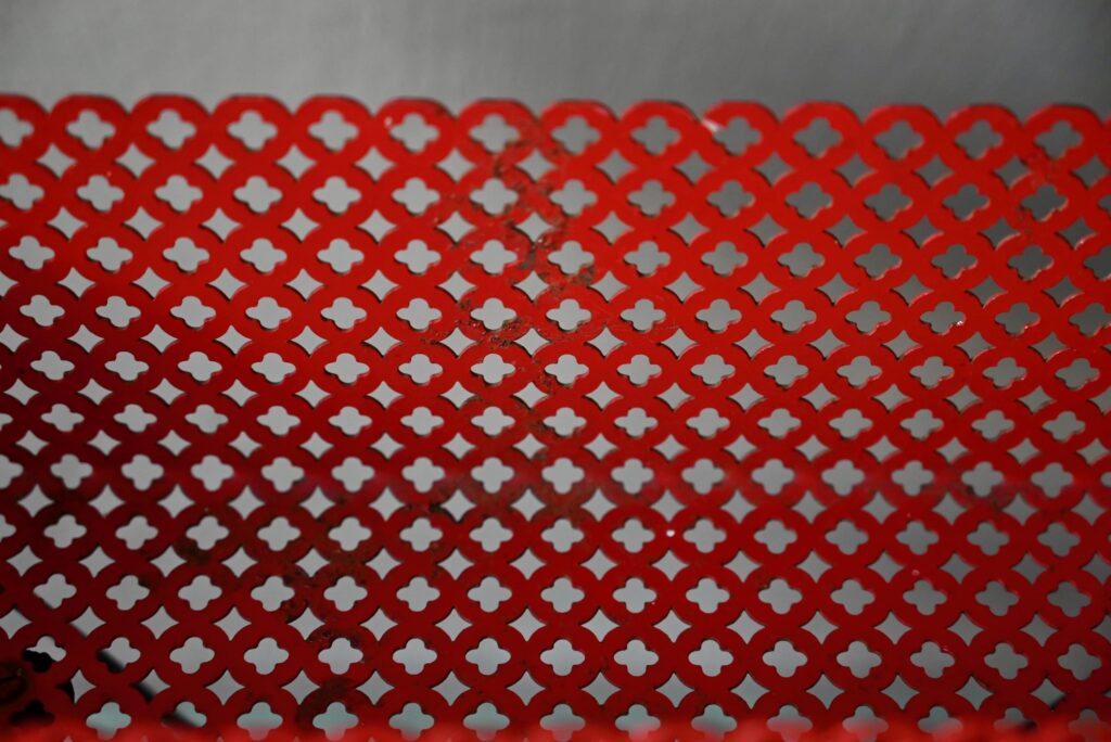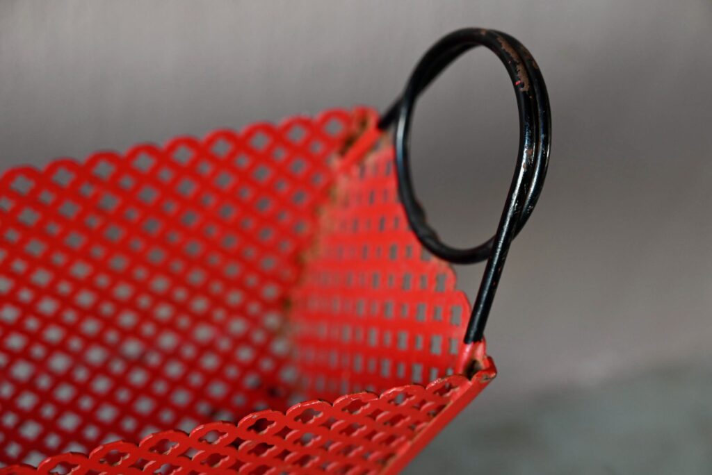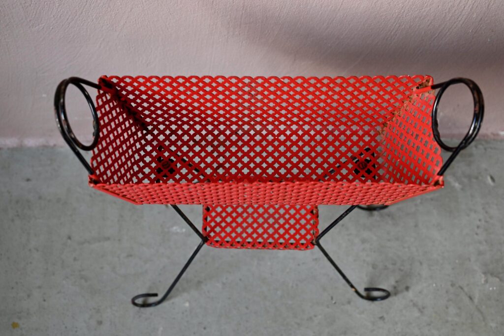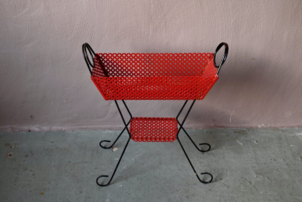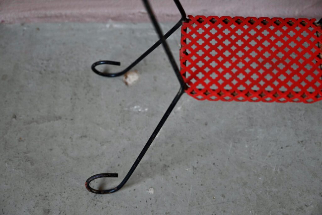 Le porte-plantes en tôle perforée rouge date des années 50. Il comprend un piétement en métal noir, une tablette et un bac. Le métal est perforé de motifs géométrique, la peinture rouge est d’origine. Quelques traces d’oxydation sont visibles en photo. L’ensemble est en très bel état, stable, les couleurs sont vives!