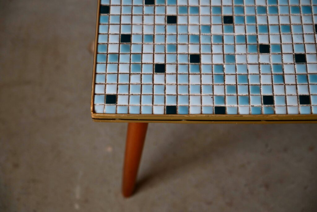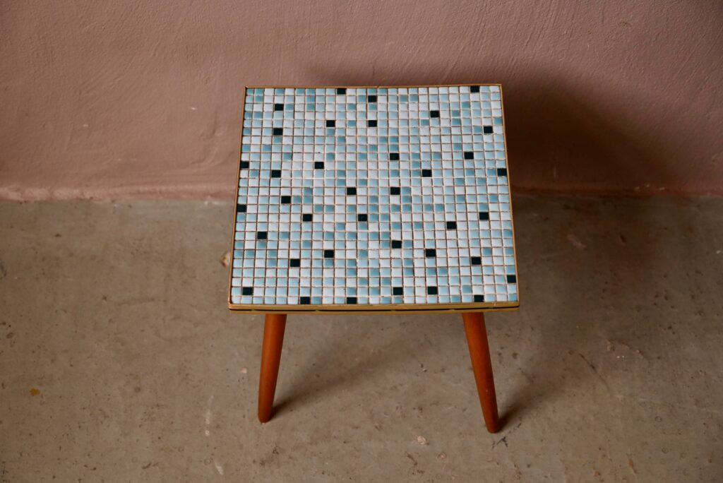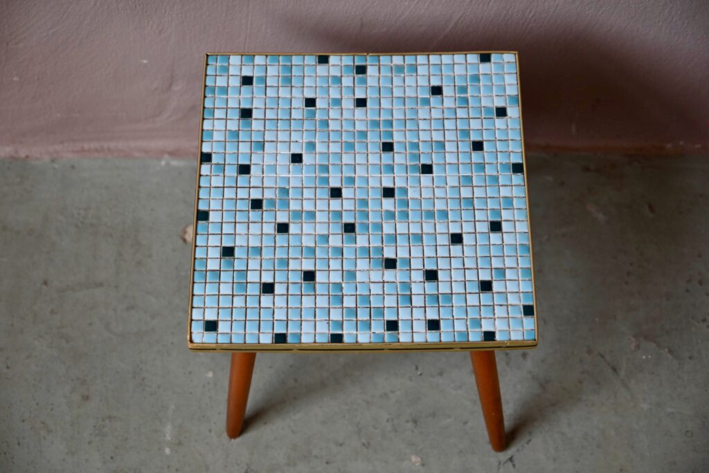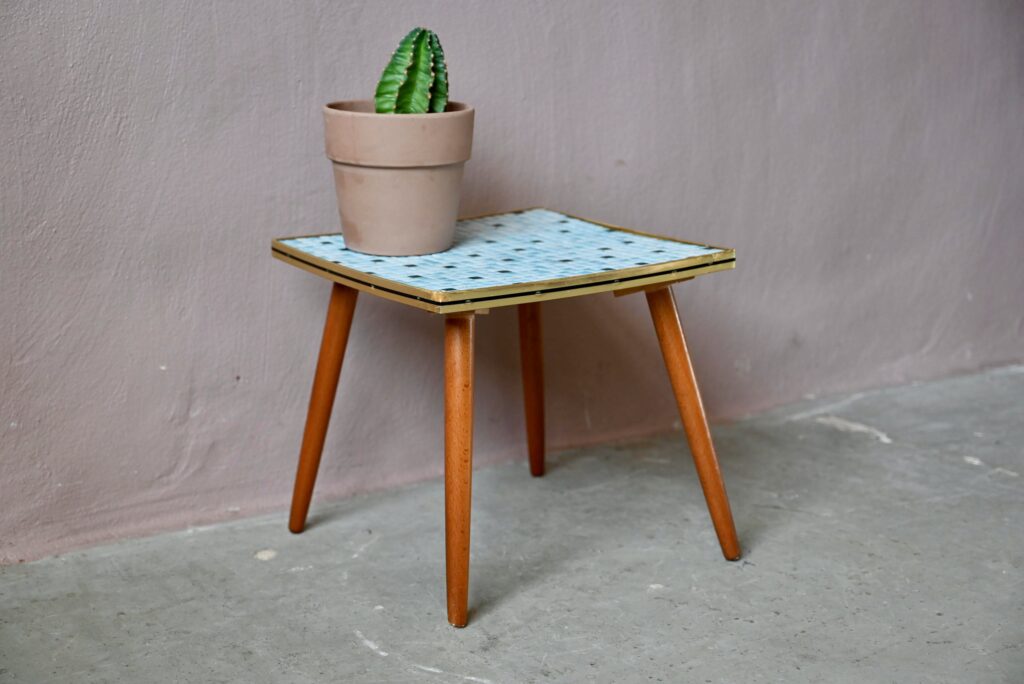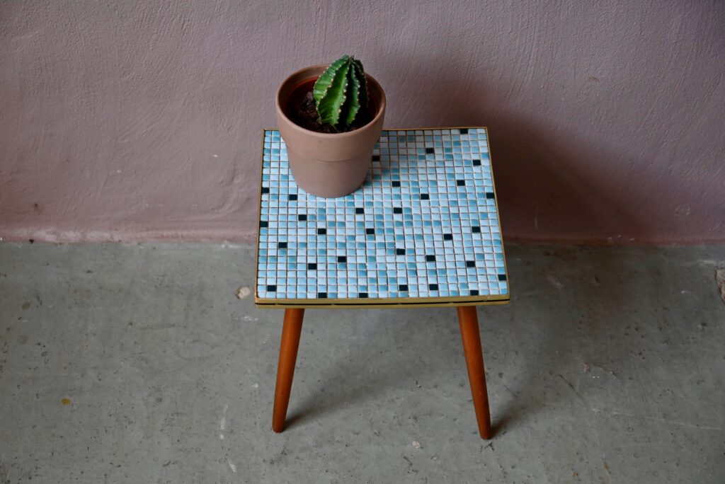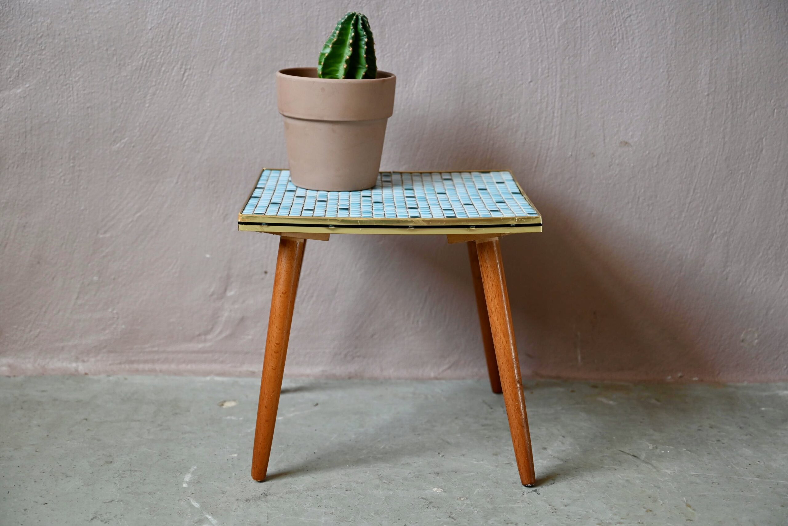 Ces mini-tables sont des must-have en provenance des années 60-70 ! Porte-plantes, chevet vintage, table de dînette ou bout de canapé, tout est envisageable avec les tripodes ! Voici une version avec un plateau en carreaux de mosaïque de tons bleus dans un esprit graphique et pop!