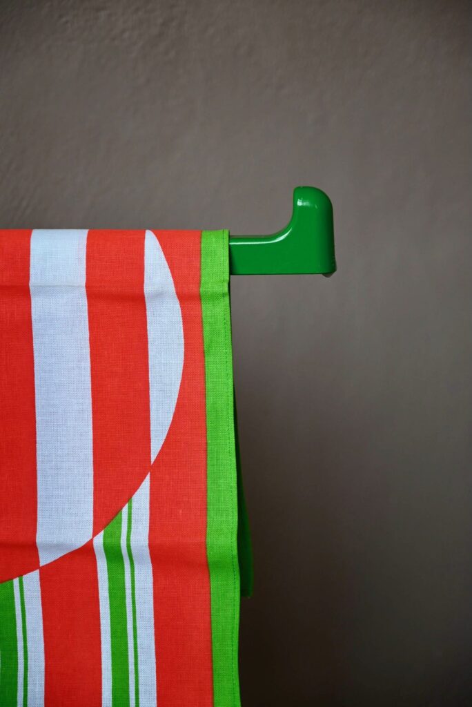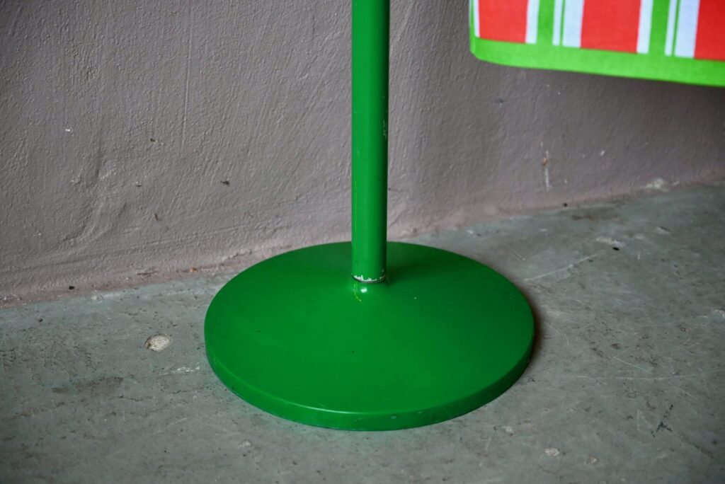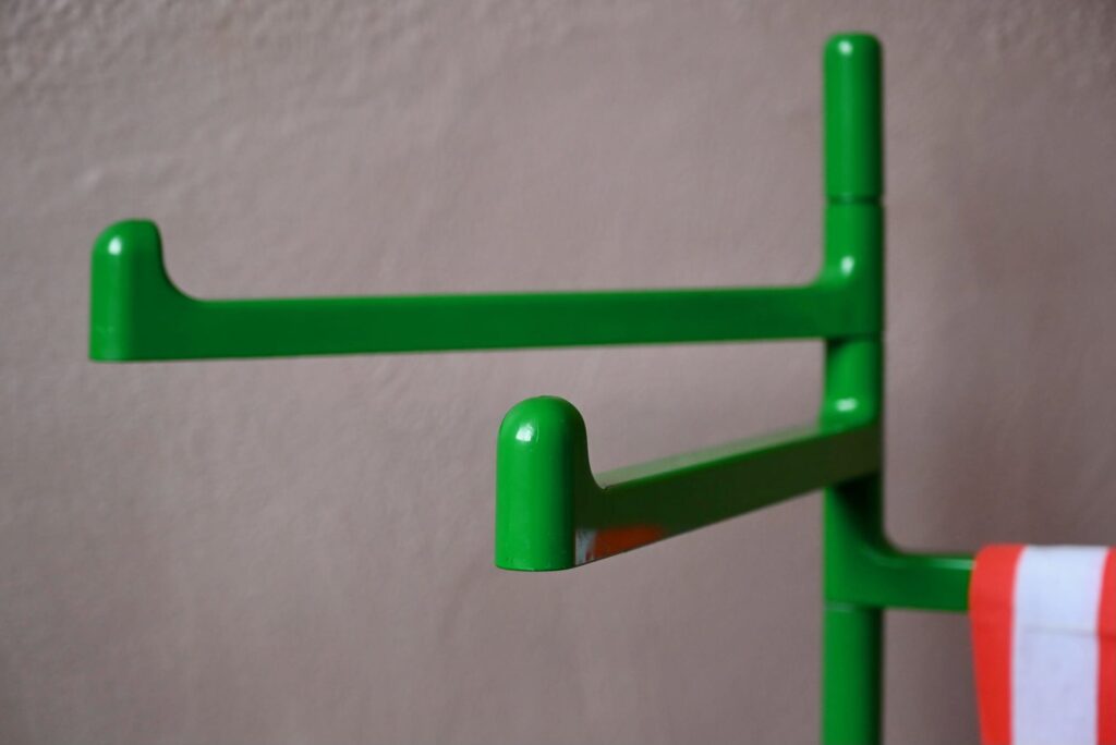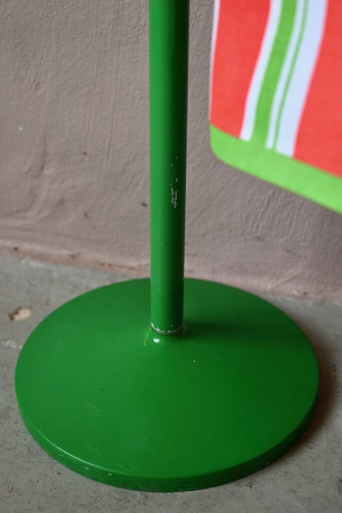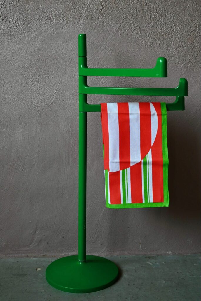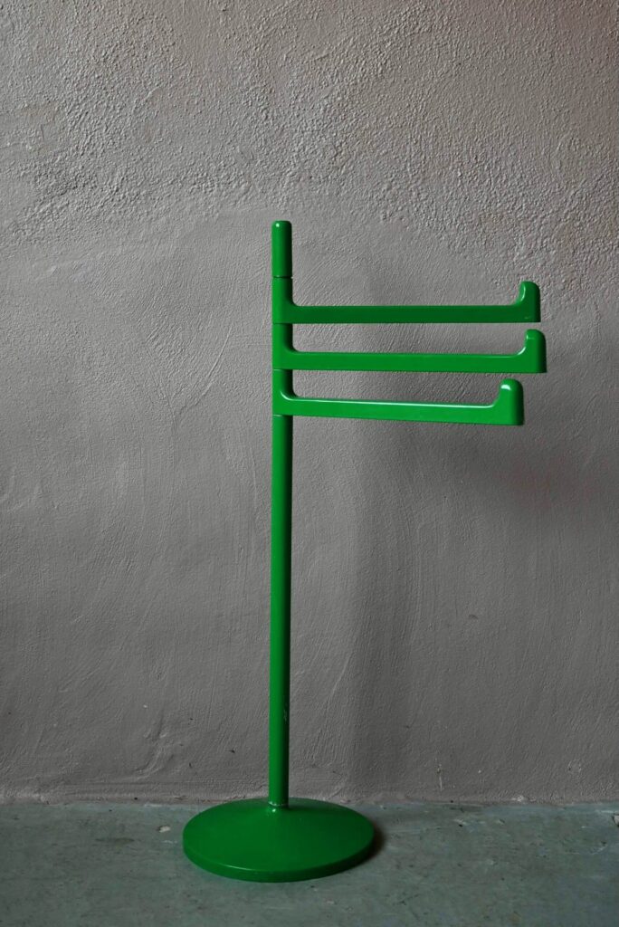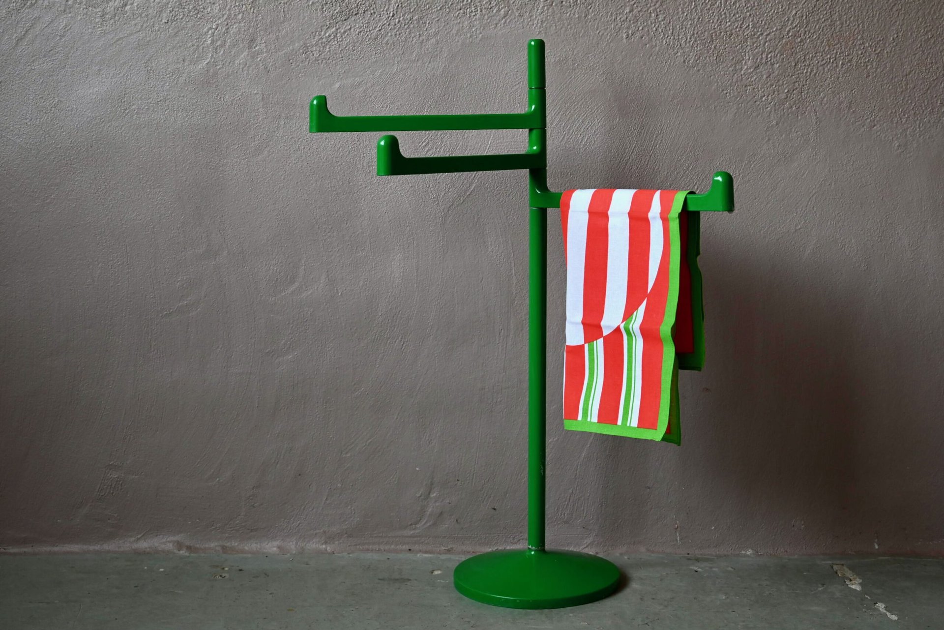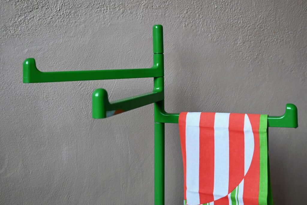 Design futuriste pour ce porte-serviettes des années 80. Tout en plastique vert vif, doté d’un pied tulipe et de formes aérodynamiques, les lignes de l’objet s’inscrivent parfaitement dans l’esprit Space Age. Pratique et plein de style, il est doté de 3 portants mobiles pour les serviettes de toute la famille.