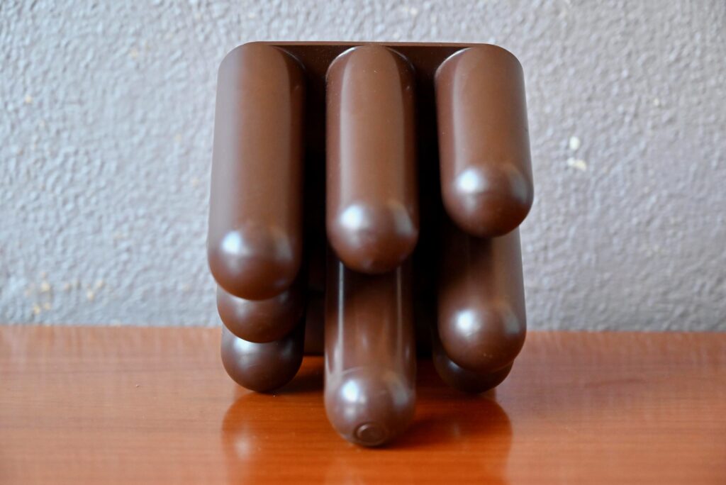 Le nécessaire de bureau est en plastique moulé de couleur marron. Il est en bon état, quelques rayures légères sont visibles. C’est une production ouest allemande des années 1970 au design très inspiré par l’ère spatiale.
