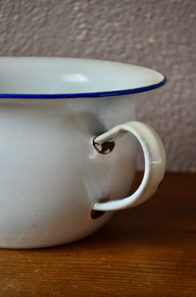 Objet usuel et accessoire domestique d’autrefois, il est urgent de le détourner de son usage! Ce pot de chambre ancien est fabriqué en tôle émaillée. Il est doté d’une anse et d’un liseré bleu. Objet bohème et patiné, nous l’imaginons en cache-pot, vide-poche et objet déco en forme de clin d’œil.