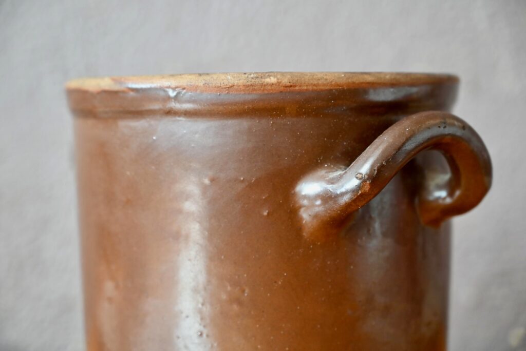 Ces pots en grès émaillé servaient à la conservation et à la fermentation des denrées alimentaires. Navets salés, choucroute, charcuterie pouvaient y être élaborés. Imposantes et aux parois épaisses, elles permettaient une maturation lente des aliments. Aujourd’hui, elles pourront parfaitement remplir leur rôle en vous aidant à la préparation de légumes lactofermentés de toutes sortes. Elles deviendront aussi des pièces déco au charme rustique et authentique. Porte-revues, accessoire de rangement, porte-parapluies, pot de fleur… tout est possible pour ces touchantes céramiques utilitaires anciennes.