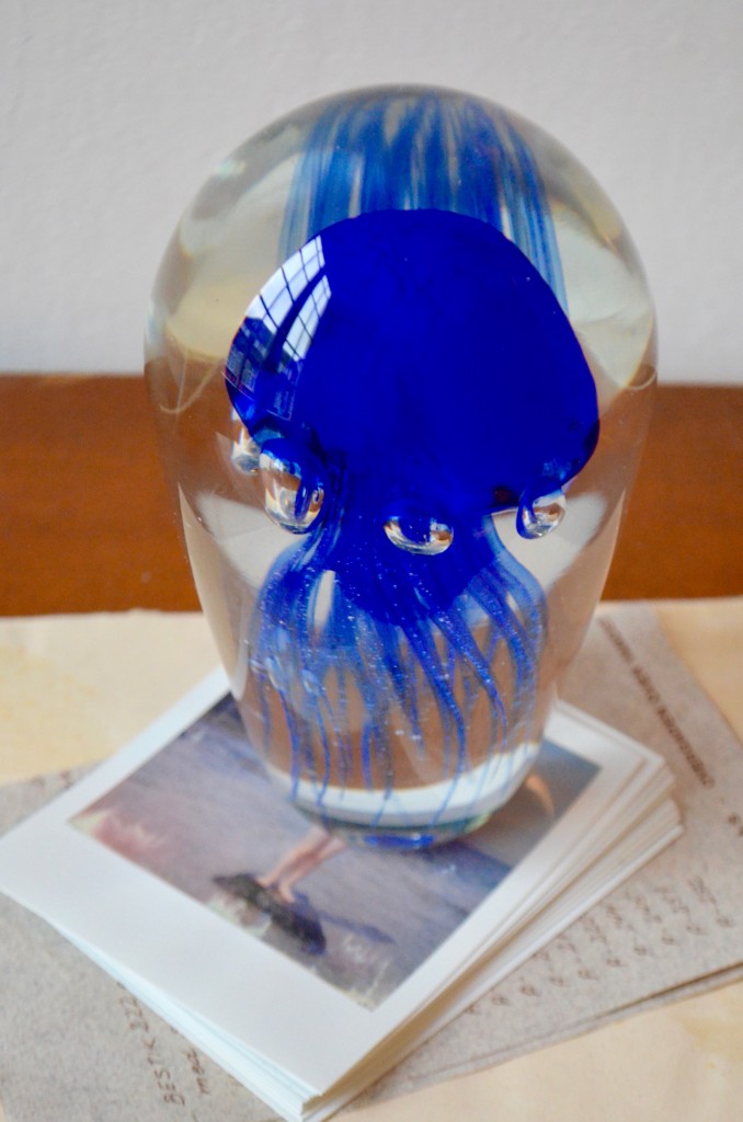 Le presse papier est en verre soufflé. Une méduse bleu est incrustée en son centre, d’une très belle couleur bleu. La pièce est en très bel état.