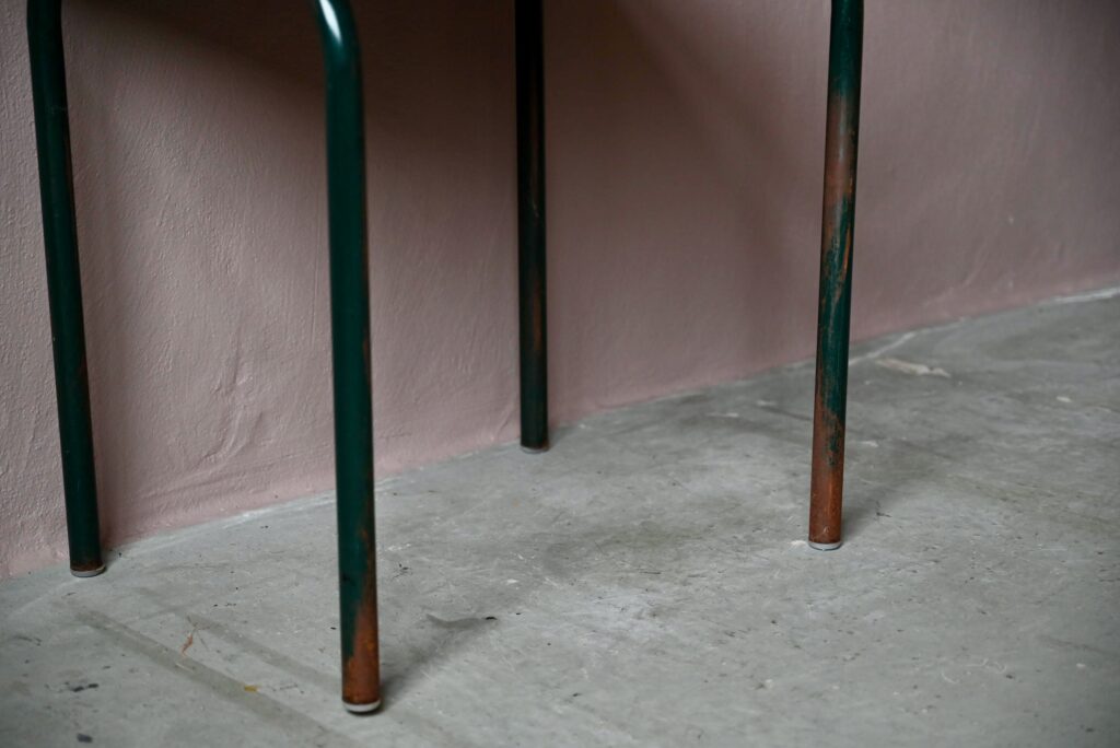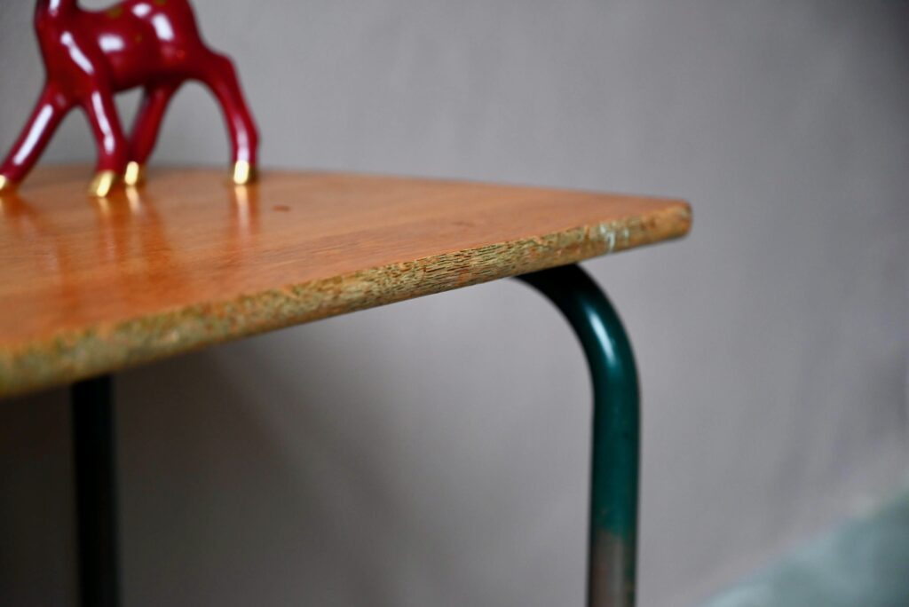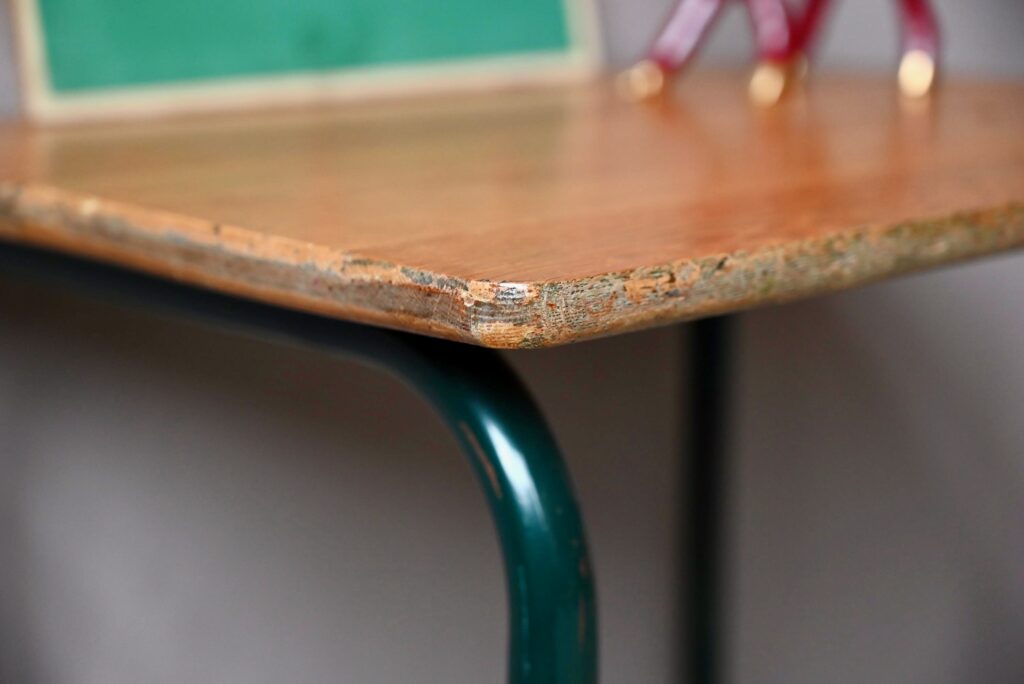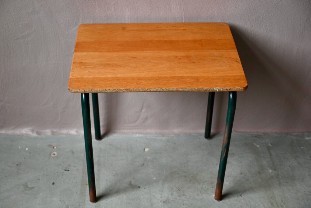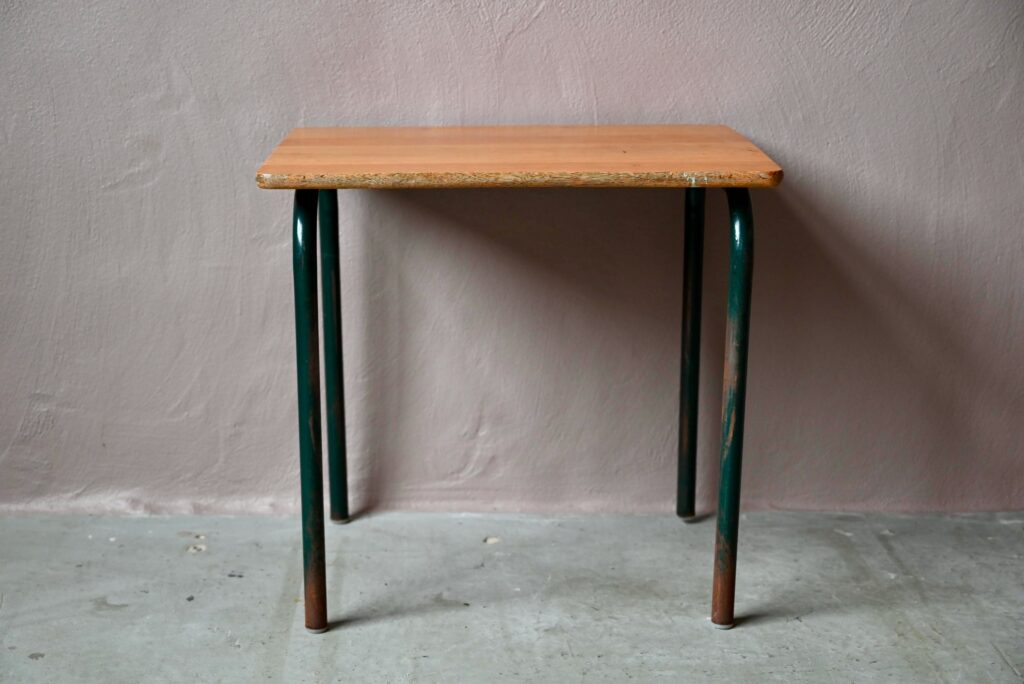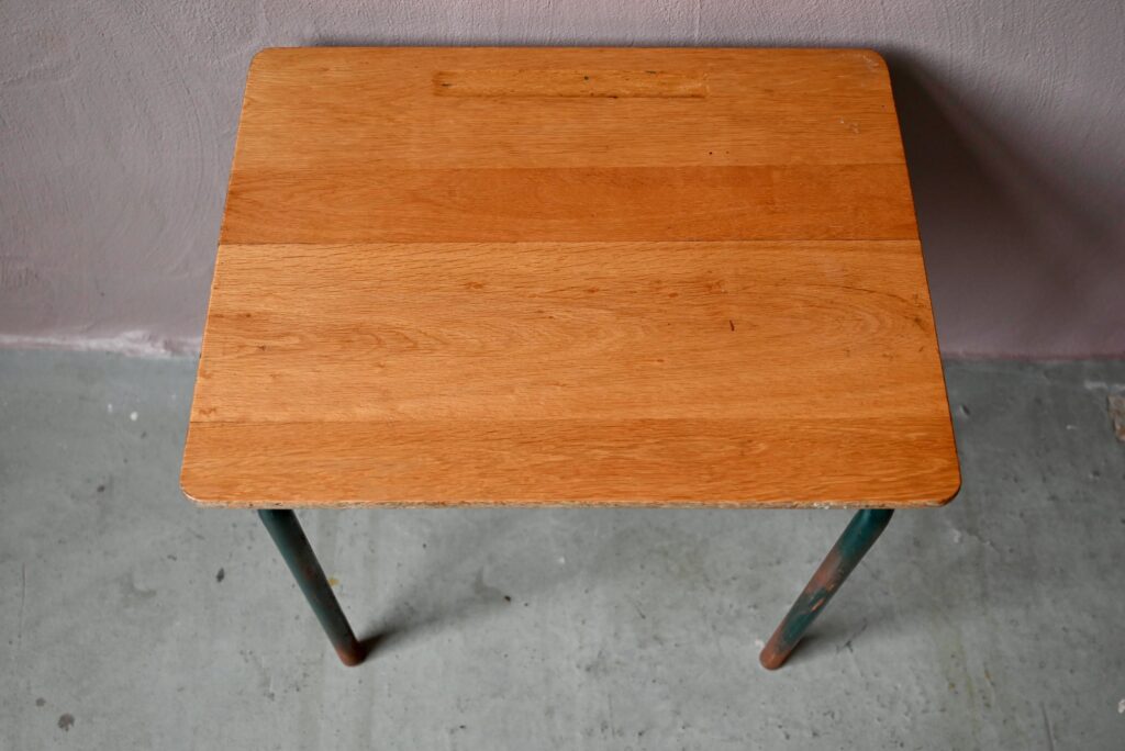 Le bureau est ancien. Il dispose d’un épais plateau en bois massif d’une teinte dorée. Des traces d’usage sont à noter, visibles en photo. Le piétement tubulaire est en métal. L’ensemble est stable et costaud.
