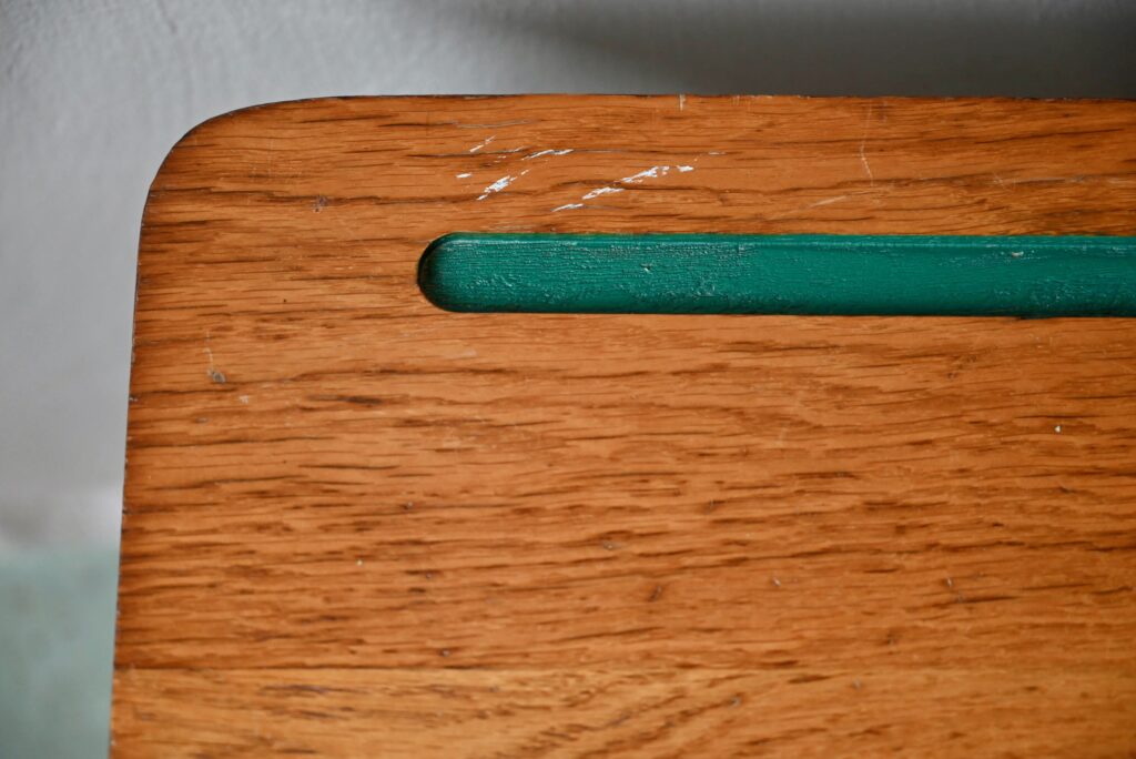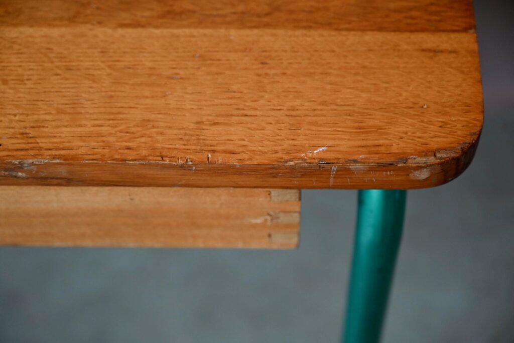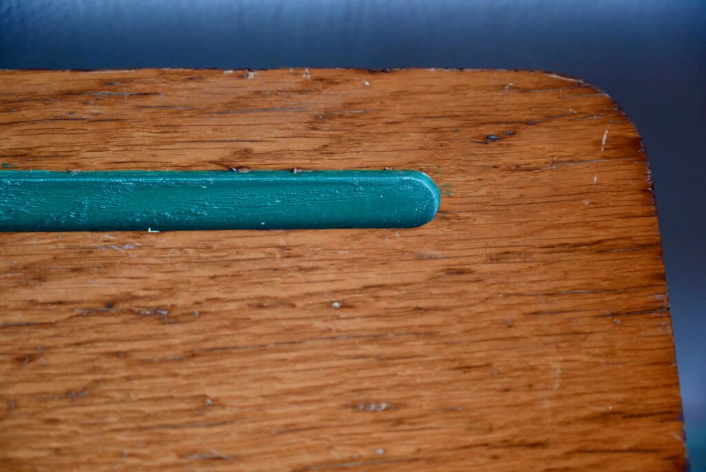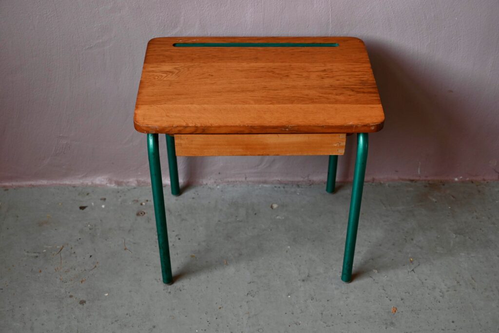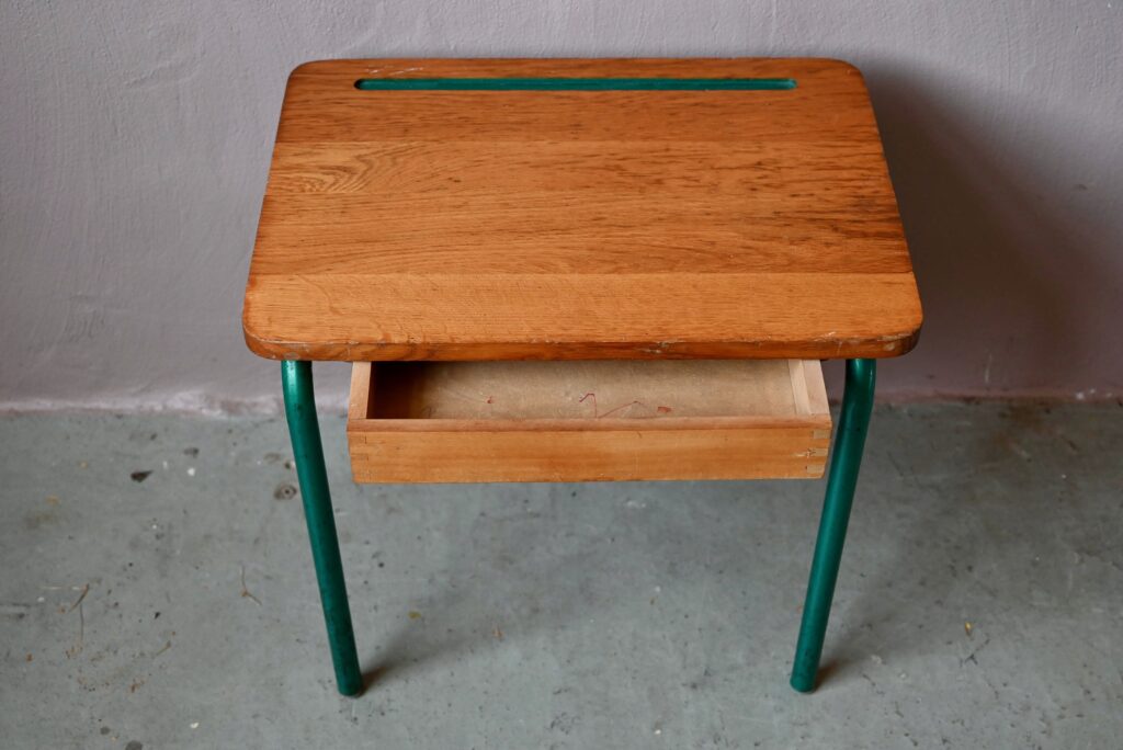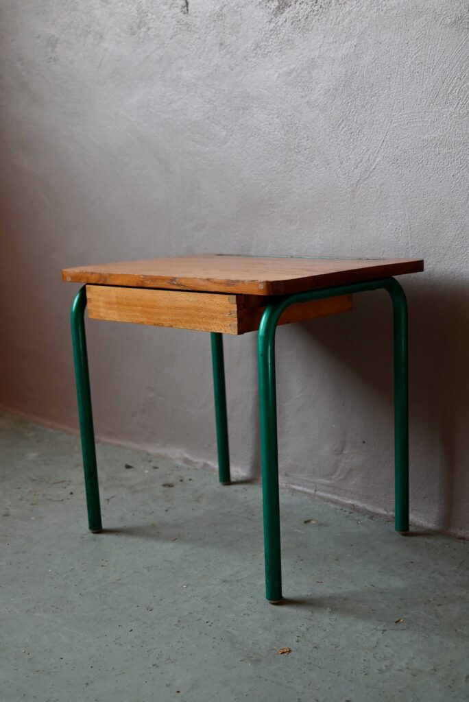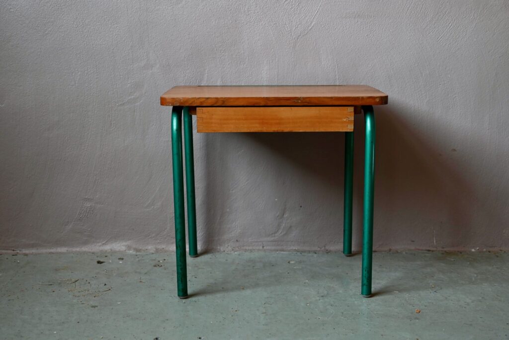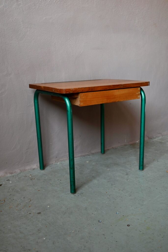 Le bureau est ancien. Il dispose d’un épais plateau en bois massif d’une teinte dorée. Des traces d’usage sont à noter, visibles en photo. Le piétement tubulaire est en métal vert, légères trace d’oxydation. Un petit tiroir est présent sous le plateau, une encoche à stylo est présente, peinte en vert. L’ensemble est stable et costaud.