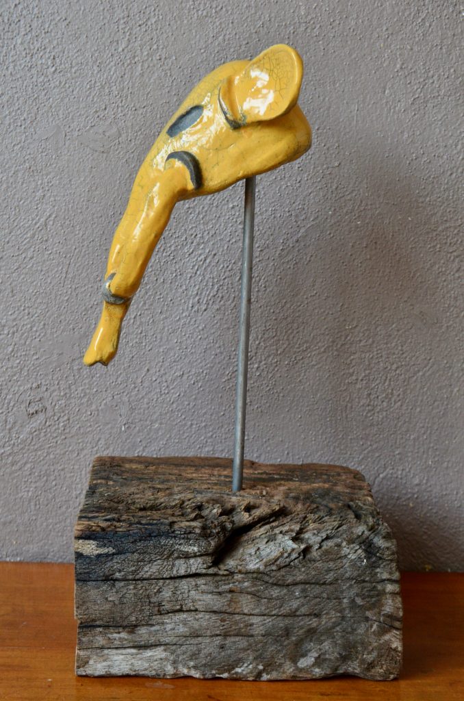 Tête d’un drôle d’animal, entre production ethnique et surréalisme, voici une céramique originale et sculpturale que l’on croirait sortie d’un songe. La matière est joliment travaillée, le jaune brillant et craquelé alterne avec un gris minéral mat texturé. La pièce zoomorphe est originale, dans un registre d’art brut et de travail artisanal. Elle est montée sur un support métallique, porté par un épais socle de bois brut.