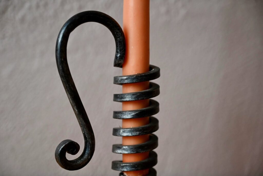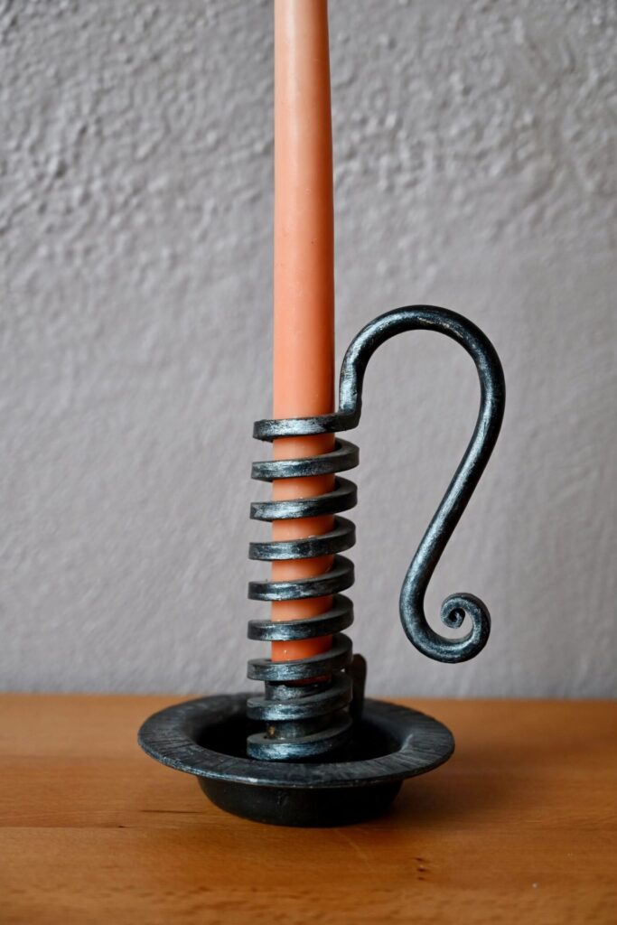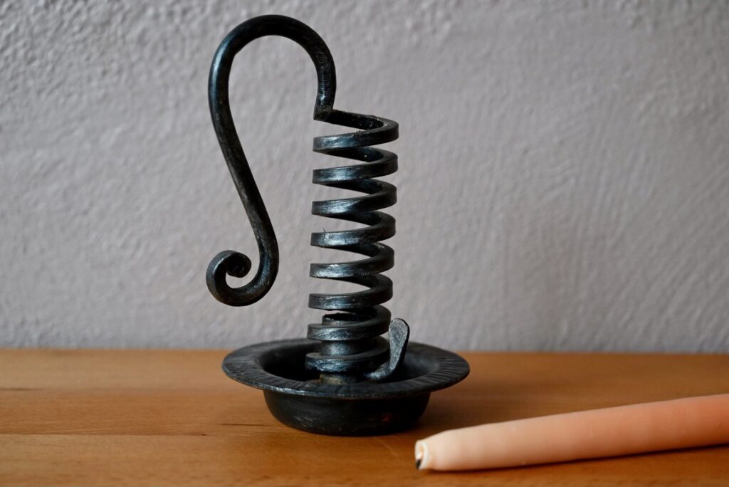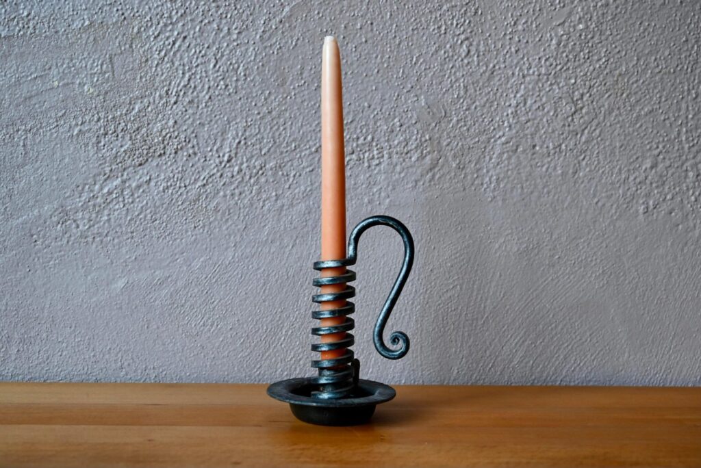 Le bougeoir de vigneron est ancien, en fer forgé. Il est parfaitement fonctionnel.