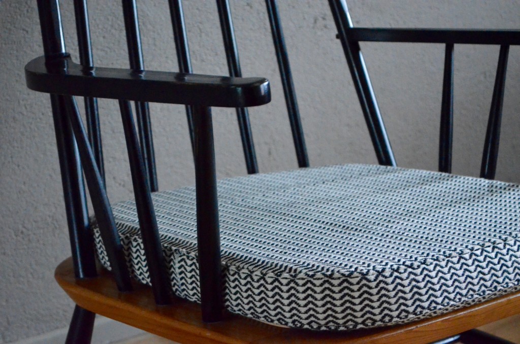 Le fauteuil est en bois, teinté noir. L’assise, en bois nature, n’est pas pleine : le treillis élastique apporte confort et souplesse d’assise. Le coussin a été refait, couvert d’un tissu noir et blanc aux motifs “chevrons”. Quelques discrètes traces d’usage sont à noter, visibles sur les photos. L’ensemble est stable, confortable et en très bel état.