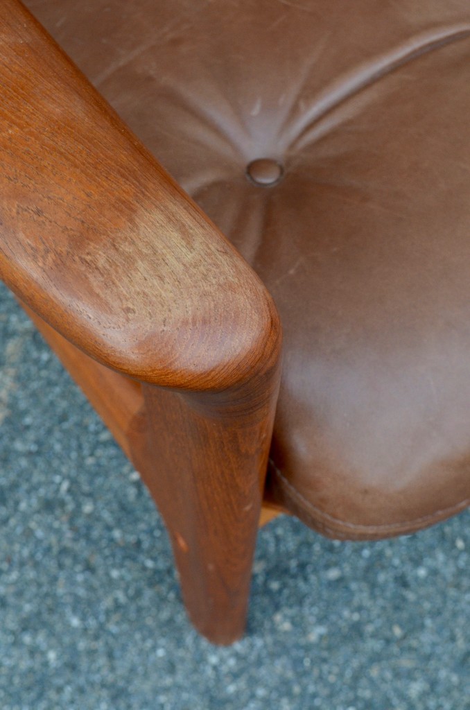 Le salon est composé de 3 pièces, toute de la même origine. Des traces d’usage légères sont visibles, notamment sur le cuir. L’ensemble est en bel état, confortable, une légère patine est visible sur les coussins de cuir et des très petites traces d’usage sont présentes sur le teck. Les étiquettes d’origine sont encore visibles sur certaines pièces. Les différents éléments peuvent éventuellement êtres vendus séparément.