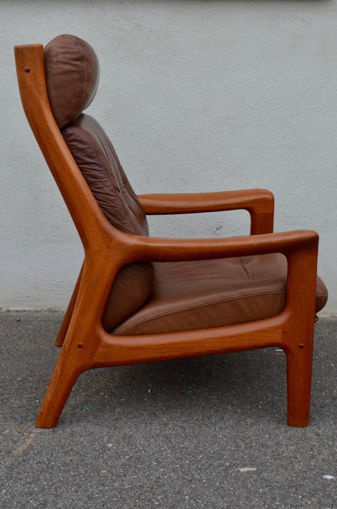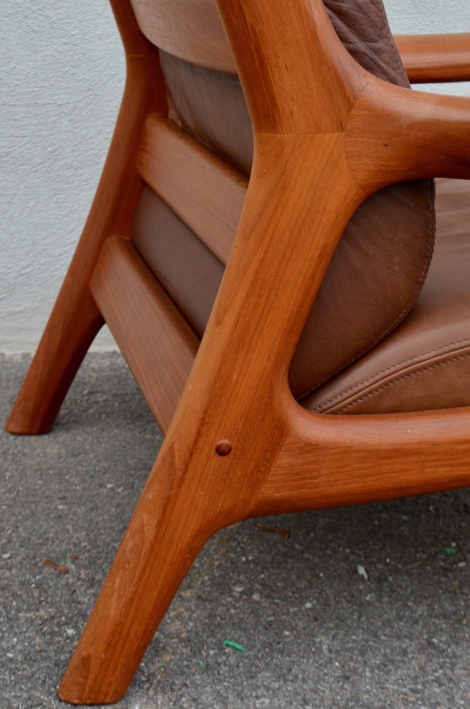 Complet et impressionnant, ce salon en cuir et teck est une production scandinave des années 60. Dessiné par Georg Thams pour Vejen Polstermøbelfabrik, il laisse la part belle aux matériaux. La structure en teck massif est travaillée dans l’épaisseur et dans des courbes organiques ; le cuir de teinte marron glacé est à la fois souple et doux. L’ensemble salon est complet et homogène, il est constitué d’un large canapé 3 places, d’une banquette 2 places et d’un fauteuil.