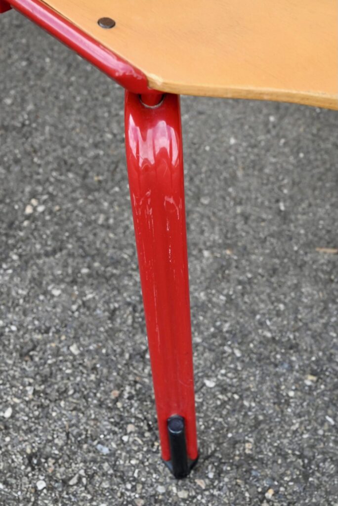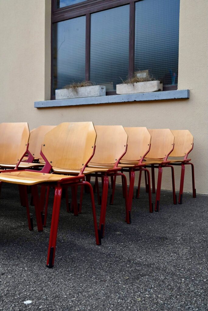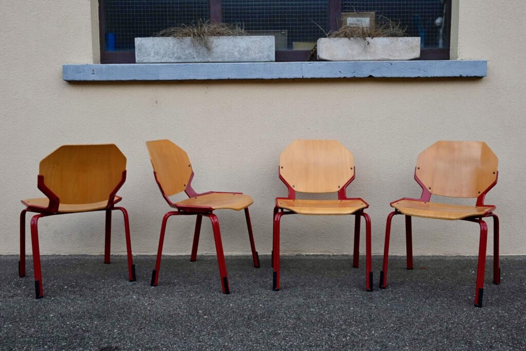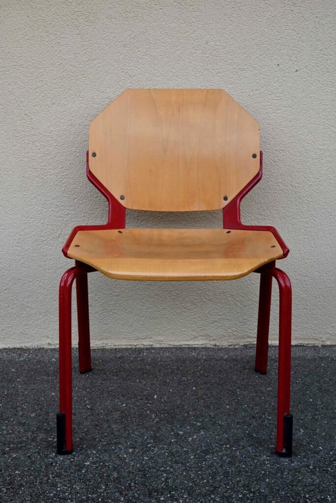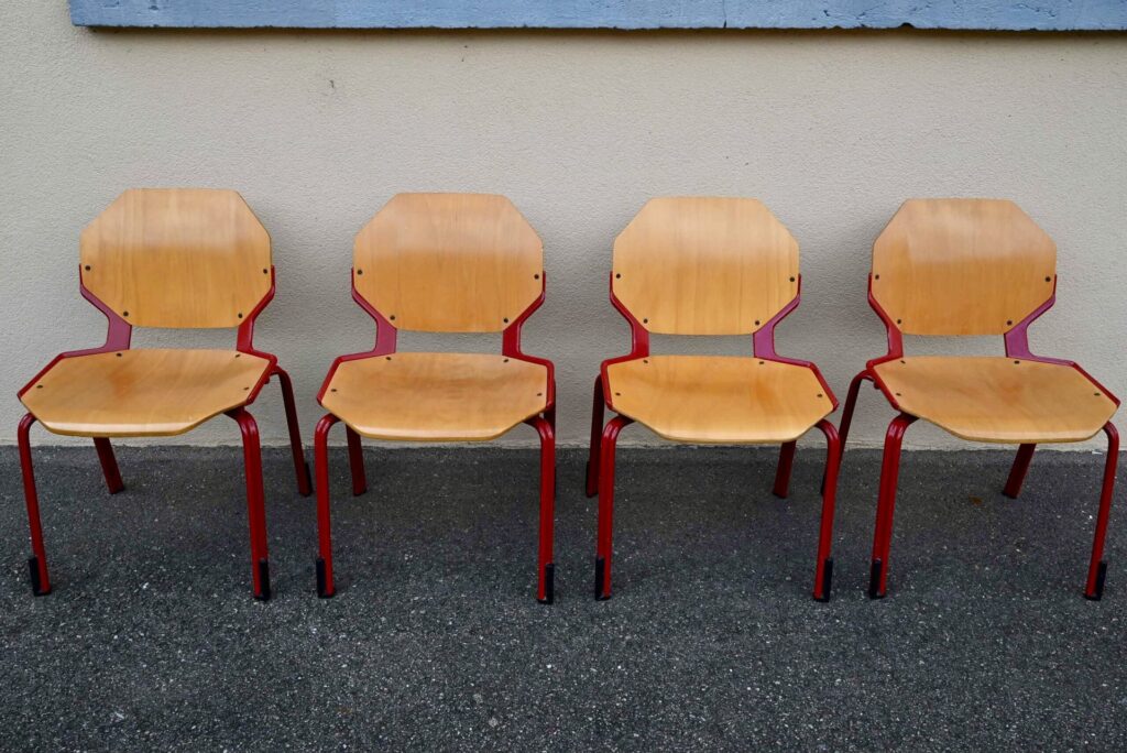 Cette série de 34 chaises design, modèle Rio, a été éditée par Fröscher GmBH dans les années 80. Elles incarnent le style postmoderne des années 80 avec leur esthétique fonctionnelle et leurs formes géométriques iconiques. La structure est réalisée en métal émaillé d’un rouge vif, offrant un contraste marqué avec l’assise et le dossier en contreplaqué thermoformé de couleur bois clair. Le design se caractérise par des formes octogonales pour le dossier et l’assise, conférant à chaque chaise une silhouette unique et reconnaissable. Ces chaises sont empilables, ce qui témoigne de leur conception pratique et de leur grande qualité de fabrication allemande.