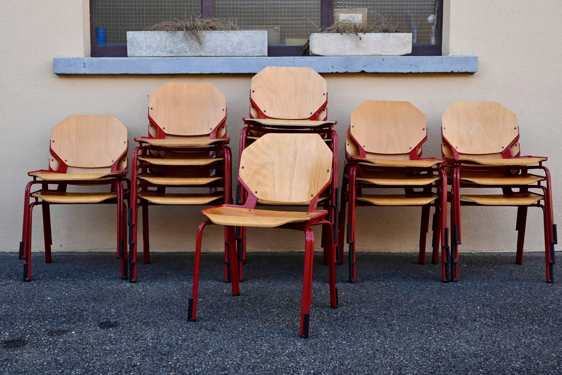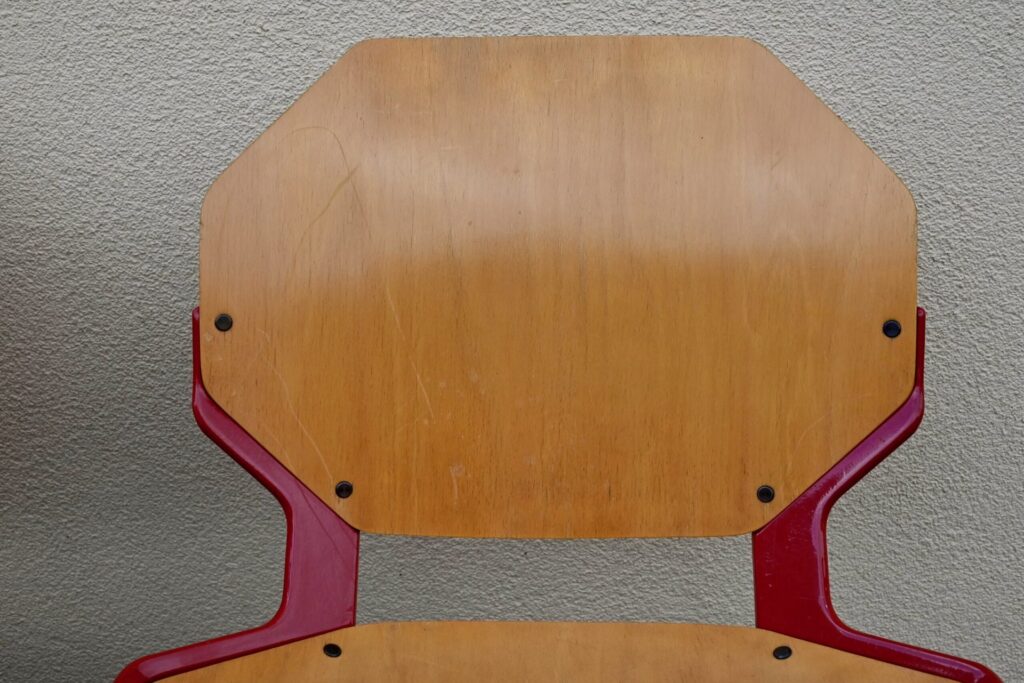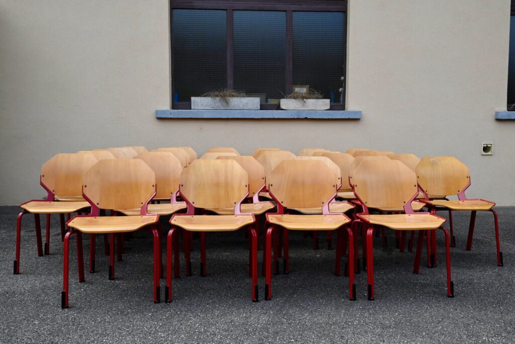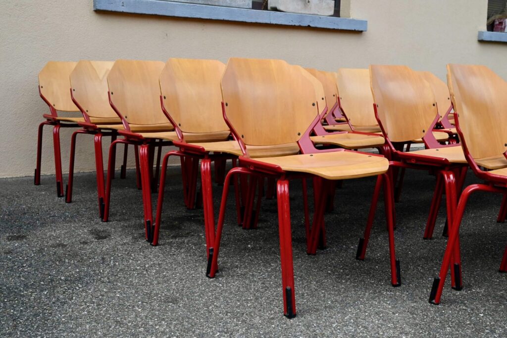Cette série de 34 chaises design, modèle Rio, a été éditée par Fröscher GmBH dans les années 80. Elles incarnent le style postmoderne des années 80 avec leur esthétique fonctionnelle et leurs formes géométriques iconiques. La structure est réalisée en métal émaillé d’un rouge vif, offrant un contraste marqué avec l’assise et le dossier en contreplaqué thermoformé de couleur bois clair. Le design se caractérise par des formes octogonales pour le dossier et l’assise, conférant à chaque chaise une silhouette unique et reconnaissable. Ces chaises sont empilables, ce qui témoigne de leur conception pratique et de leur grande qualité de fabrication allemande.