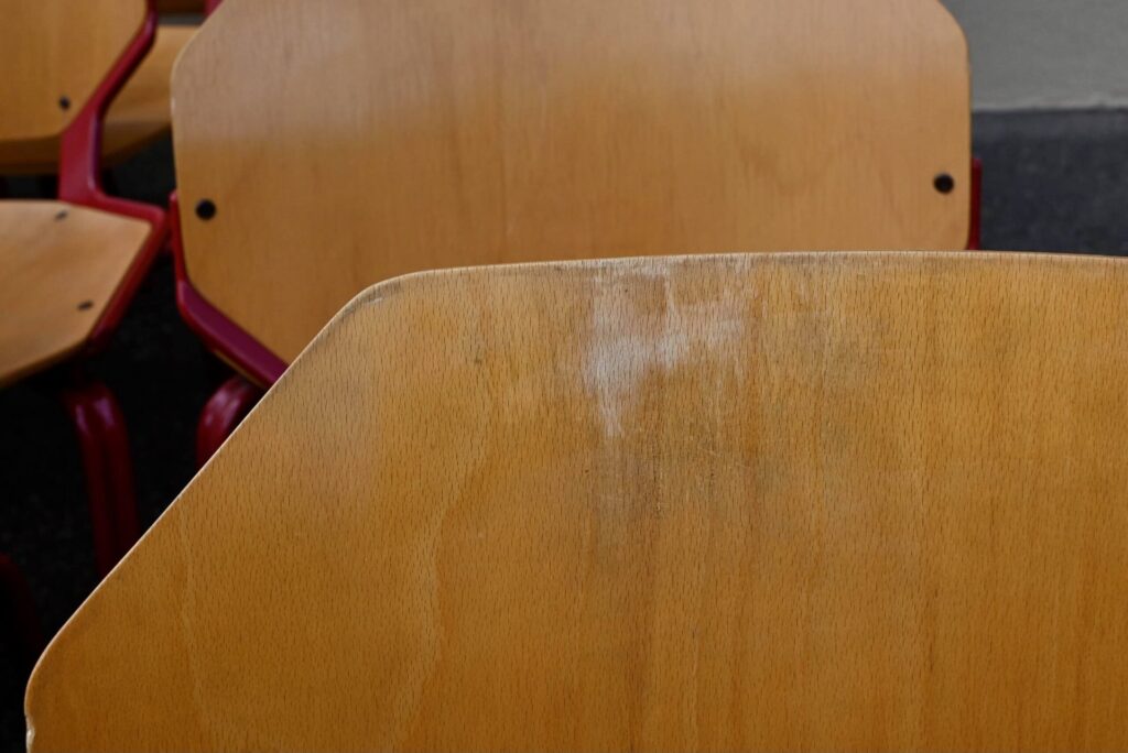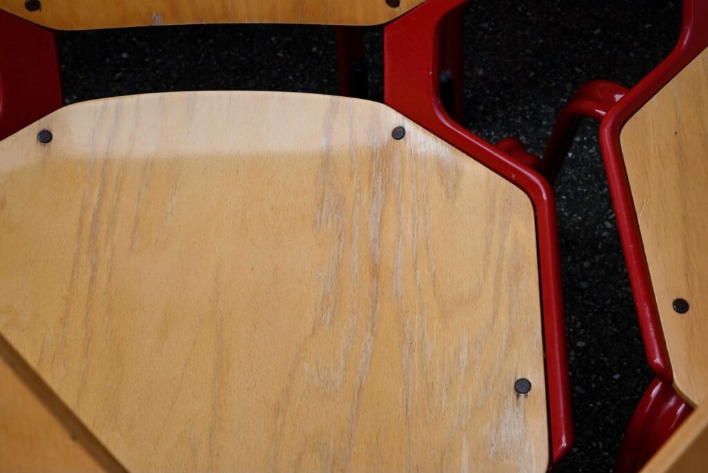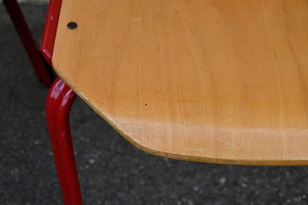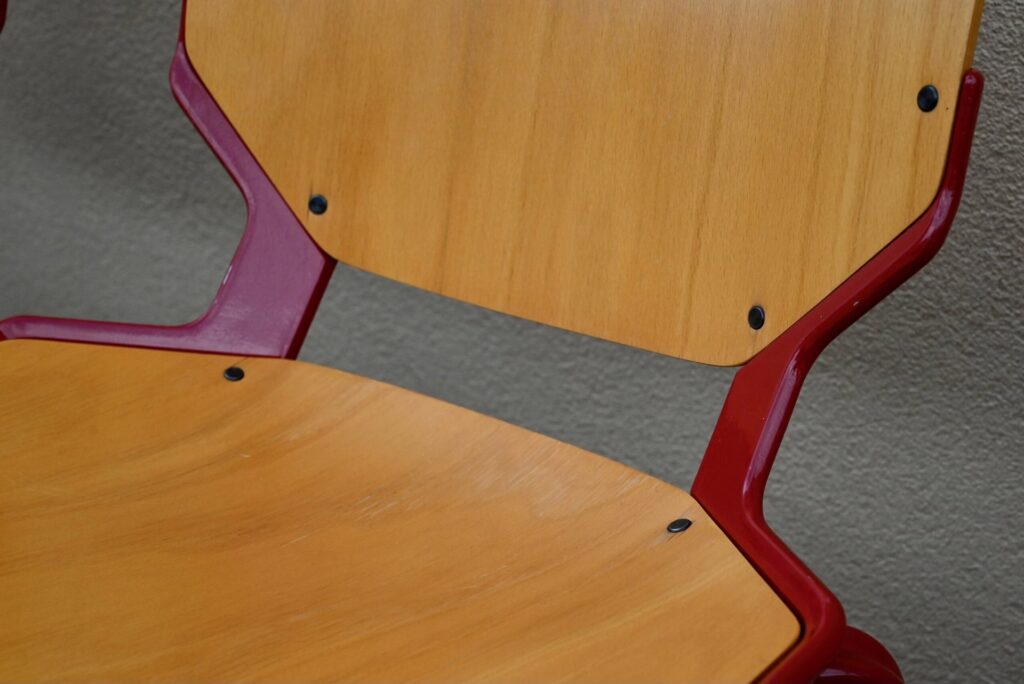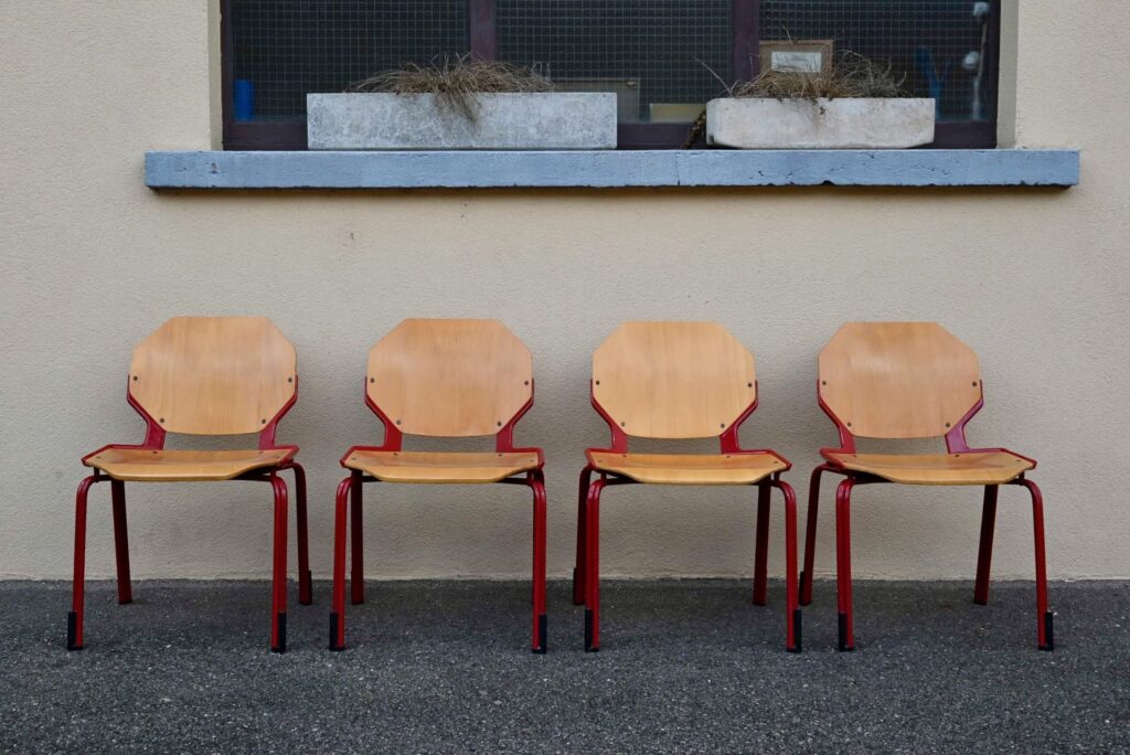 Chaque chaise porte l’étiquette du fabricant “FRÖSCHER STIFTFORM” ainsi qu’une étiquette de commande attestant de leur production en 1985. L’ensemble présente des traces d’usage légères, conformes à son âge et à son utilisation, visibles sur les surfaces en bois et la peinture émaillée. C’est un ensemble peu courant et de belle qualité, notamment pour une utilisation intensive.