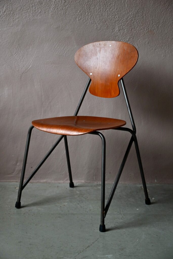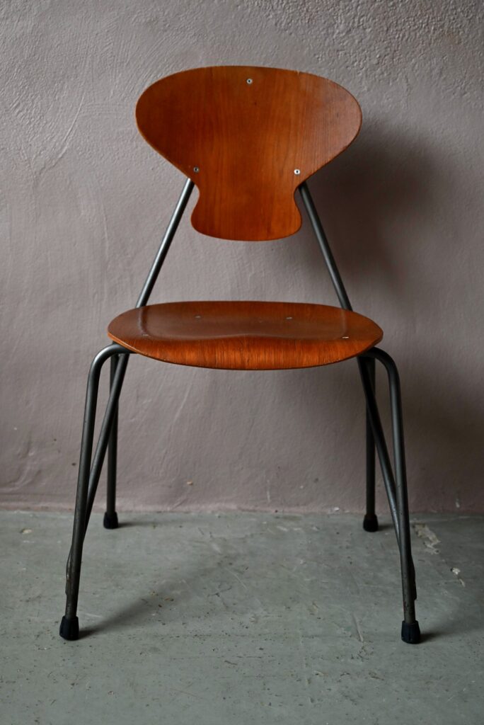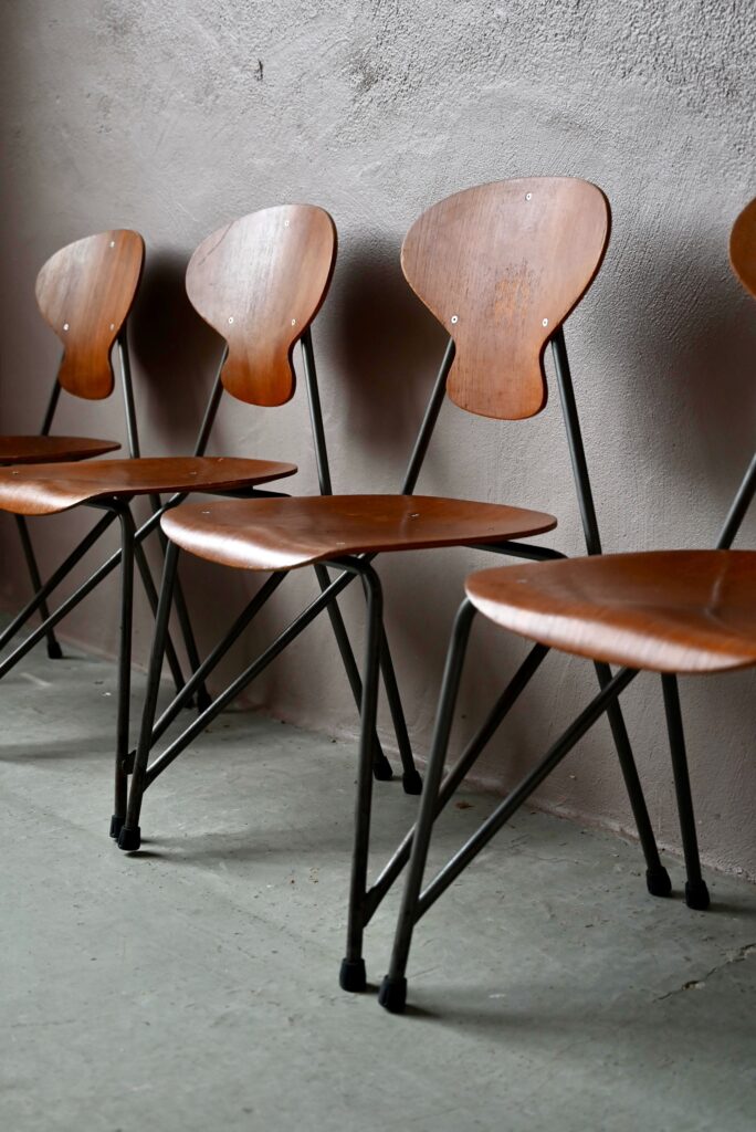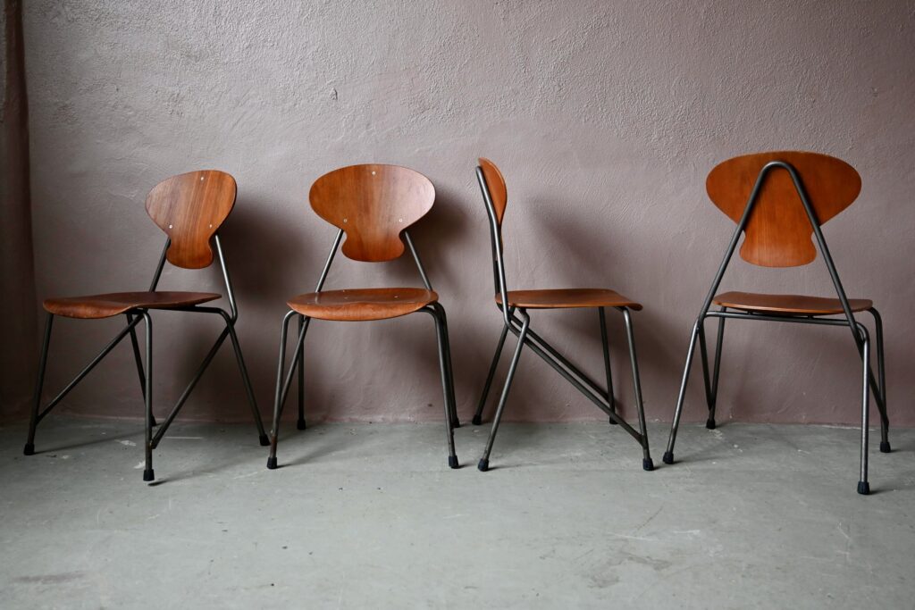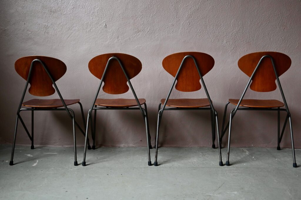 Ces chaises tubulaires sont une superbe réalisation des designers danois Steen Eiler Rasmussen & Kai Lyngfeldt Larsen. Éditées par Danbork, ces chaises des années 50 affichent un dessin tout à la fois épuré, léger et empli d’une certaine douceur. La structure est en métal tubulaire gris foncé patiné, proposant des lignes architecturales. Ce fin dessin de la structure met en évidence la teinte chaleureuse du contreplaqué de teck, et le dessin pas commun du dossier. Dans un esprit scandinave organique et minimaliste, proche de la matière, ces chaises midcentury danoises allient originalité et pureté des lignes.