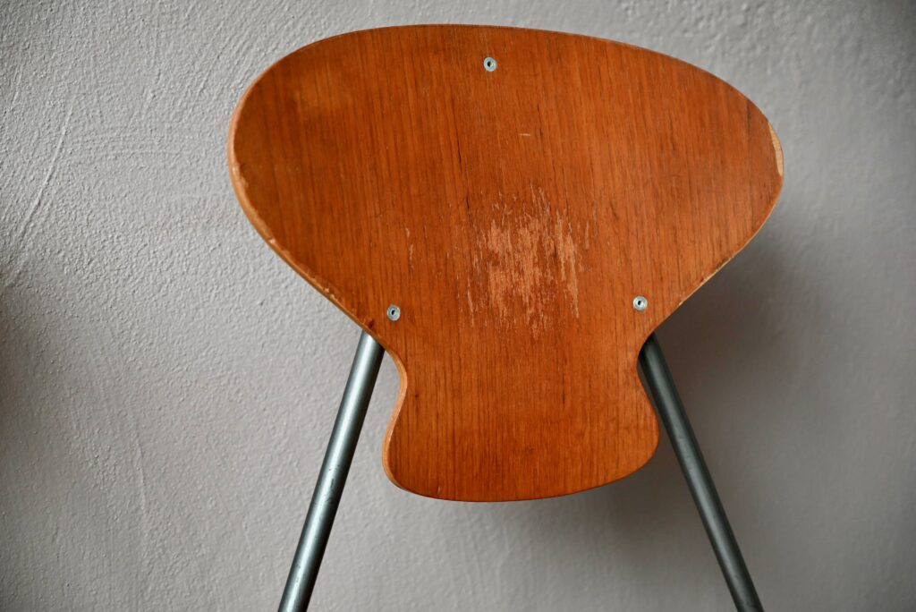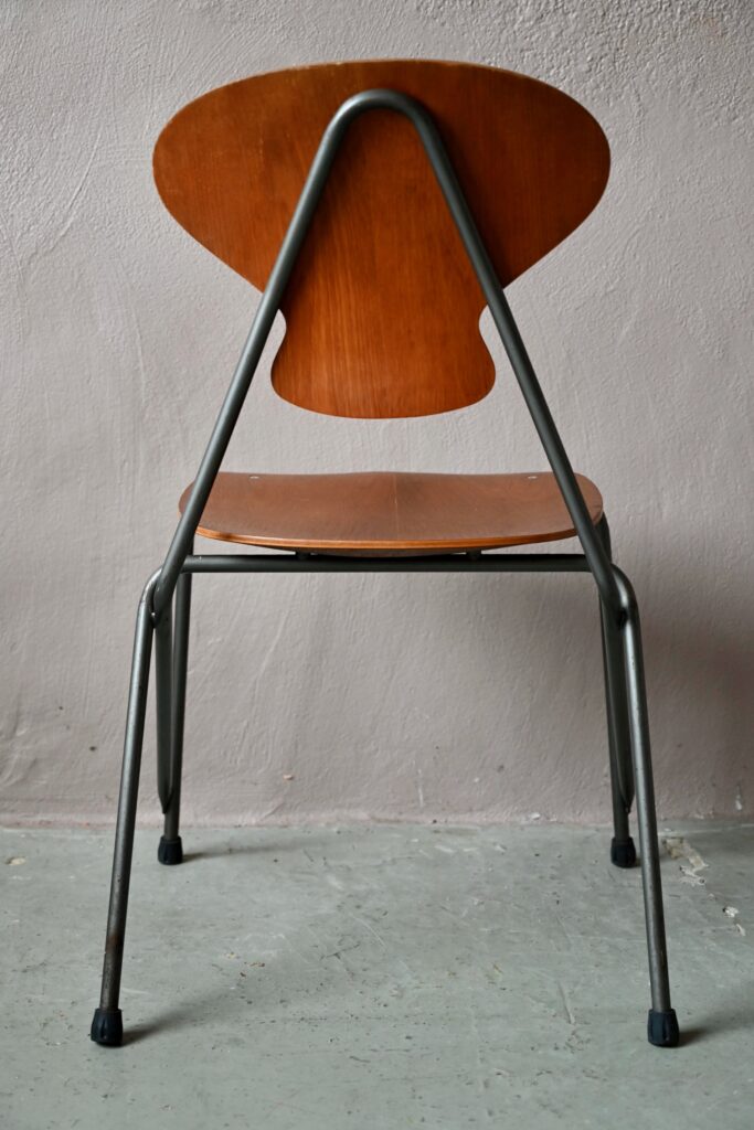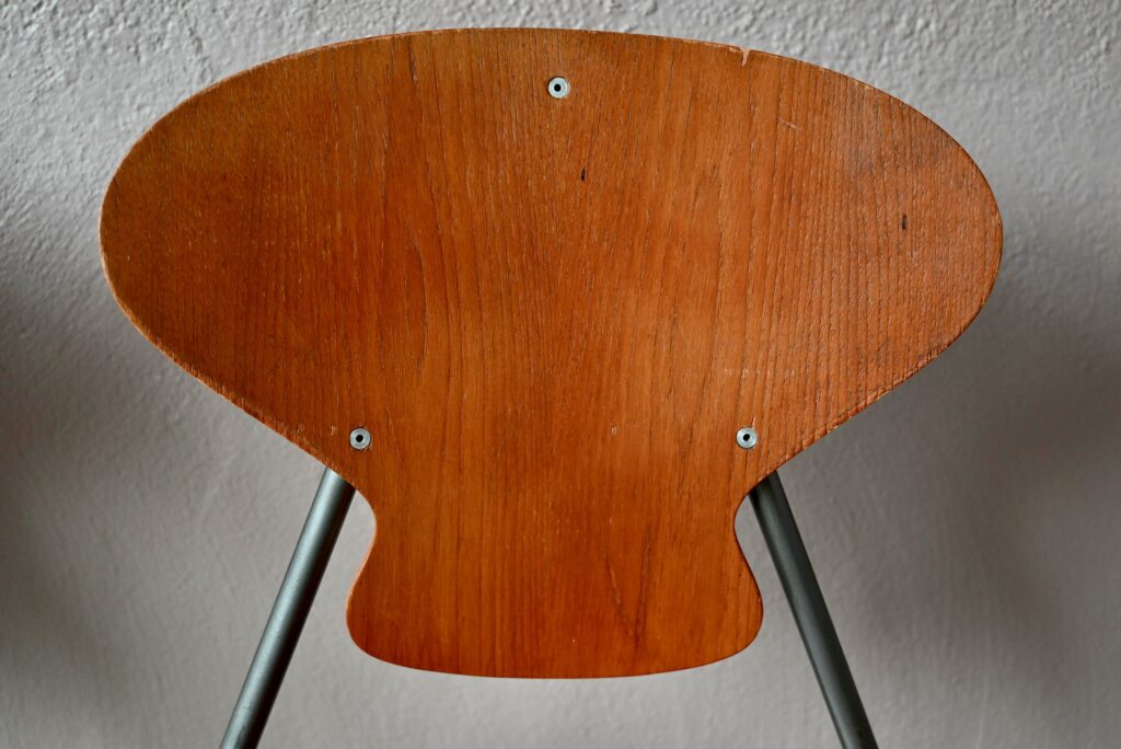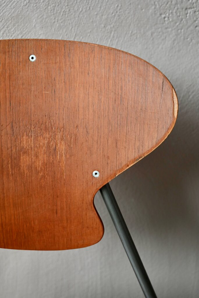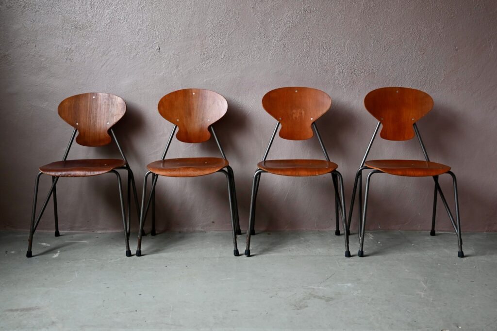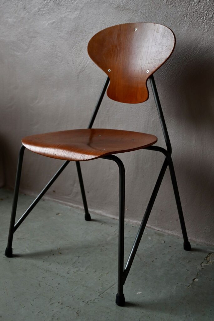 Ces chaises tubulaires sont une superbe réalisation des designers danois Steen Eiler Rasmussen & Kai Lyngfeldt Larsen. Éditées par Danbork, ces chaises des années 50 affichent un dessin tout à la fois épuré, léger et empli d’une certaine douceur. La structure est en métal tubulaire gris foncé patiné, proposant des lignes architecturales. Ce fin dessin de la structure met en évidence la teinte chaleureuse du contreplaqué de teck, et le dessin pas commun du dossier. Dans un esprit scandinave organique et minimaliste, proche de la matière, ces chaises midcentury danoises allient originalité et pureté des lignes.