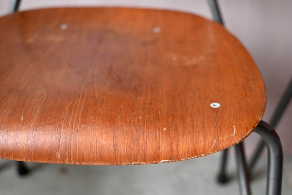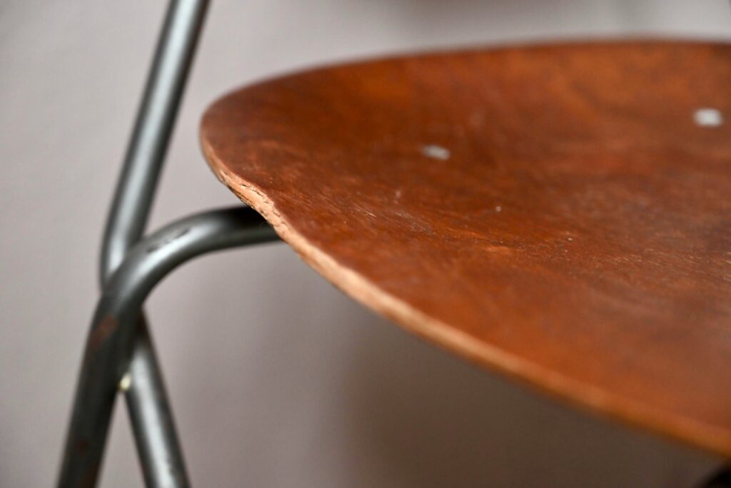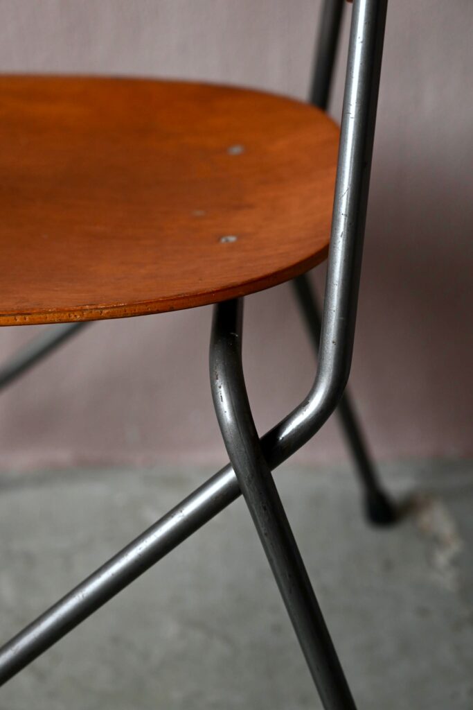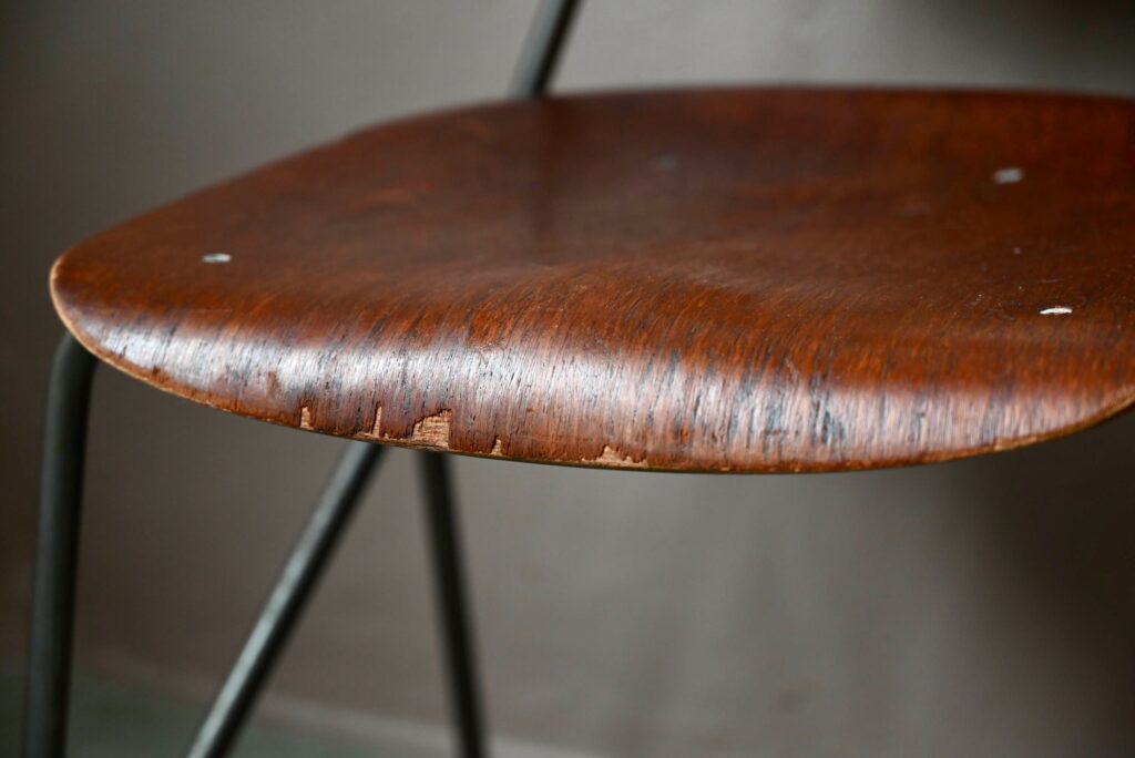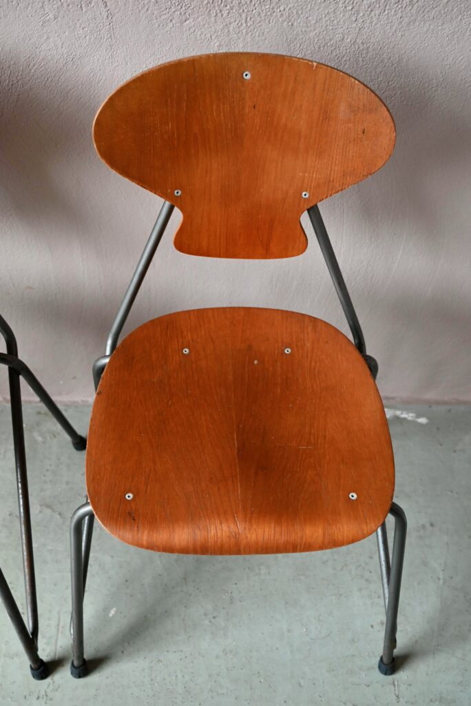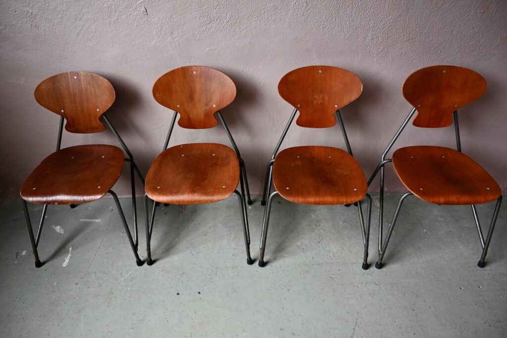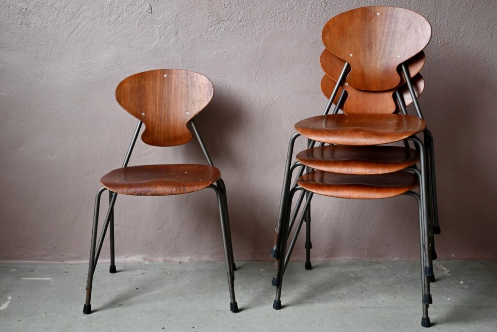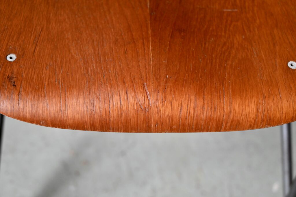 Les chaises datent des années 50, et ont été fabriquées au Danemark. Elles ont été dessinées par Steen Eiler Rasmussen Kai Lyngfeldt Larsen pour Danbork. Assises et dossiers sont en contrecollé de teck teinte profonde et patinée. La structure est en métal tubulaire. Des traces d’usage et une jolie patine sont visibles en photo. De petits manques de placage sont présents sur le contrecollé. Les chaises sont en bel état et de belle facture. Le design est très original. Ces chaises ne sont pas courantes. Les chaises sont légères et empilables. Elles sont signées sous l’assise.