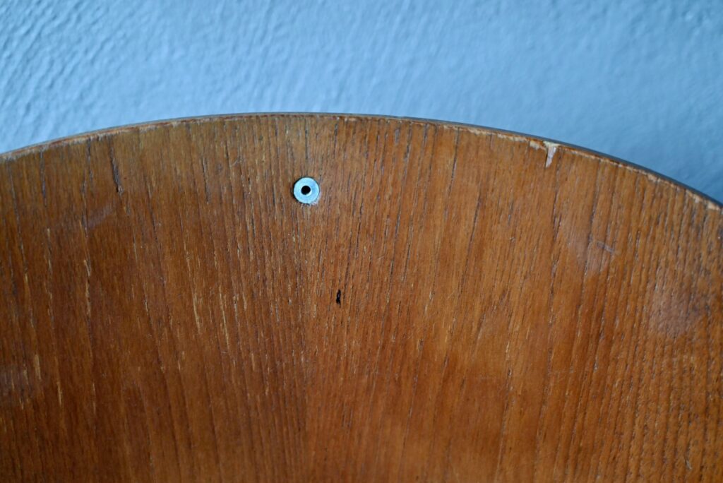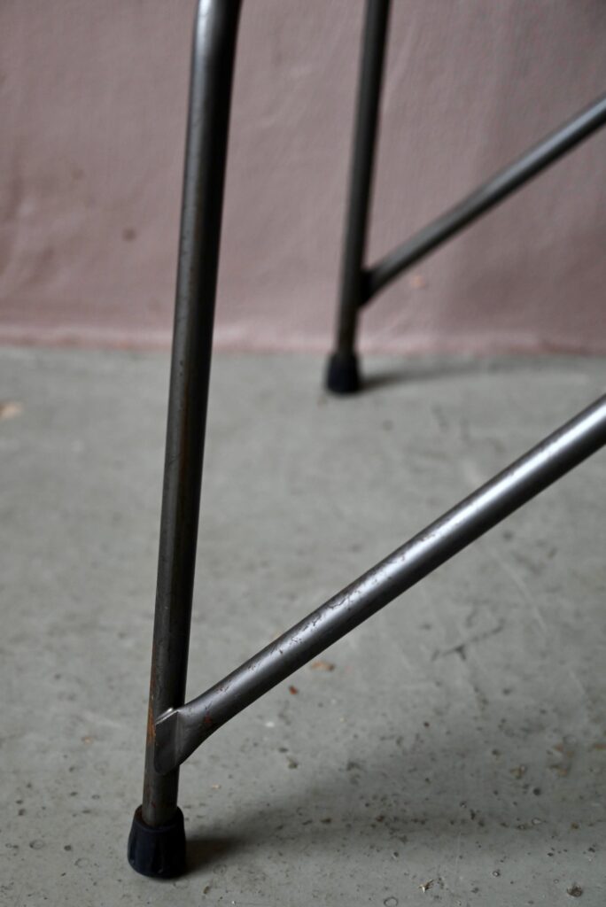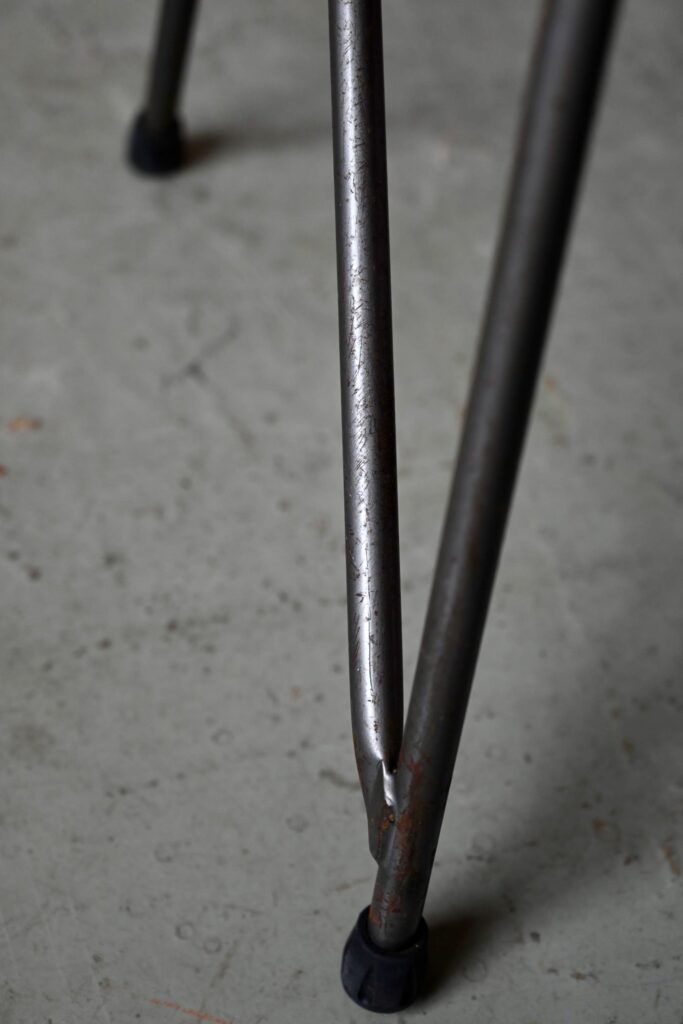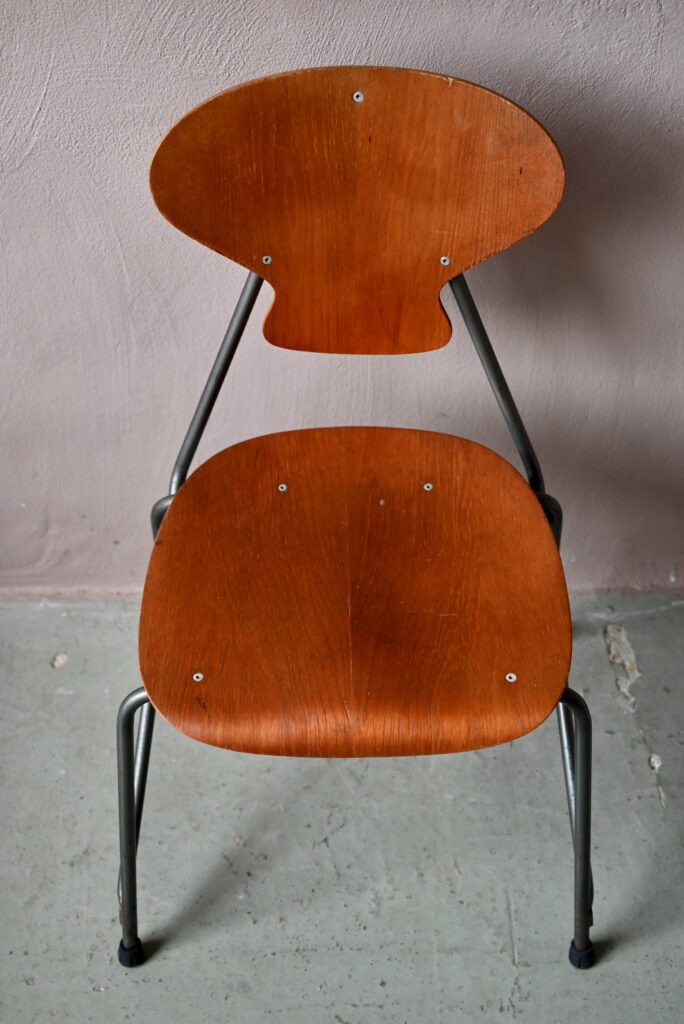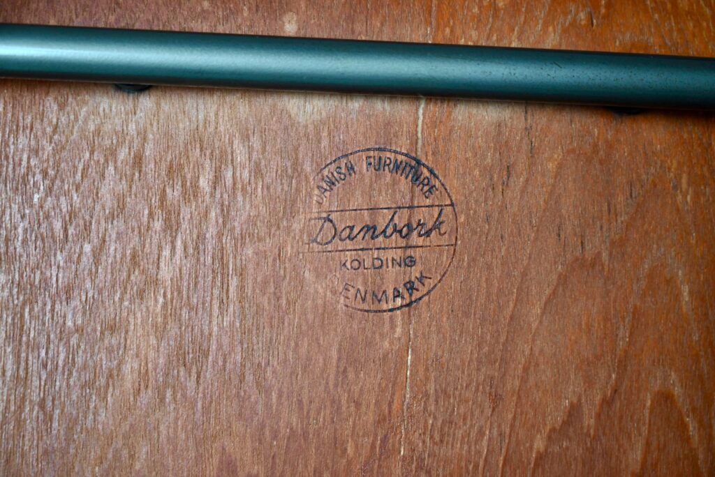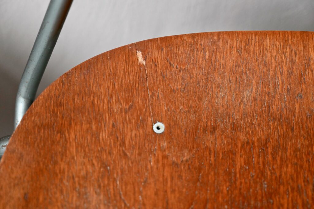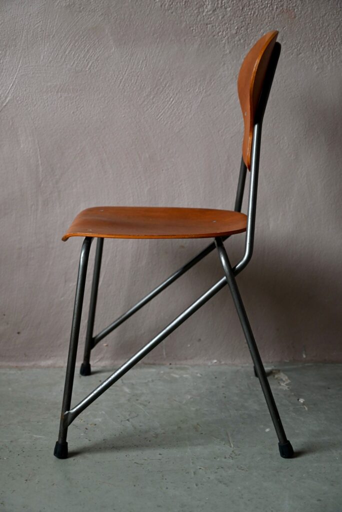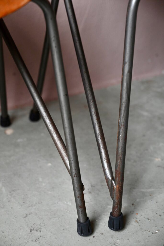 Les chaises datent des années 50, et ont été fabriquées au Danemark. Elles ont été dessinées par Steen Eiler Rasmussen Kai Lyngfeldt Larsen pour Danbork. Assises et dossiers sont en contrecollé de teck teinte profonde et patinée. La structure est en métal tubulaire. Des traces d’usage et une jolie patine sont visibles en photo. De petits manques de placage sont présents sur le contrecollé. Les chaises sont en bel état et de belle facture. Le design est très original. Ces chaises ne sont pas courantes. Les chaises sont légères et empilables. Elles sont signées sous l’assise.