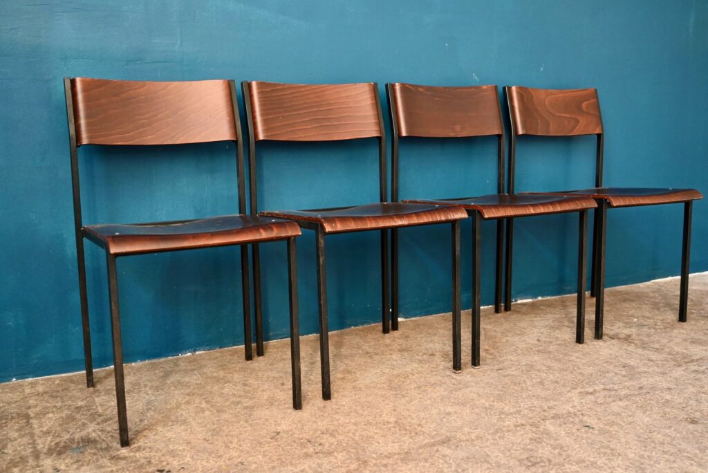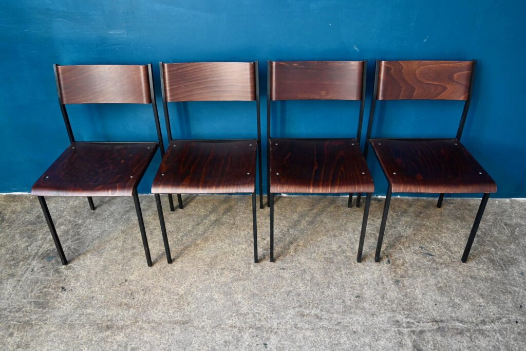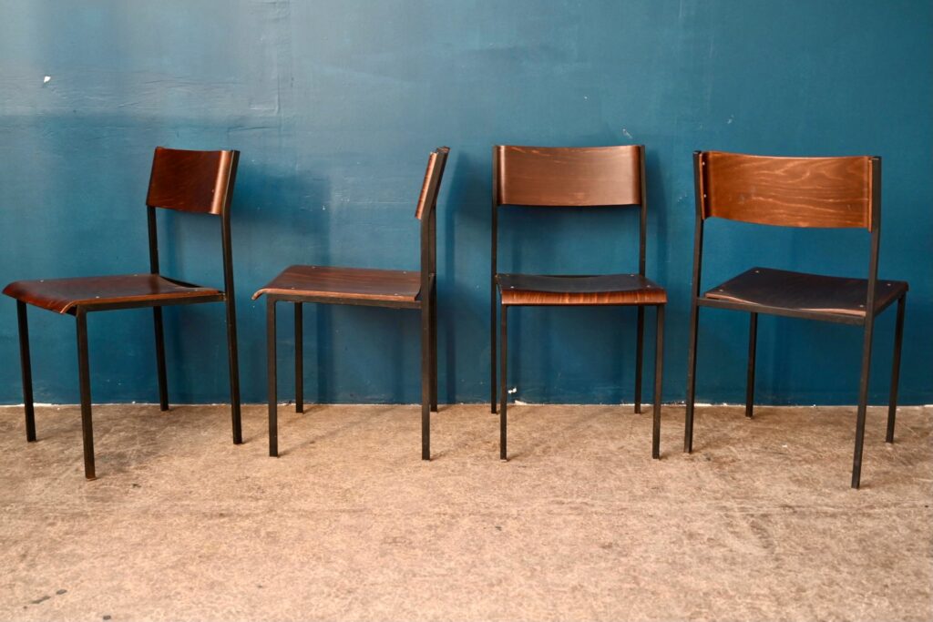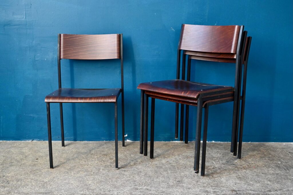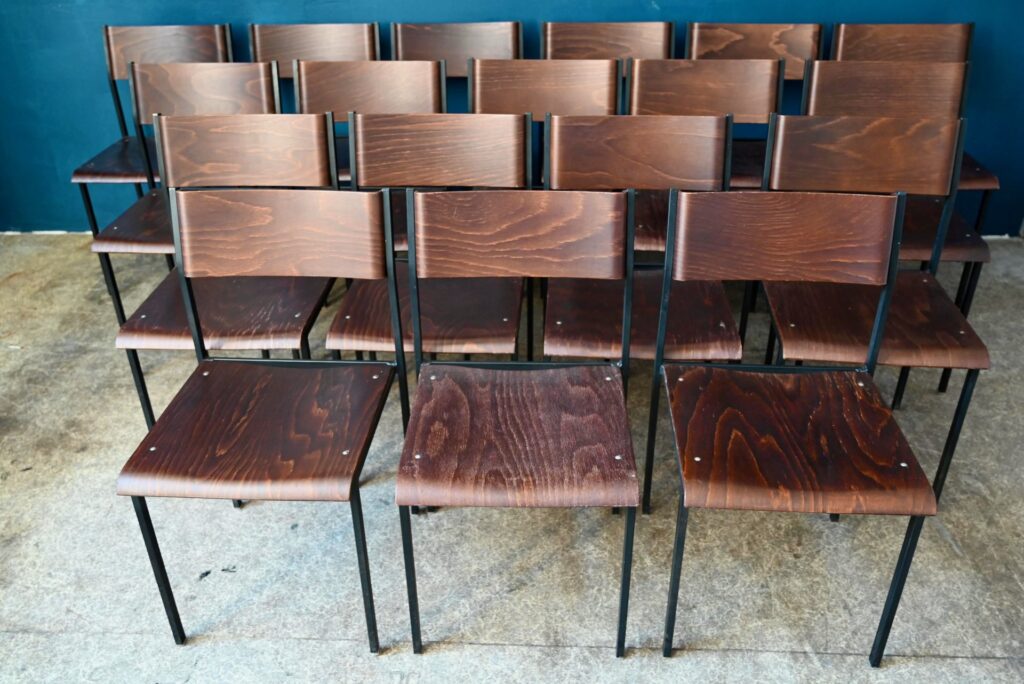 Cette belle série de chaises date des années 70. Le piétement minimaliste est en métal noir. Il est légèrement oxydé visible en photo. Des patins sont présents. L’assise et le dossier sont en bois contrecollé et thermoformé, résistant et très confortable. Quelques traces et tâches d’usage sont à noter. L’ensemble est en bel état. Certaines chaises sont estampillées “Hiller” sous l’assise. Les chaises sont empilables. Le prix indiqué est pour la série de 50 chaises.