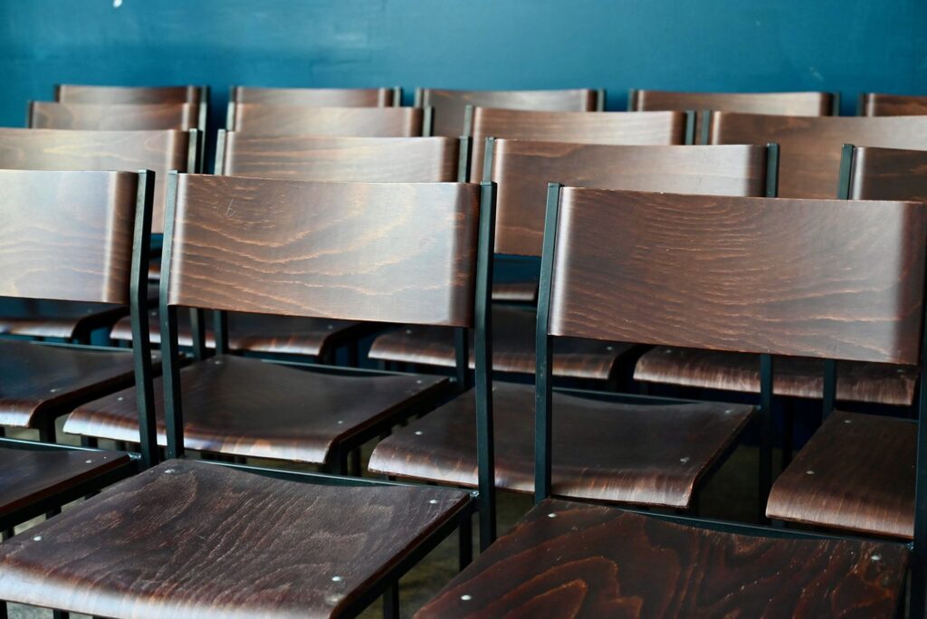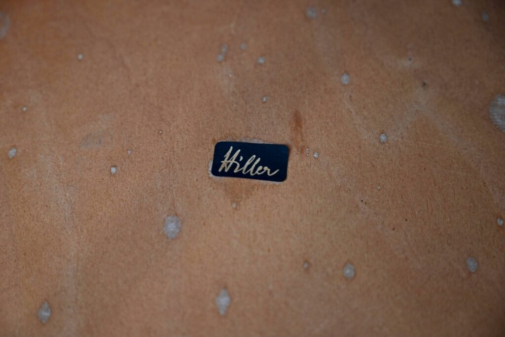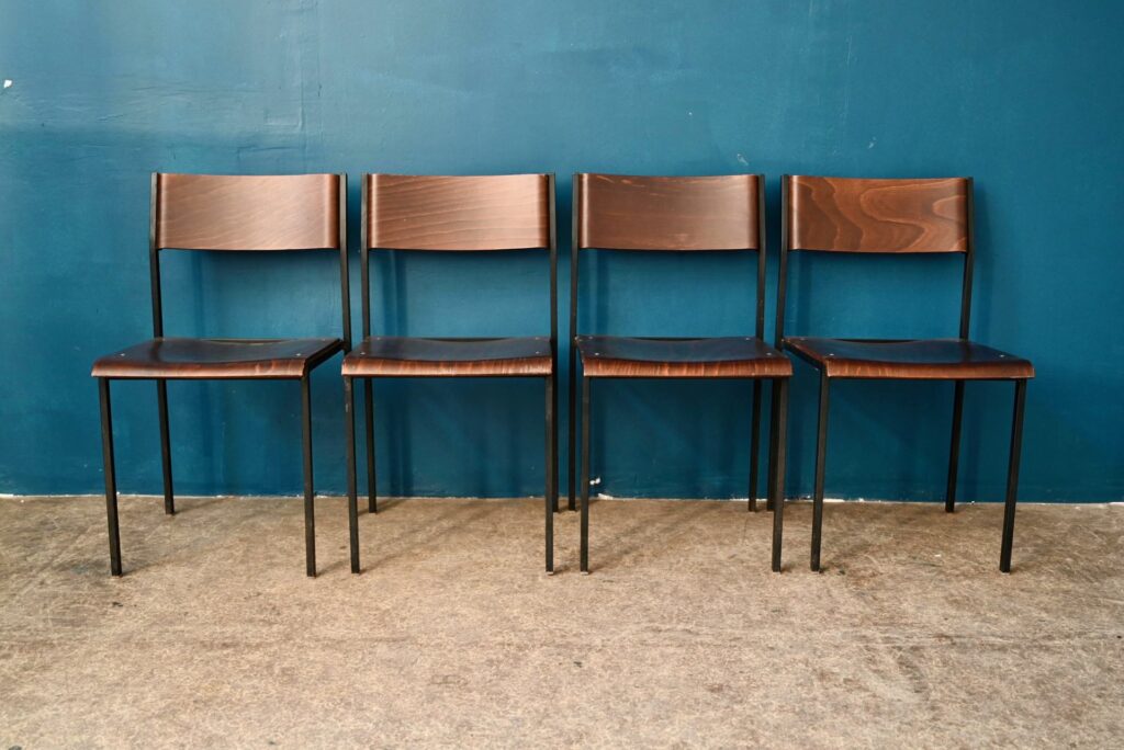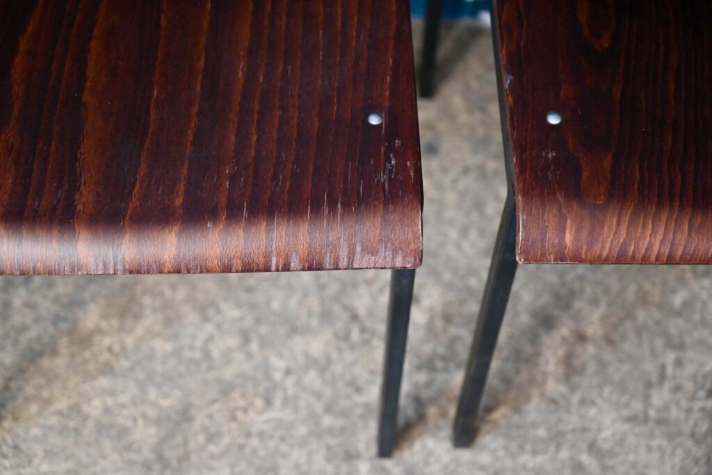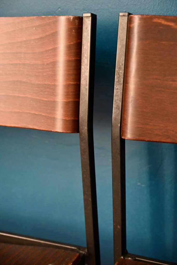 Cette belle série de chaises date des années 70. Le piétement minimaliste est en métal noir. Il est légèrement oxydé visible en photo. Des patins sont présents. L’assise et le dossier sont en bois contrecollé et thermoformé, résistant et très confortable. Quelques traces et tâches d’usage sont à noter. L’ensemble est en bel état. Certaines chaises sont estampillées “Hiller” sous l’assise. Les chaises sont empilables. Le prix indiqué est pour la série de 50 chaises.