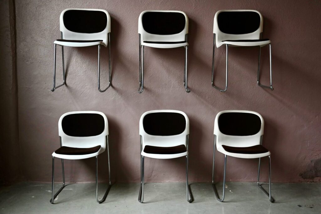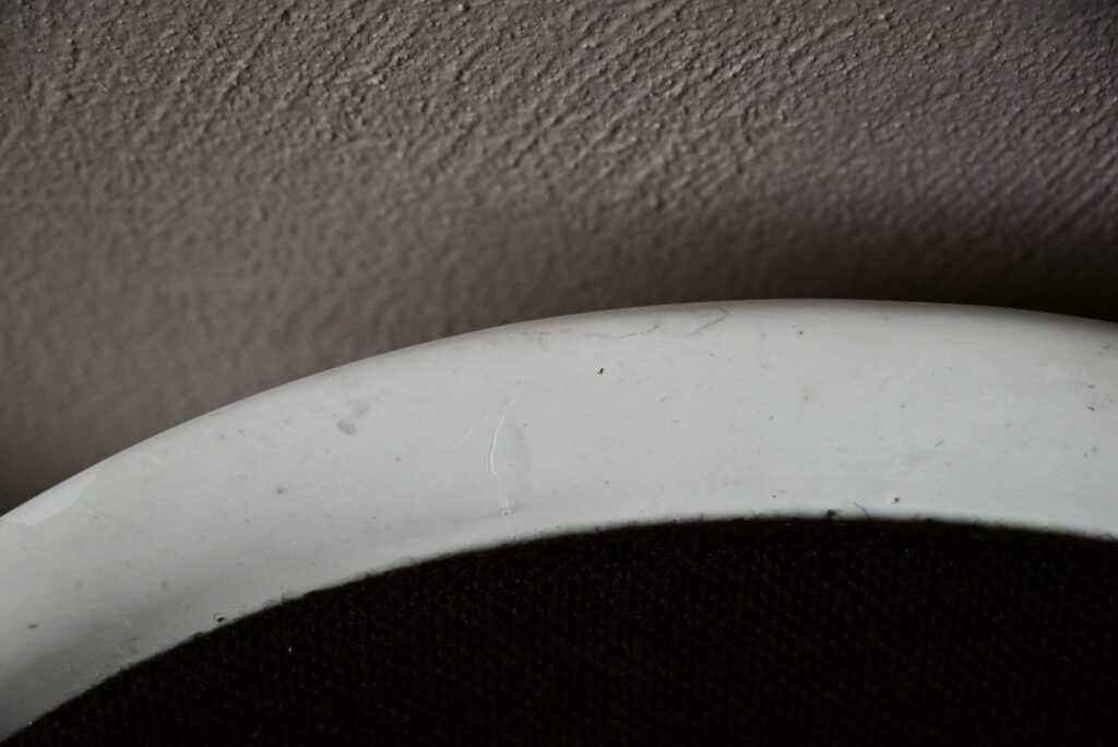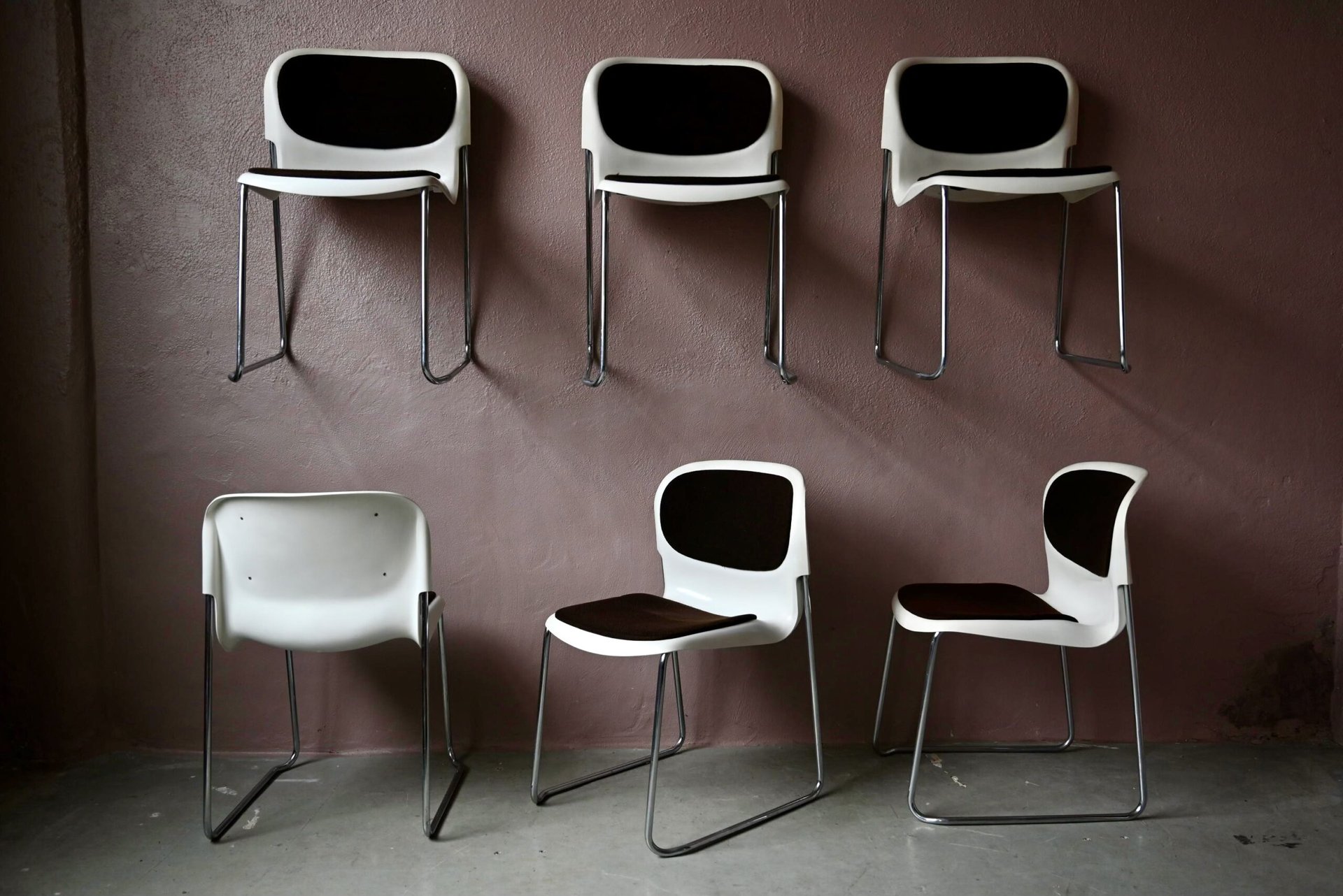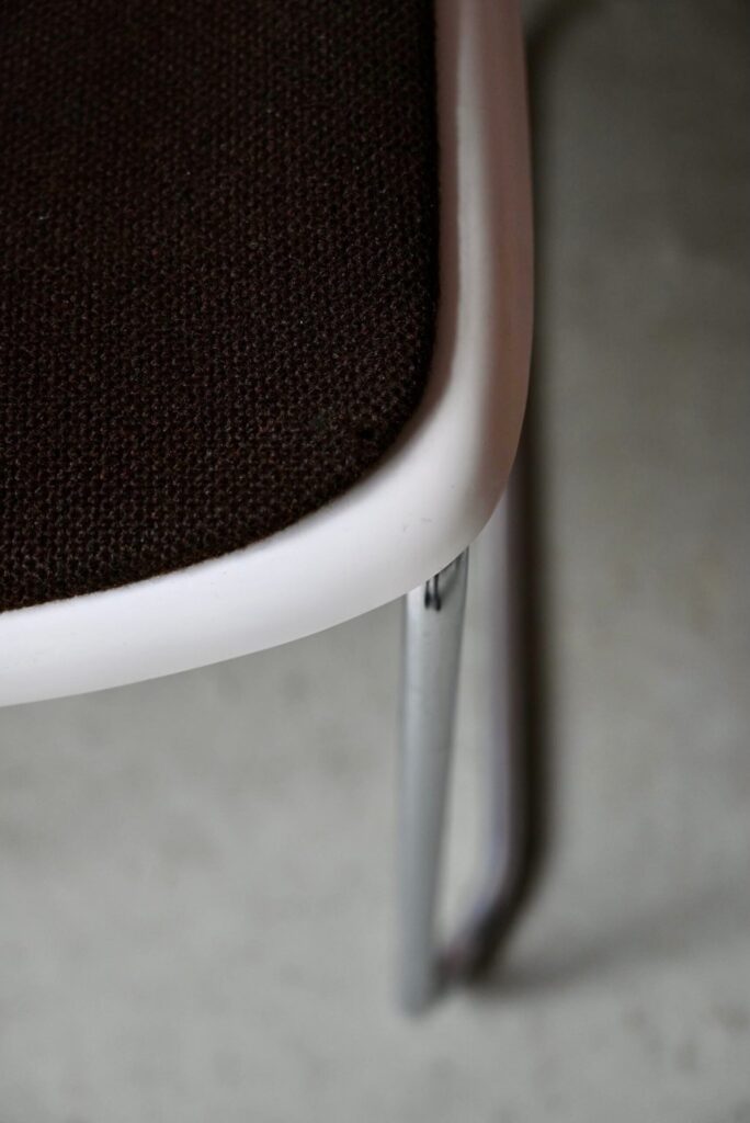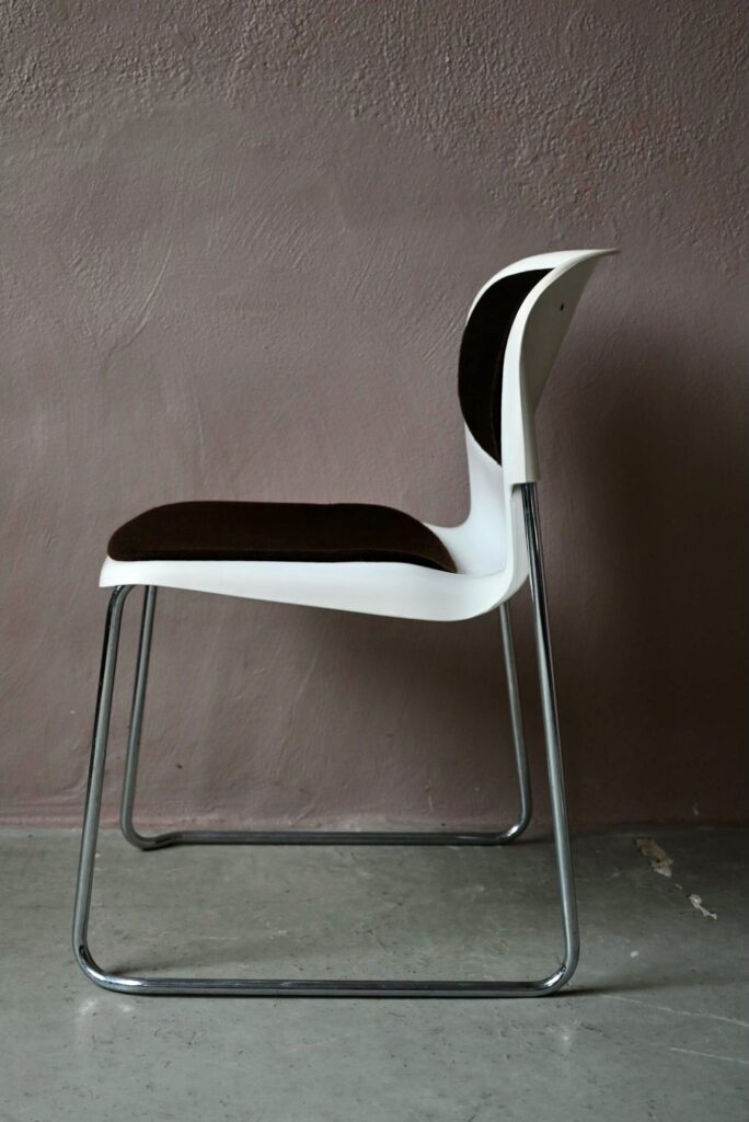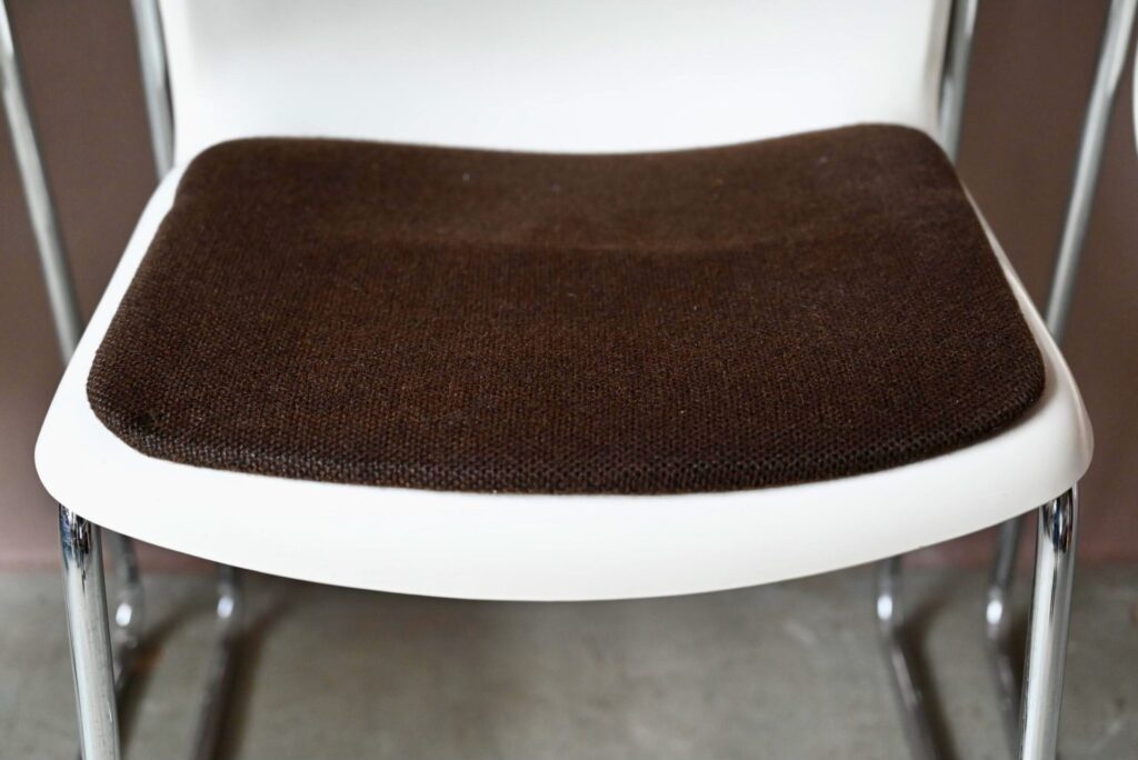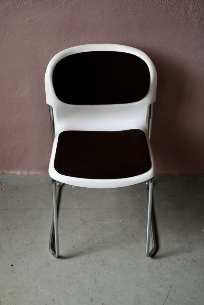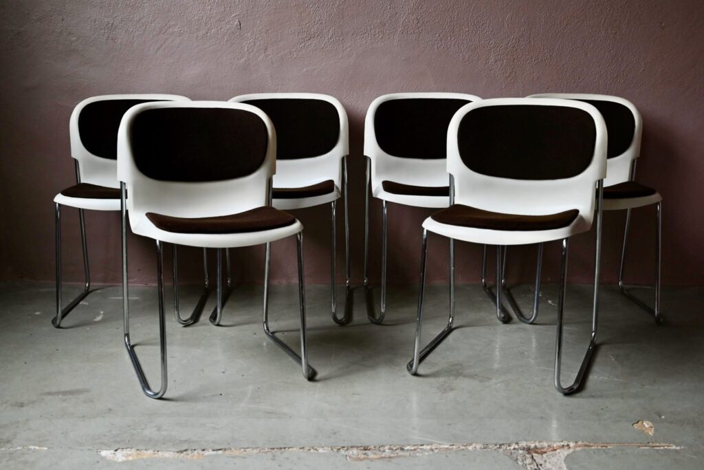 La série est composée de 6 chaises, elles datent des années 80. C’est une production West-Germany estampillée Gerd Lange sous les assises. Les chaises sont en bel état. Le plastique blanc présente quelques traces d’usage visibles en photo. Le lainage marron a été nettoyé, quelques traces d’usage discrètes demeurent, un petit accroc est visible en photo. L’ensemble est empilable, faciles à manipuler et en très bon état. Le prix est pour la série de 6 chaises.