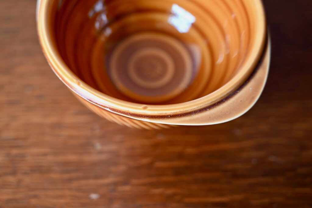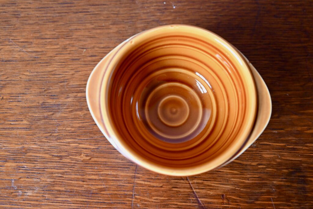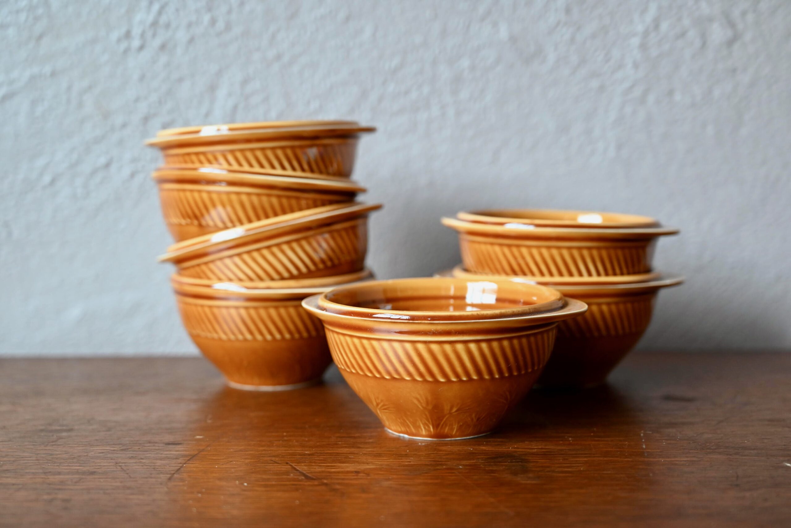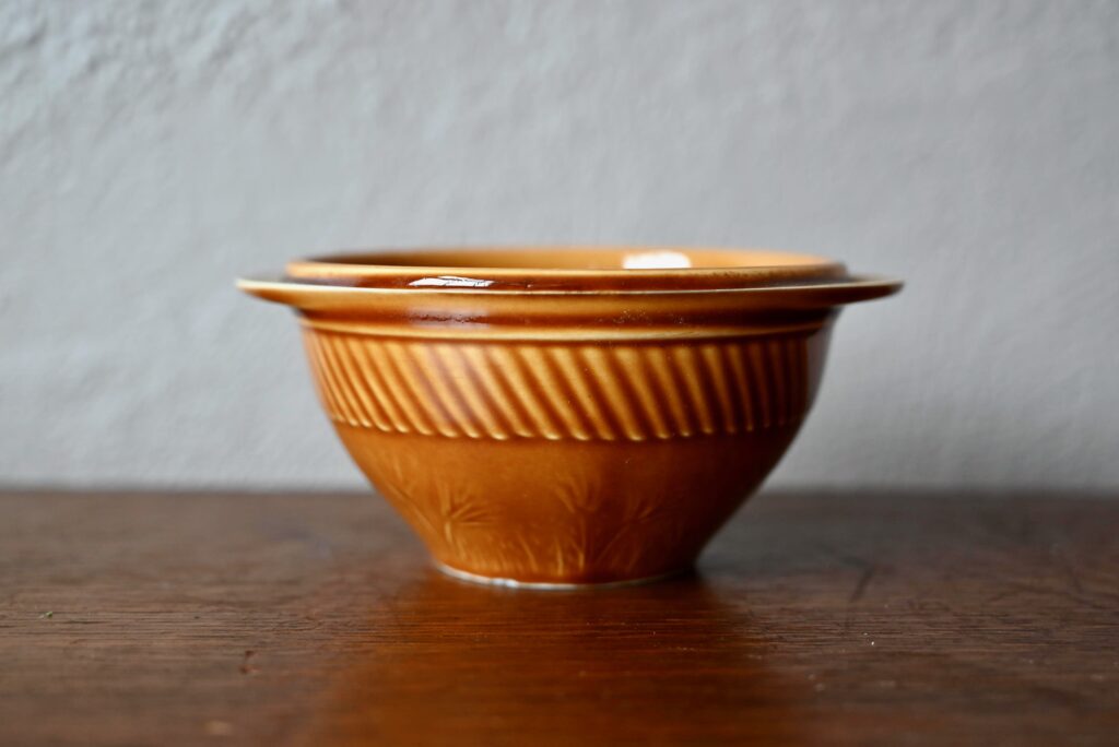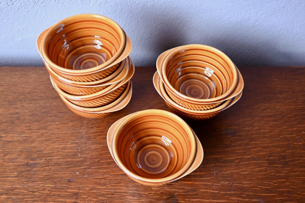 On imagine ces bols rétro de couleur “brune brillante”dans une cuisine à la décoration bohème. En céramique, c’est une production midcentury de la faïencerie lorraine de Sarreguemines.