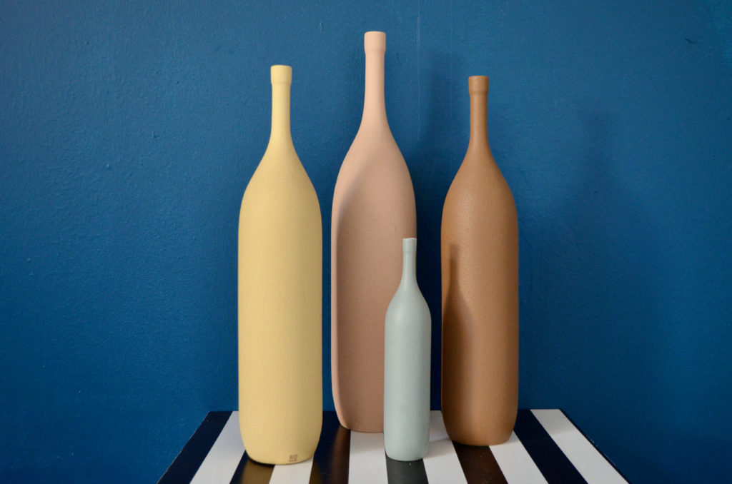 Grande, colorée, texturée et spectaculairement décorative, cette magnifique série de vases se prête à toutes les compositions ornementales. De production italienne, ils sont réalisés en céramique dans des teintes tendres et pastels. Les vases prennent la forme de grandes bouteilles à la silhouette allongée. La céramique possède une surface agréable au toucher, délicatement texturée et poudrée. La série, constituée de 4 pièces, est démonstrative, d’une belle présence et prestance. Objets de décoration marquants, les céramiques seront mises en valeur sur une grande enfilade au design exigeant.