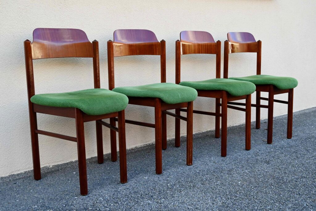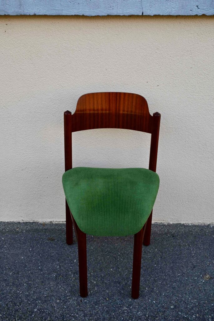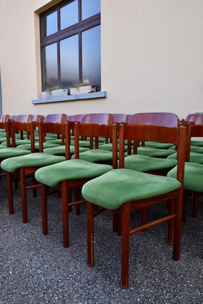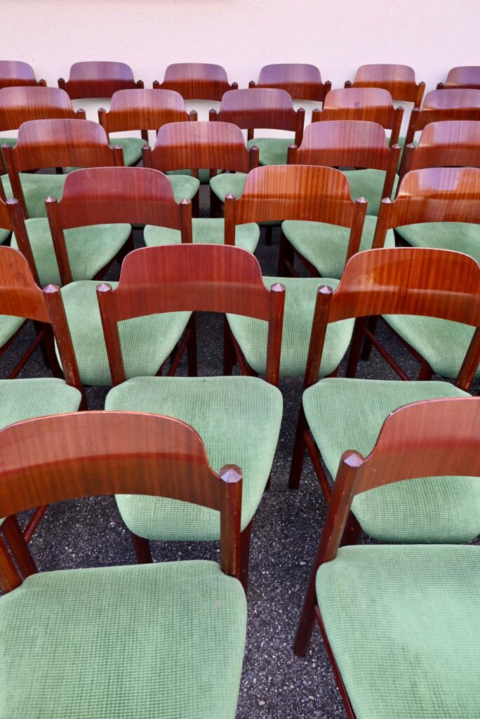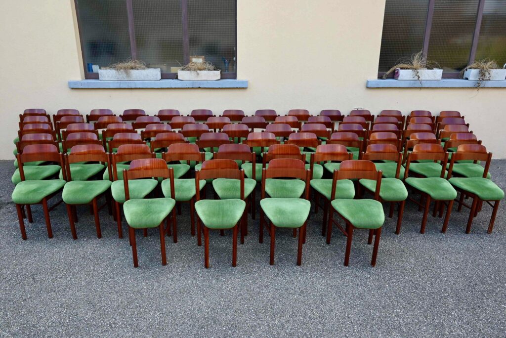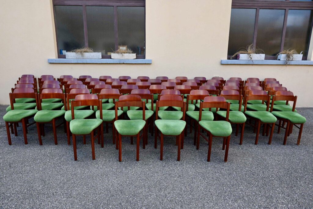 La structure des chaises est en bois massif, du hêtre de teinte teck profonde. Le dossier est en contreplaqué courbe. Les assises sont épaisses, couvertes d’un tissu velours vert très propre. De forme particulière, les pieds avant sont resserrés et portent donc une assise de forme effilée. Elles sont en bon état, confortables et stables, en plus d’être très originales. Le prix est pour 20 chaises. Nous disposons d’un grand nombre de chaises de ce modèle, un lot personnalisable est constituable sur simple demande.