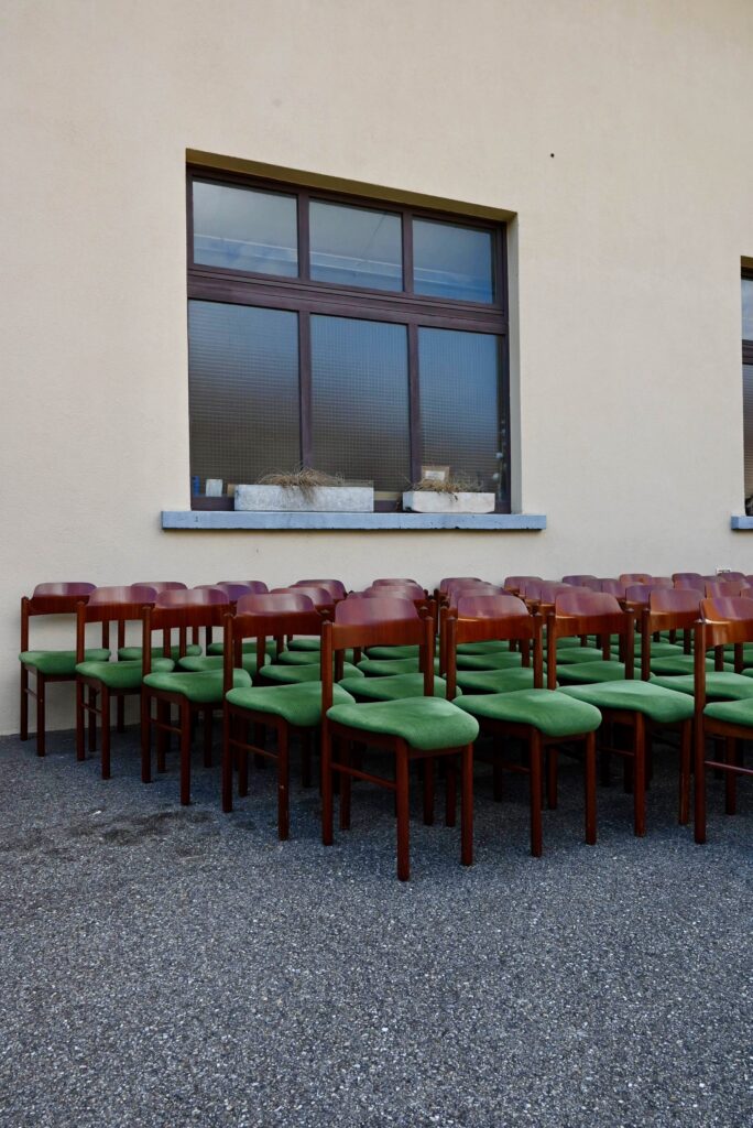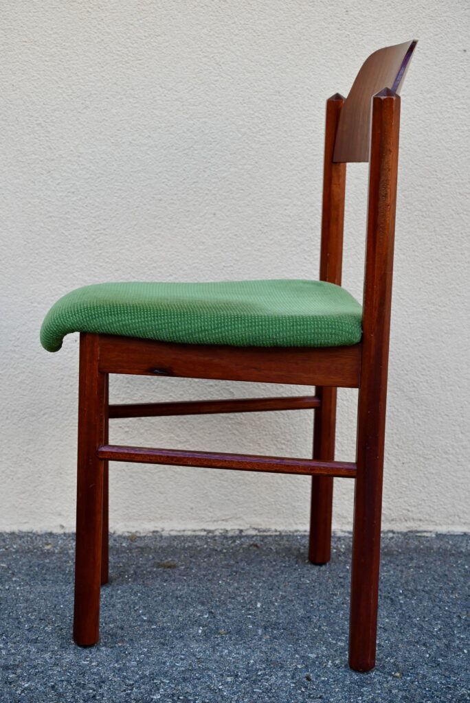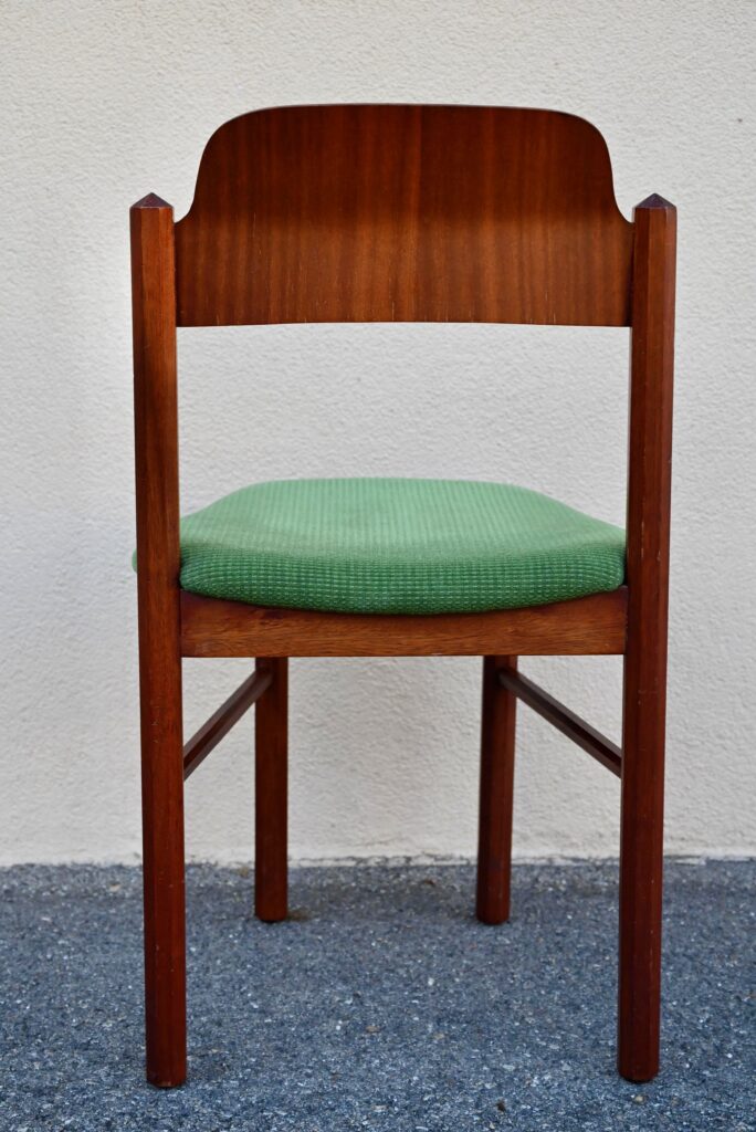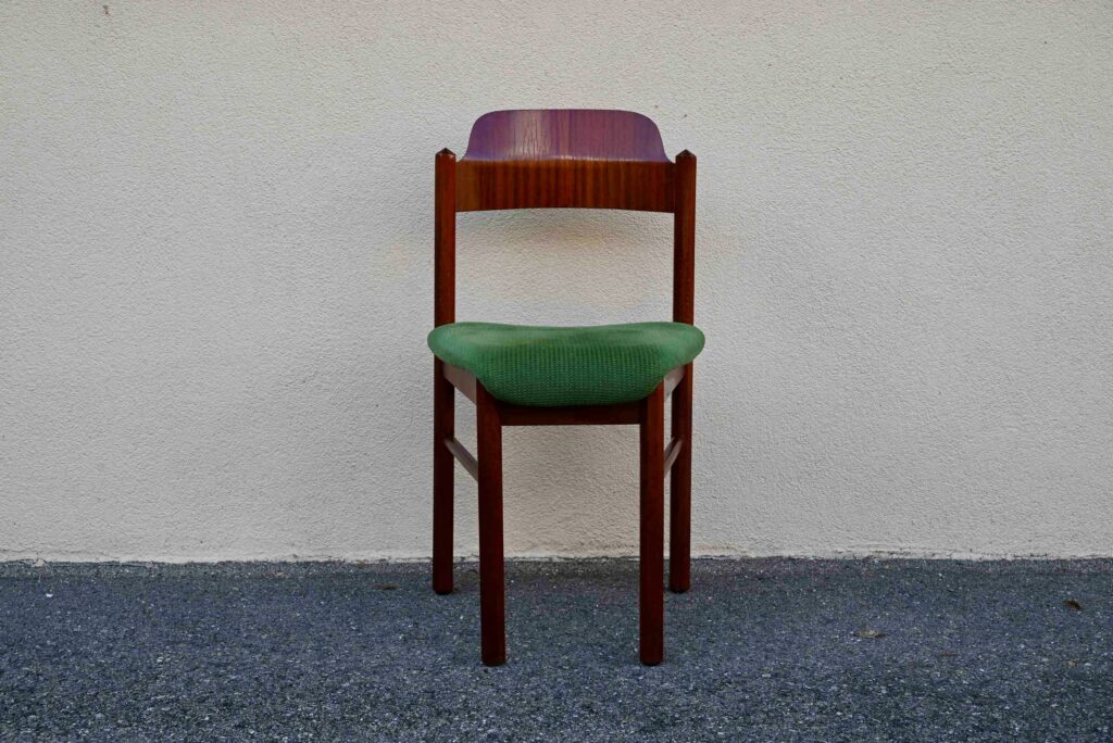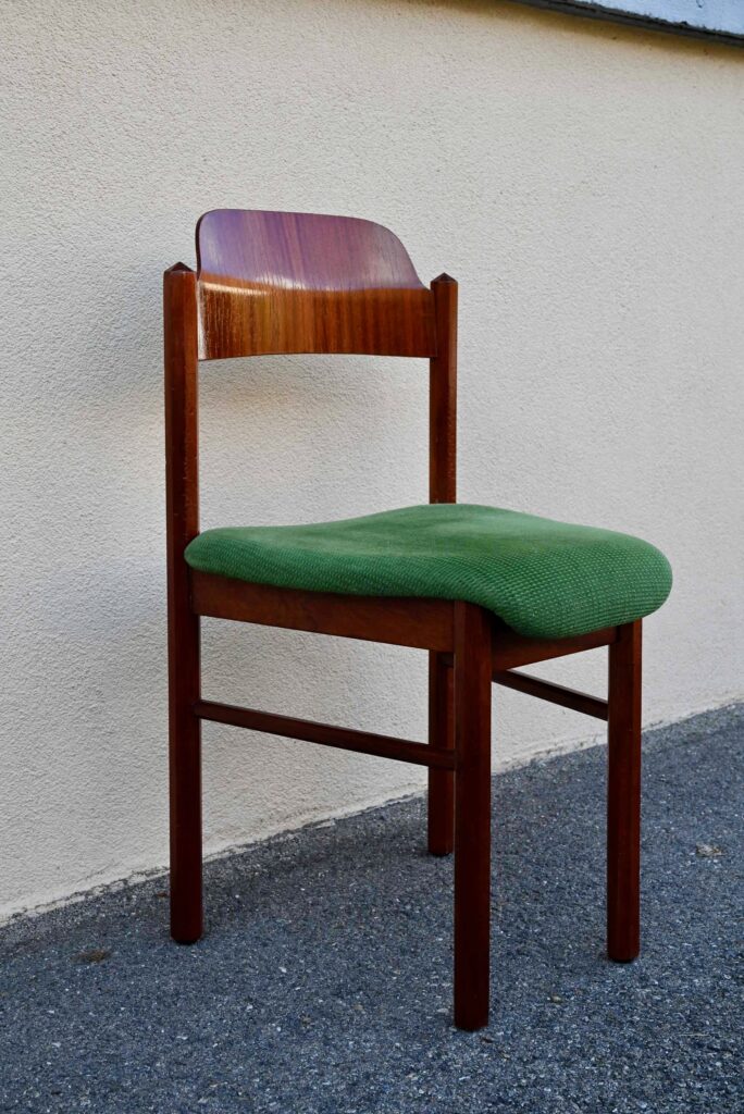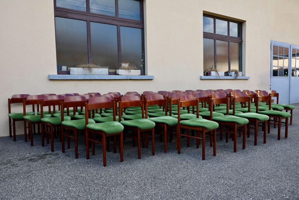 La structure des chaises est en bois massif, du hêtre de teinte teck profonde. Le dossier est en contreplaqué courbe. Les assises sont épaisses, couvertes d’un tissu velours vert très propre. De forme particulière, les pieds avant sont resserrés et portent donc une assise de forme effilée. Elles sont en bon état, confortables et stables, en plus d’être très originales. Le prix est pour 20 chaises. Nous disposons d’un grand nombre de chaises de ce modèle, un lot personnalisable est constituable sur simple demande.