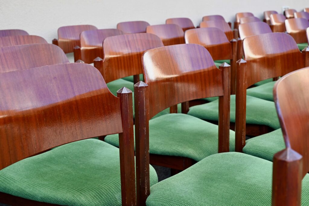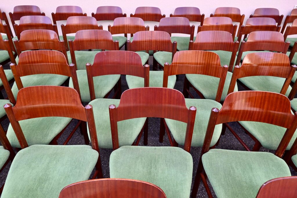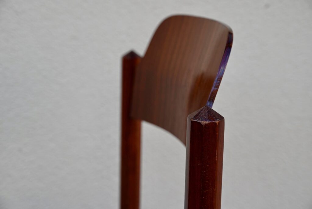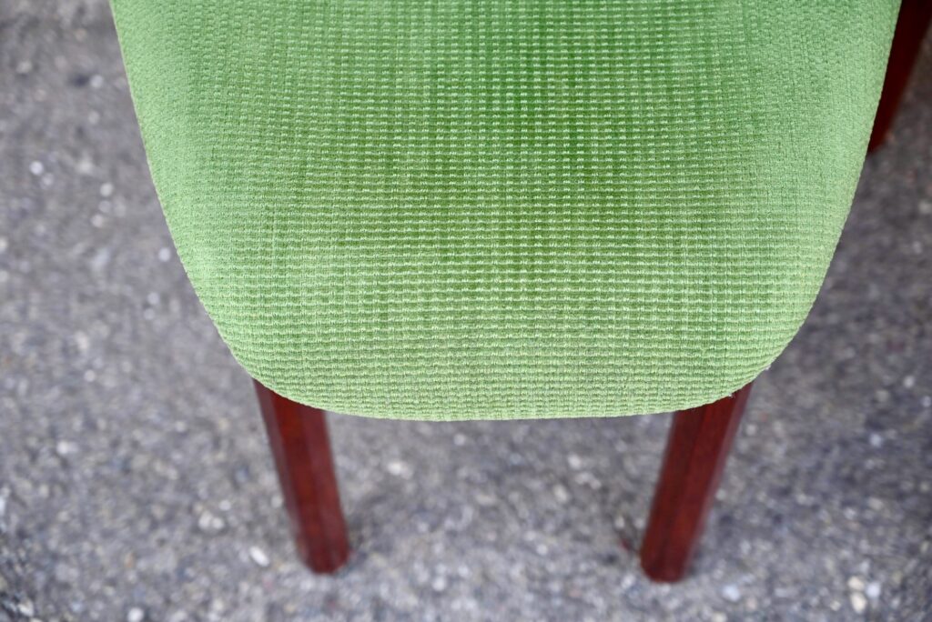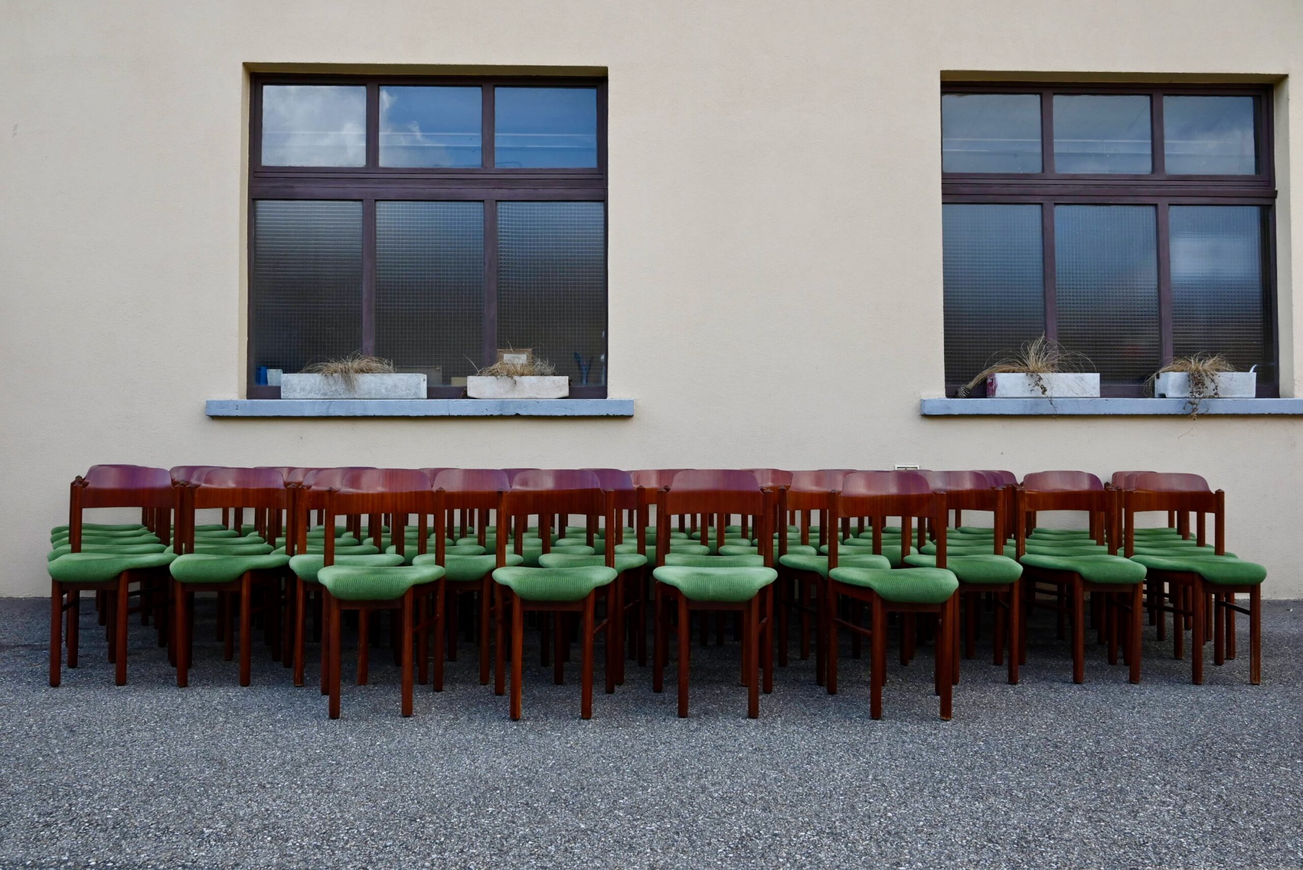 La structure des chaises est en bois massif, du hêtre de teinte teck profonde. Le dossier est en contreplaqué courbe. Les assises sont épaisses, couvertes d’un tissu velours vert très propre. De forme particulière, les pieds avant sont resserrés et portent donc une assise de forme effilée. Elles sont en bon état, confortables et stables, en plus d’être très originales. Le prix est pour 20 chaises. Nous disposons d’un grand nombre de chaises de ce modèle, un lot personnalisable est constituable sur simple demande.