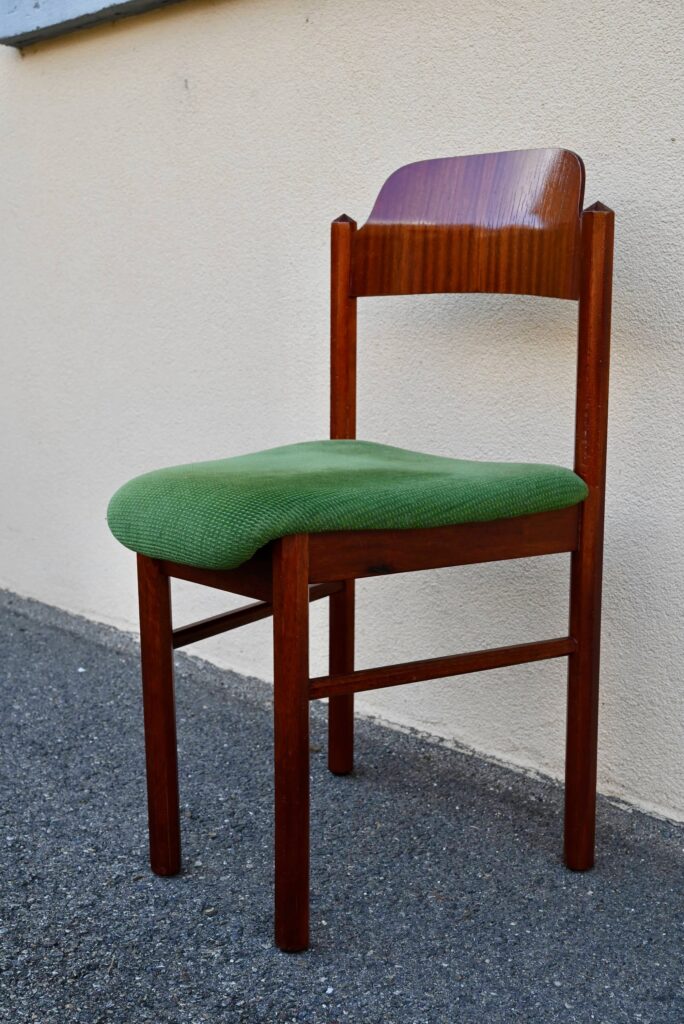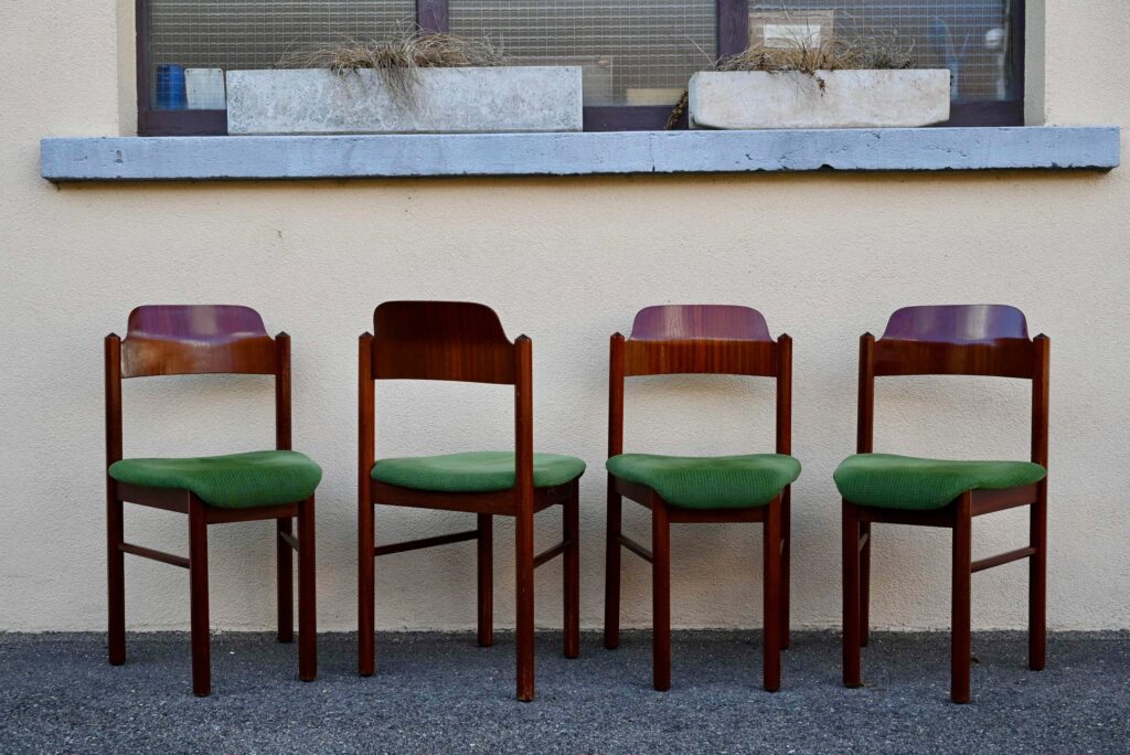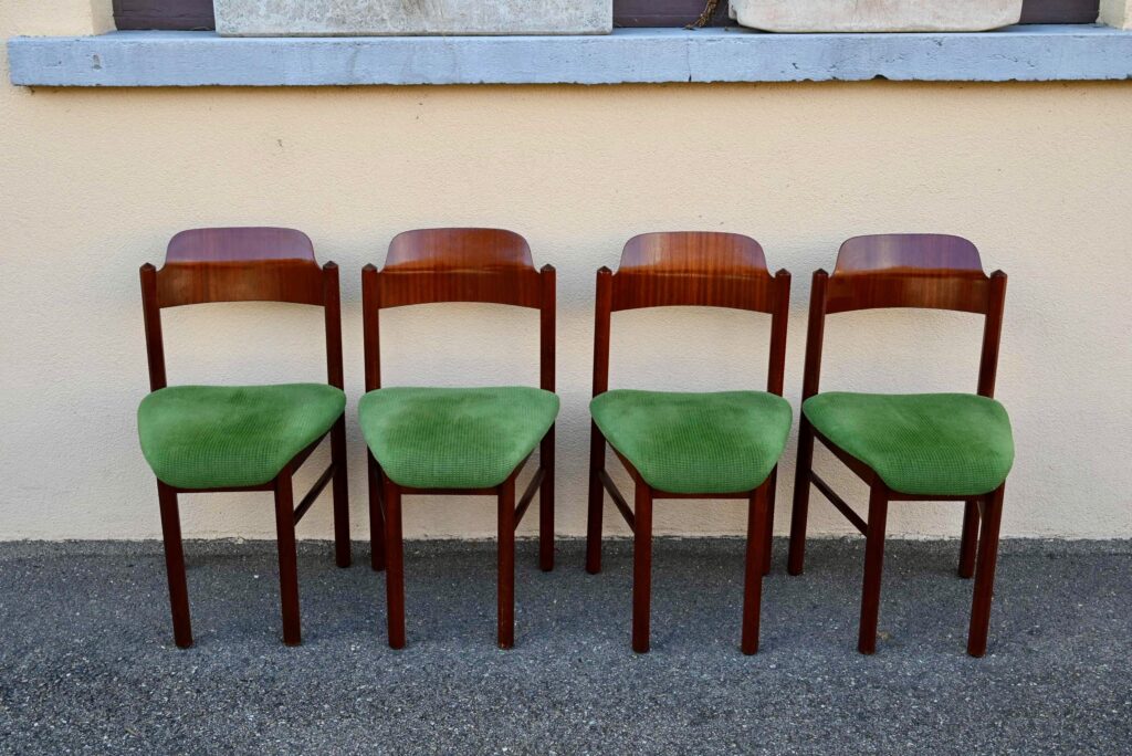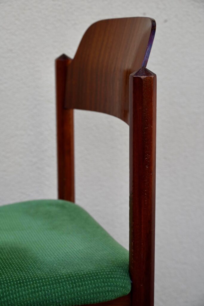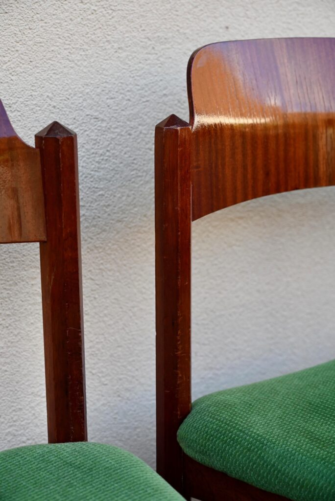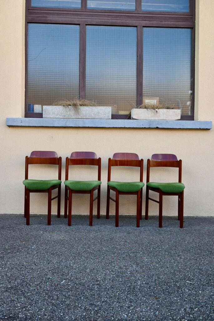 Cette incroyable série de chaises rétro possède des lignes vraiment hors du commun! Avec leur garnissage en velours vert, leurs assises effilées, elles proposent une certaine idée du confort. La structure de teinte teck affiche des lignes dynamiques voire brutalistes, des montants de section octogonale, des arêtes saillantes et un dossier courbe et confortable. Ces chaises seront des pièces de choix dans un salon de thé à la déco marquante ou un restaurant convivial!