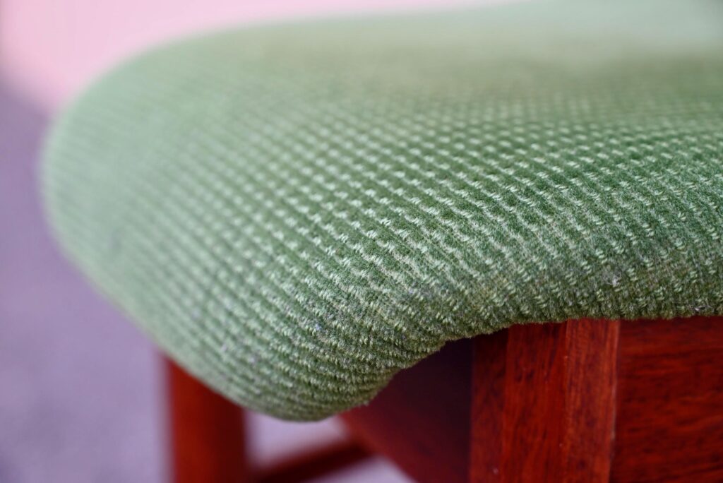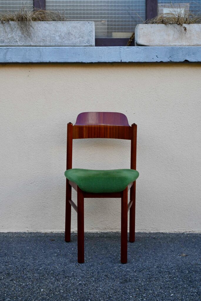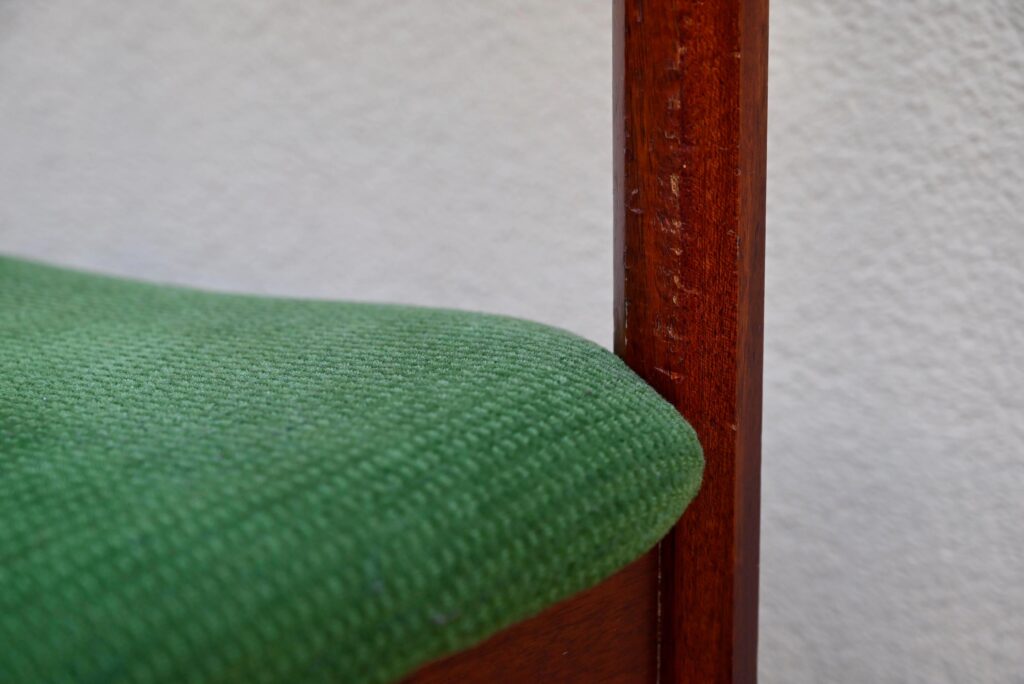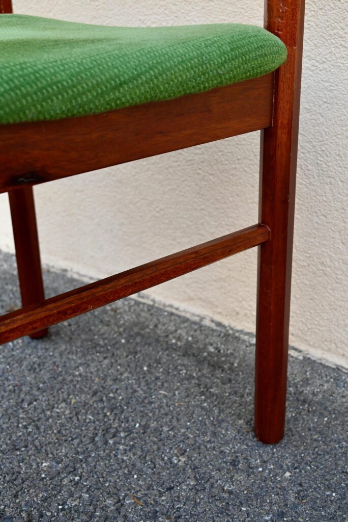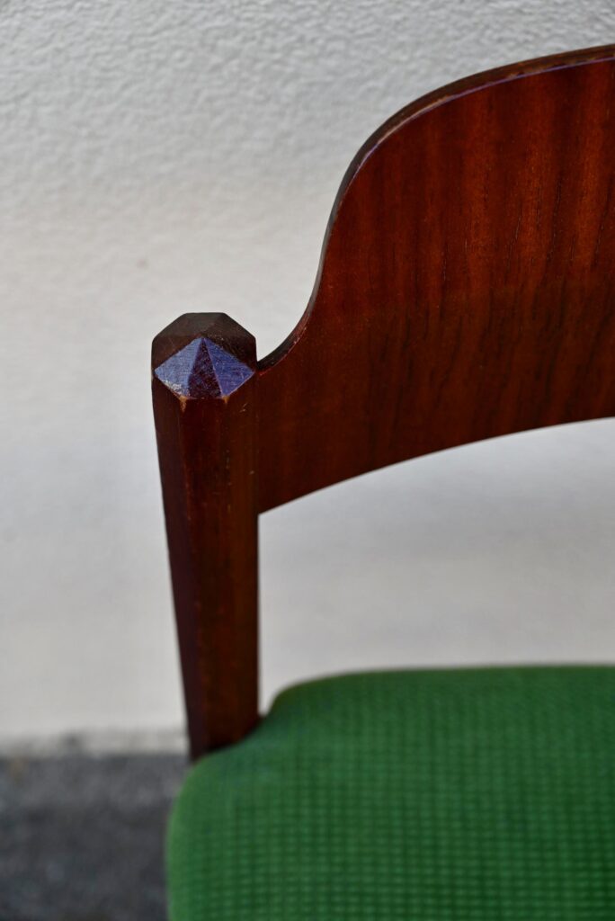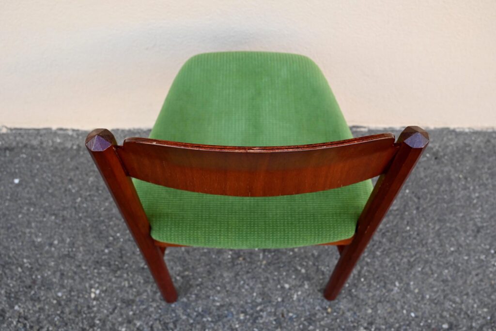 Cette incroyable série de chaises rétro possède des lignes vraiment hors du commun! Avec leur garnissage en velours vert, leurs assises effilées, elles proposent une certaine idée du confort. La structure de teinte teck affiche des lignes dynamiques voire brutalistes, des montants de section octogonale, des arêtes saillantes et un dossier courbe et confortable. Ces chaises seront des pièces de choix dans un salon de thé à la déco marquante ou un restaurant convivial!
