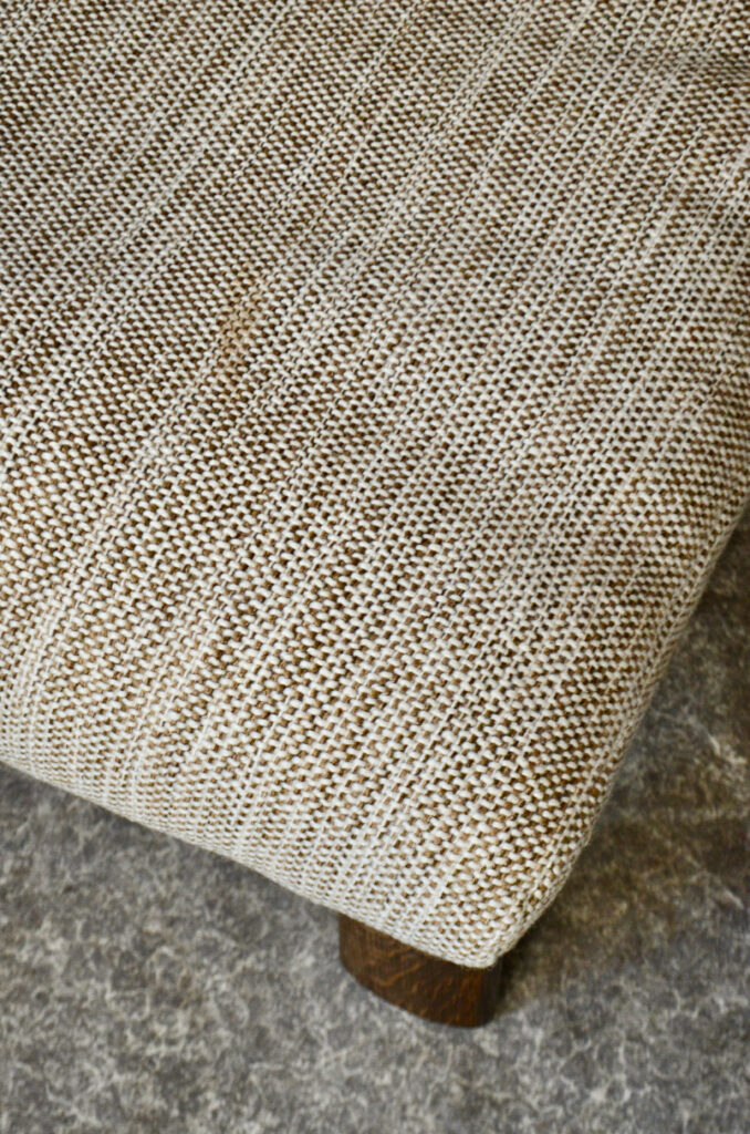 Les fauteuils sont en très bel état et datent des années 70. Ils sont d’un extrême confort. L’assise et le dossier sont accueillants, le tissu est en lainage beige légèrement moucheté de marron. Ils sont moelleux et fermes à la fois. La structure est en bois massif à la teinte profonde. L’ensemble est stable, épais et lourd et en très bel état. Le dossier élégant permet de placer les fauteuils en centre de pièce. Une discrète tache est à noter sur 3 des 4 fauteuils, visible en photo. Le lainage est très propre. Le bois est légèrement décoloré par le soleil sur un des fauteuils, visible en photo. Un des fauteuils comporte une patte en métal sous la structure afin de relier deux fauteuils et constituer un canapé 2/3 places. Le prix est indiqué pour les 4 pièces.