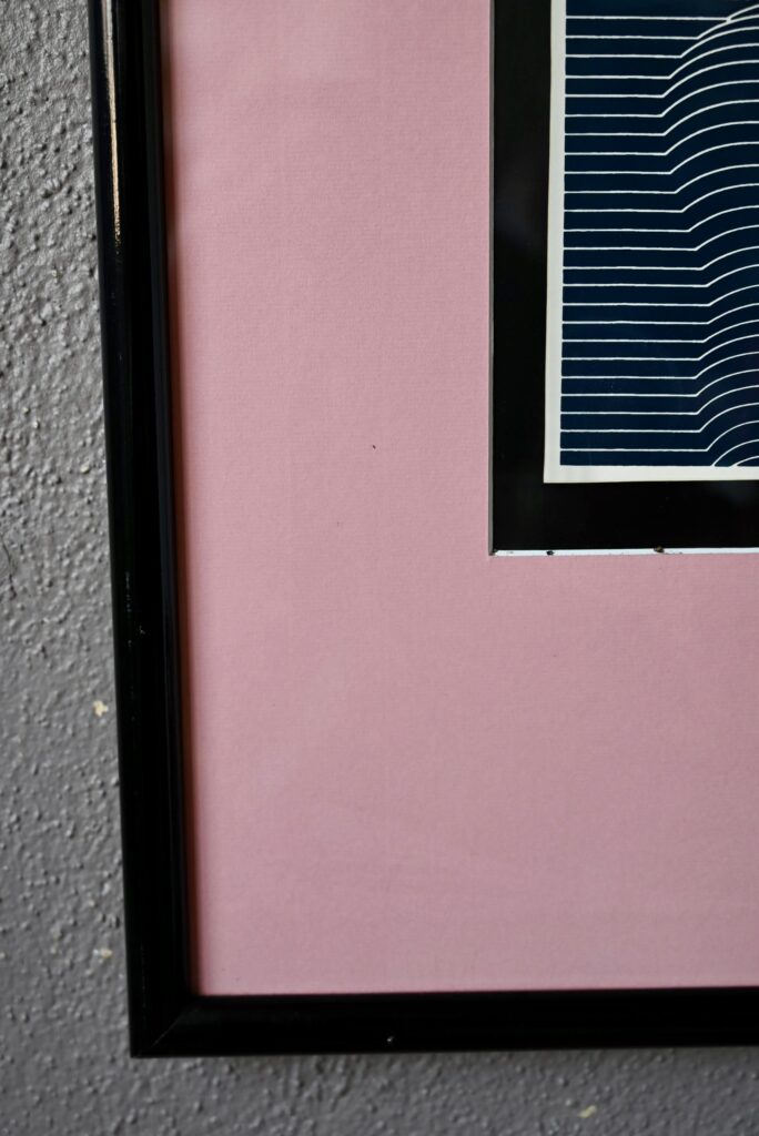Grande sérigraphie des années 70. Nu de femme, traits blancs sur fond bleu nuit, bel effet visuel. Encadré et sous verre, très bon état.