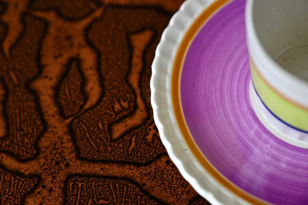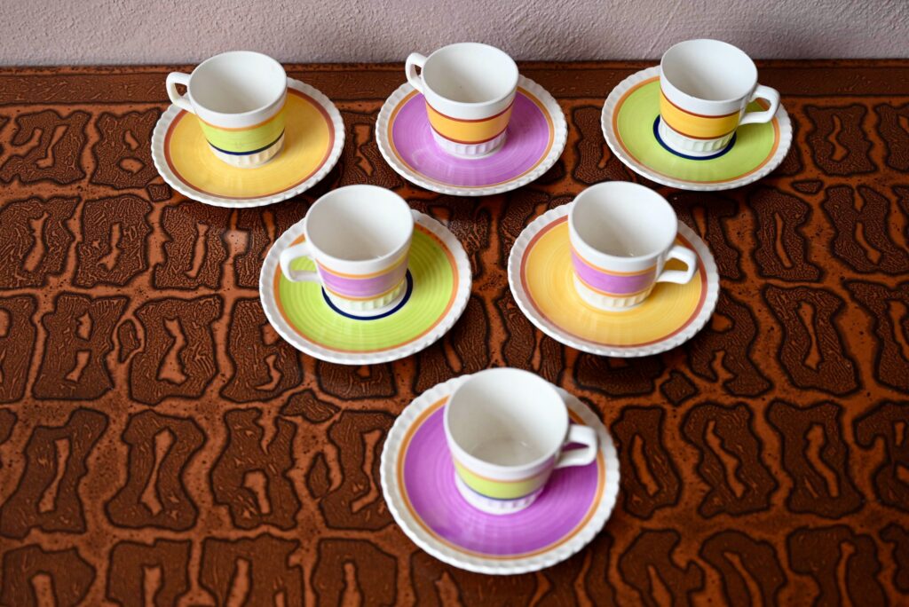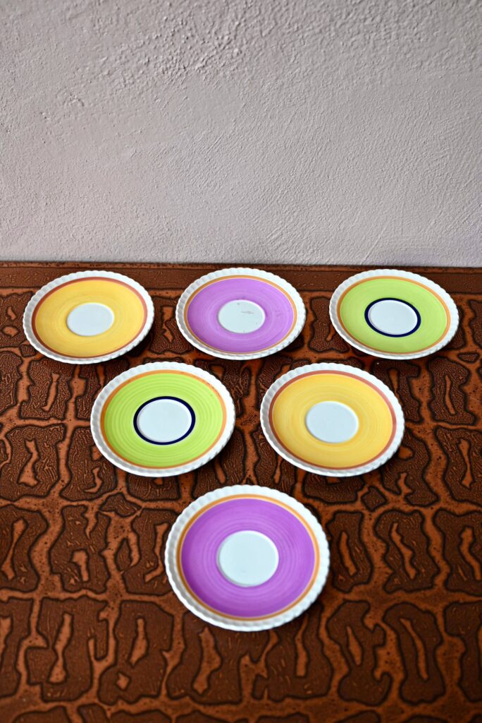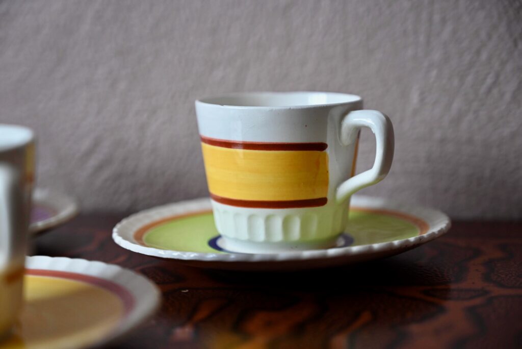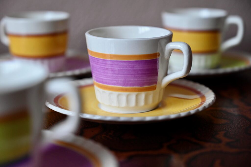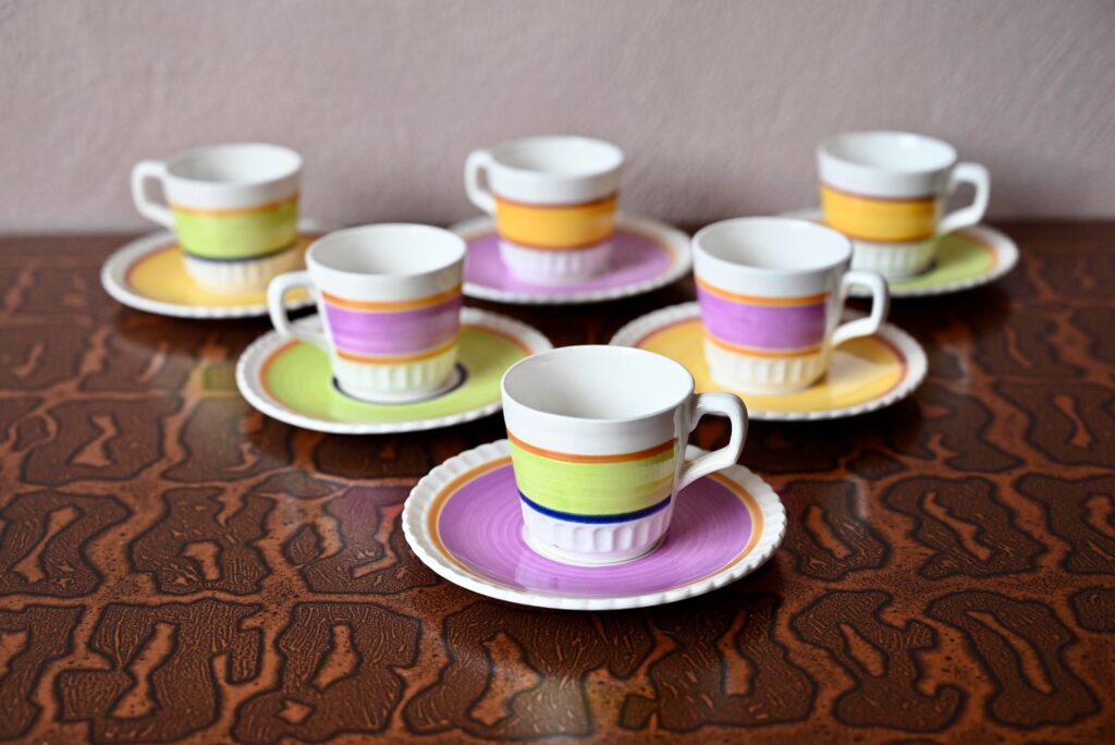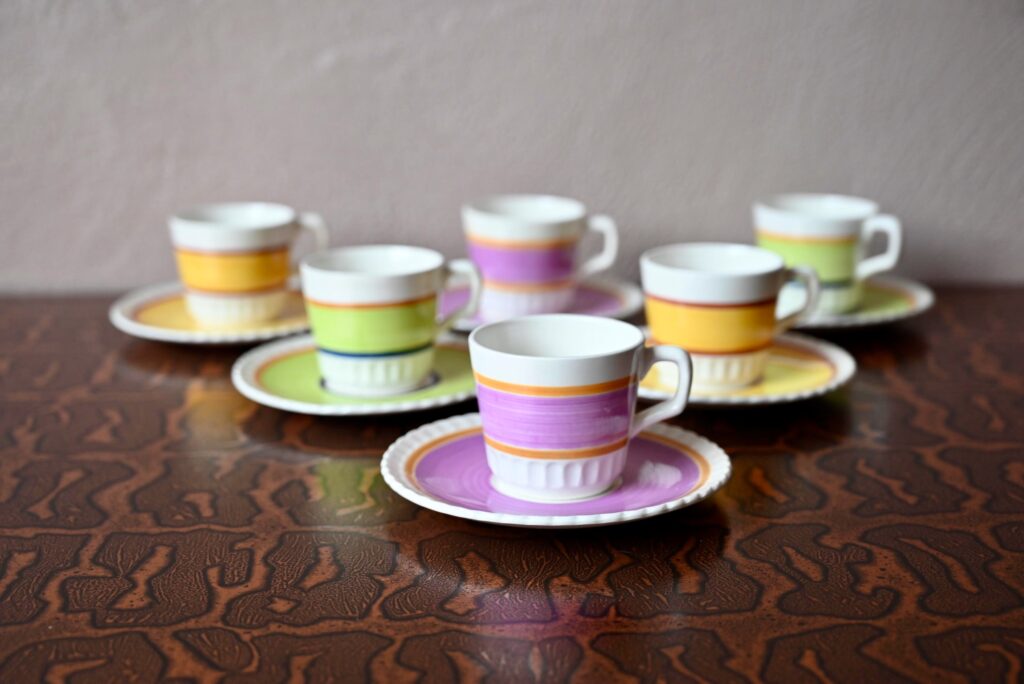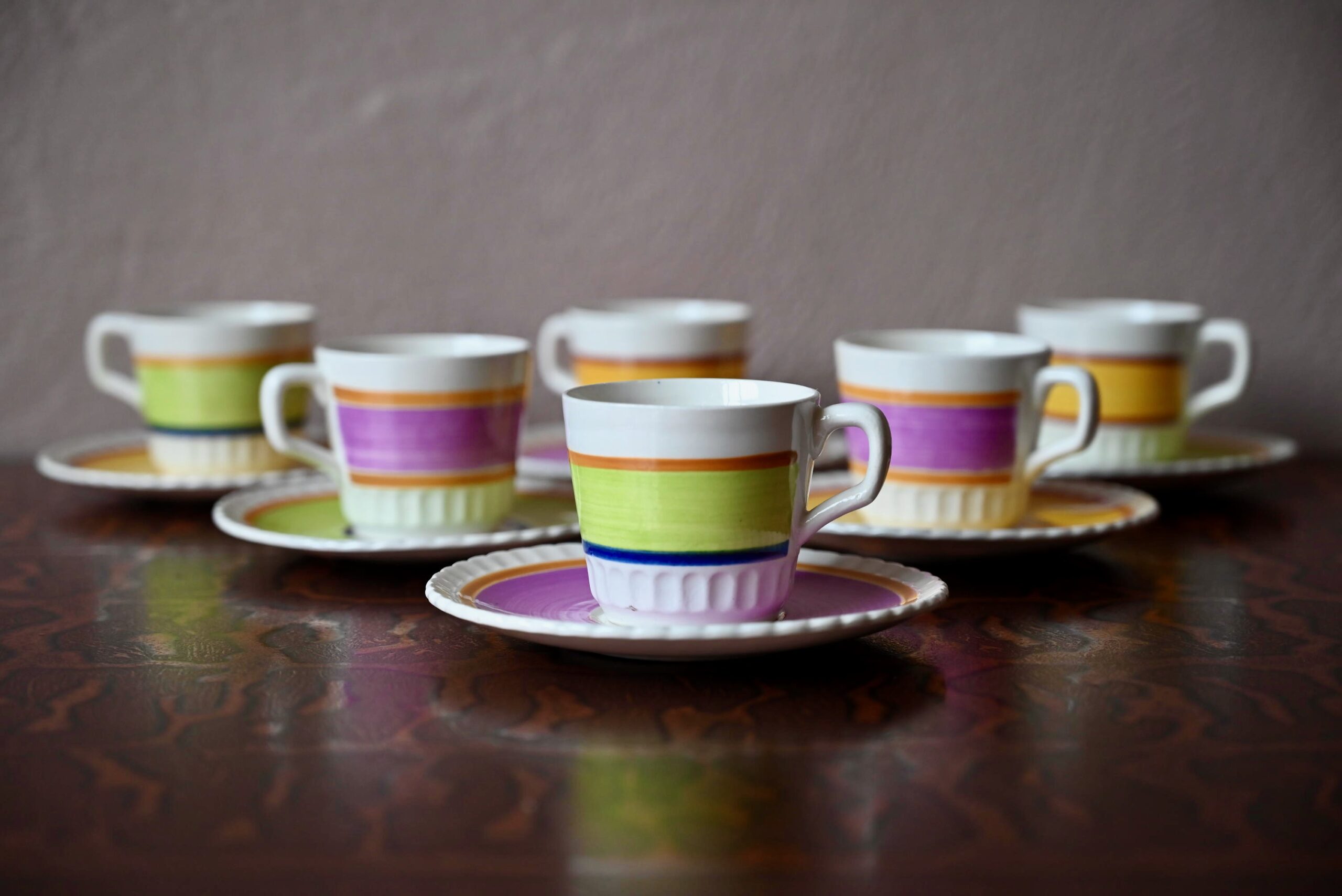 Joie et douceur à l’heure du café! Voici un joli très joli service de tasses et soucoupes des années 40. Couleurs tendres et pastels et un brin de modernité pour ce service Digoin si délicat. L’explosion de couleurs est accentué lorsqu’on choisit de dépareiller la tasse et sa soucoupe!