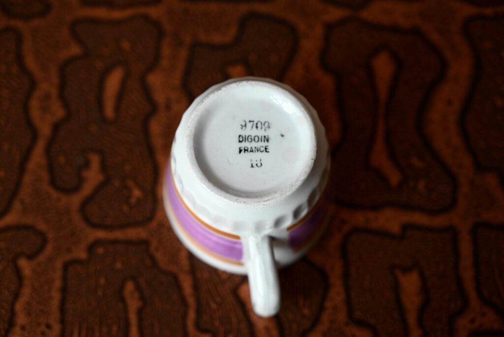 La série est composée de 6 tasses et soucoupes anciennes en faïence. Elles sont en bon état, quelques traces d’usage et défauts de cuisson discrets sont visibles. Elles sont estampillées Digoin France au dos et seront parfaites sur une table aux accents bohème.