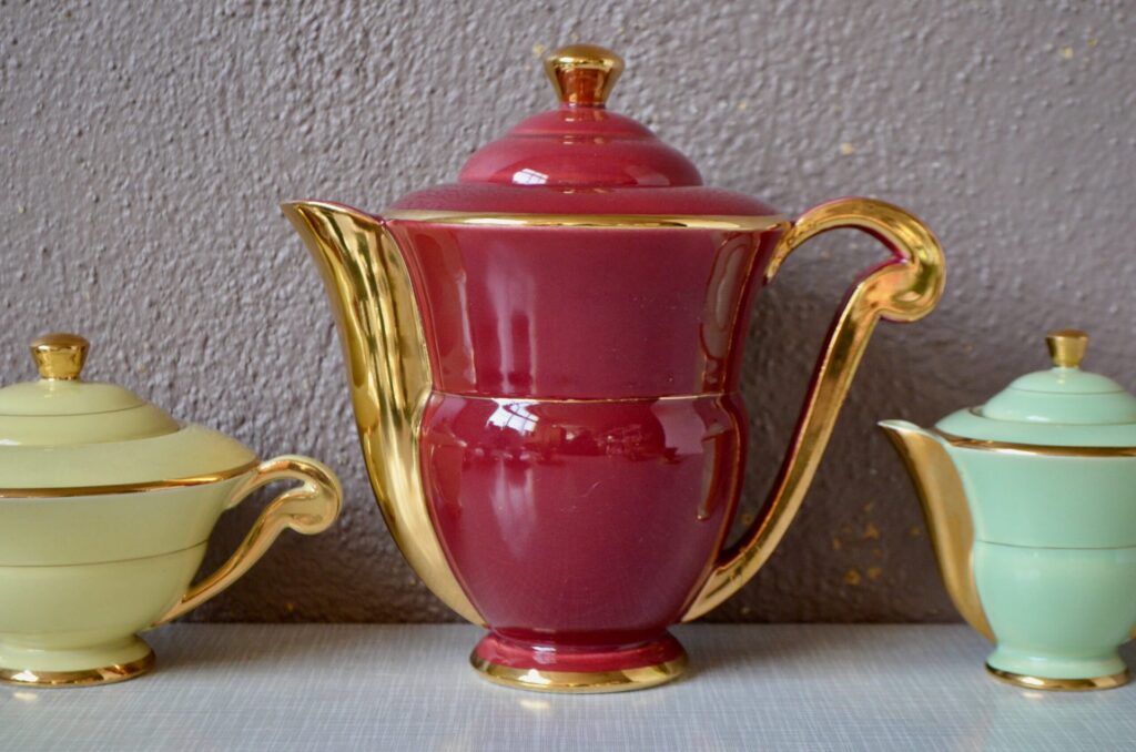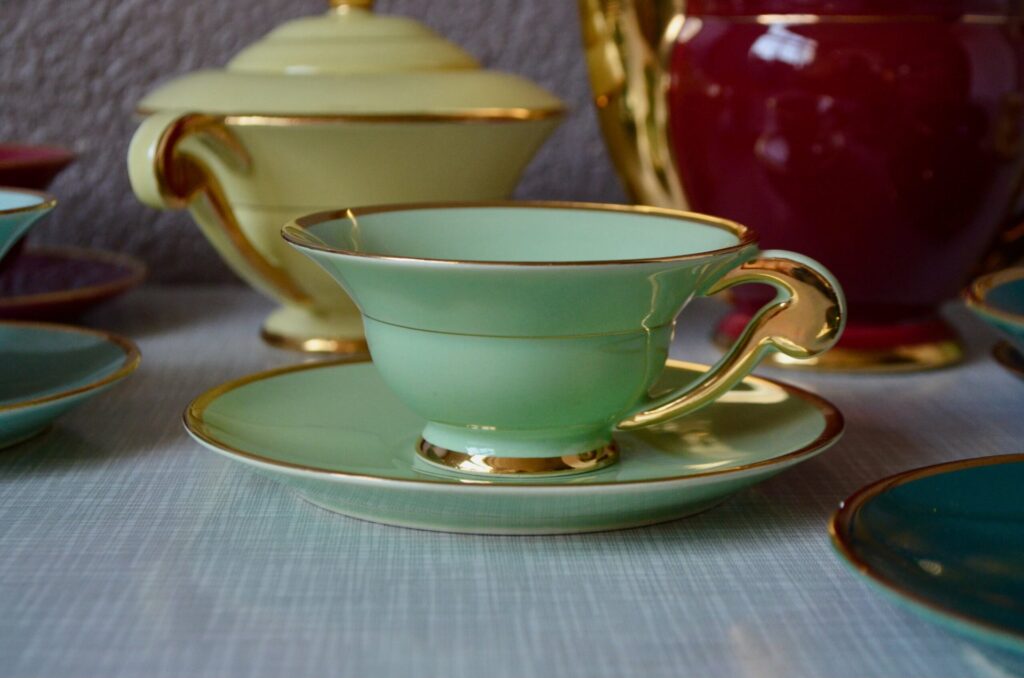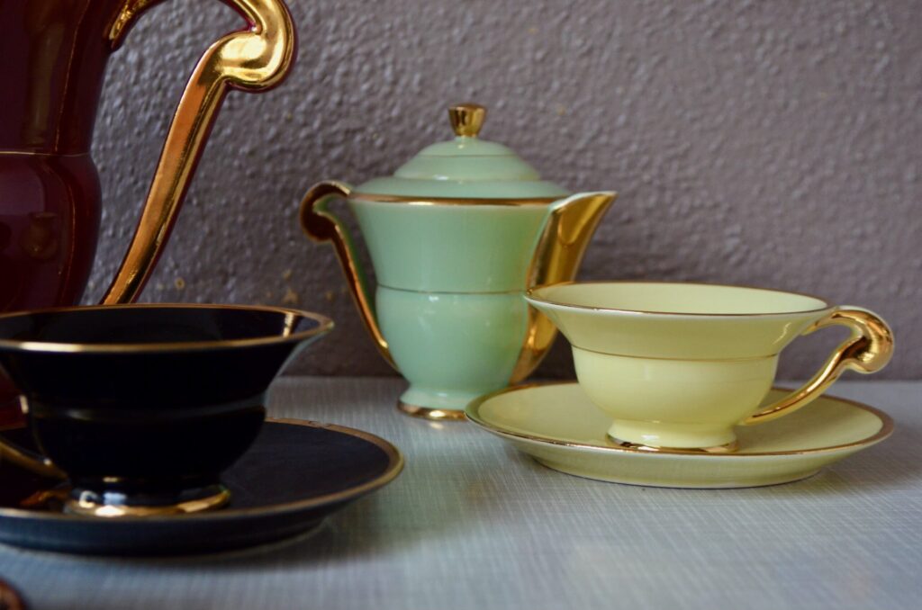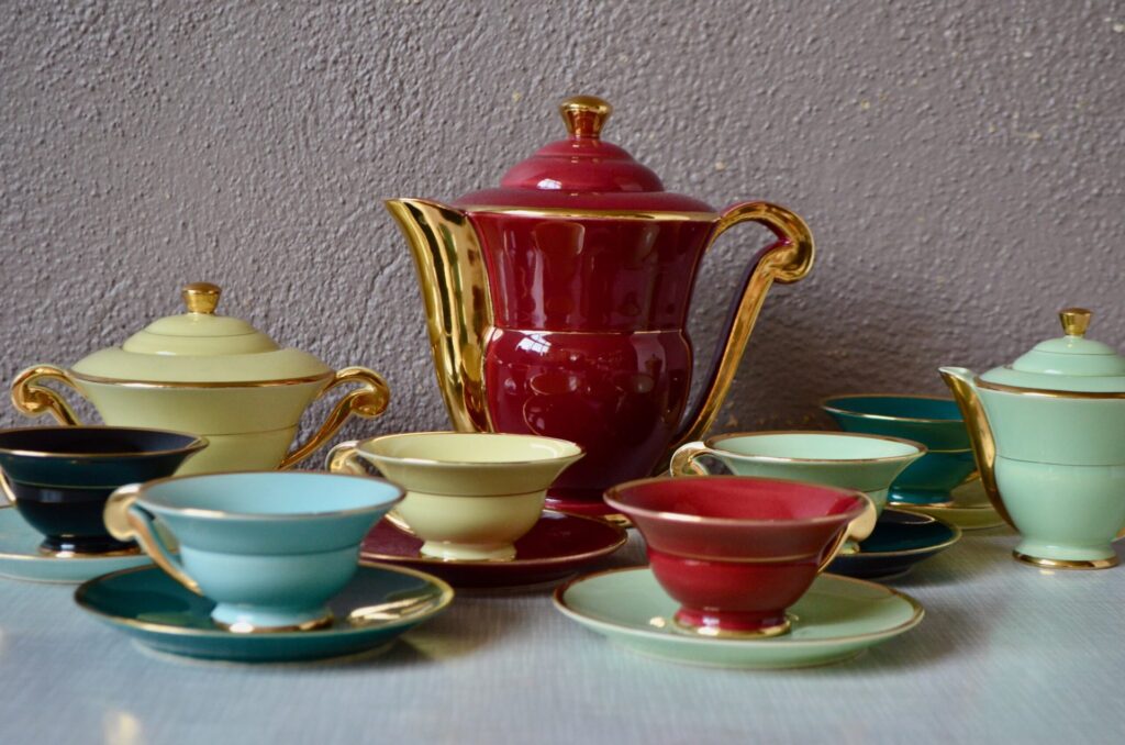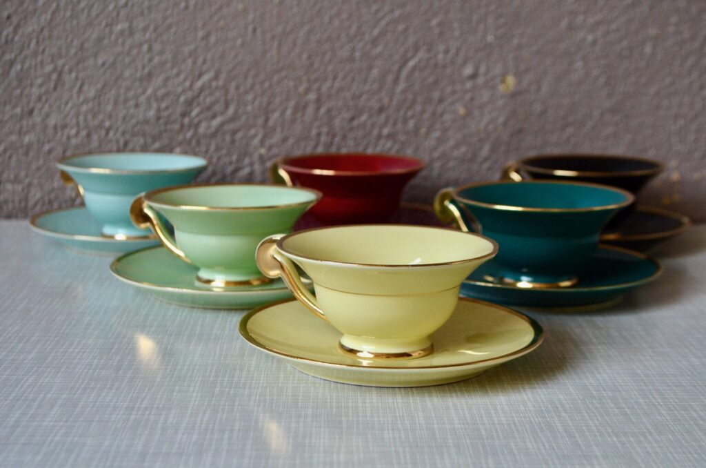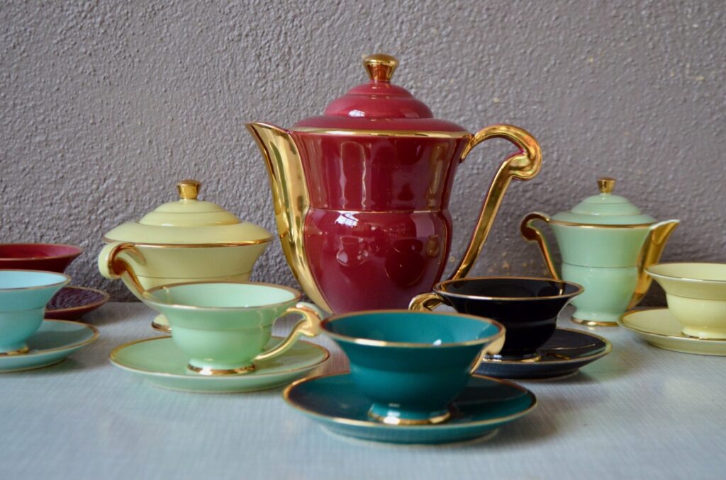 Voici un élégant service à café en porcelaine de style Art Déco, datant des années 1940. Cet ensemble se distingue par sa composition “harlequin”, offrant un assortiment de couleurs vives et contrastées. Il comprend une cafetière, sucrier et pot à lait ainsi que des tasses et leurs soucoupes respectives de teintes variées. Chaque pièce est unifiée par de généreux détails dorés qui soulignent les anses, les becs et les contours, conférant à l’ensemble une allure chic et graphique typique de son époque.
