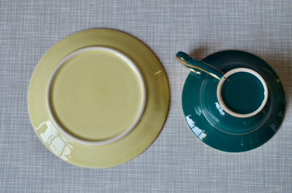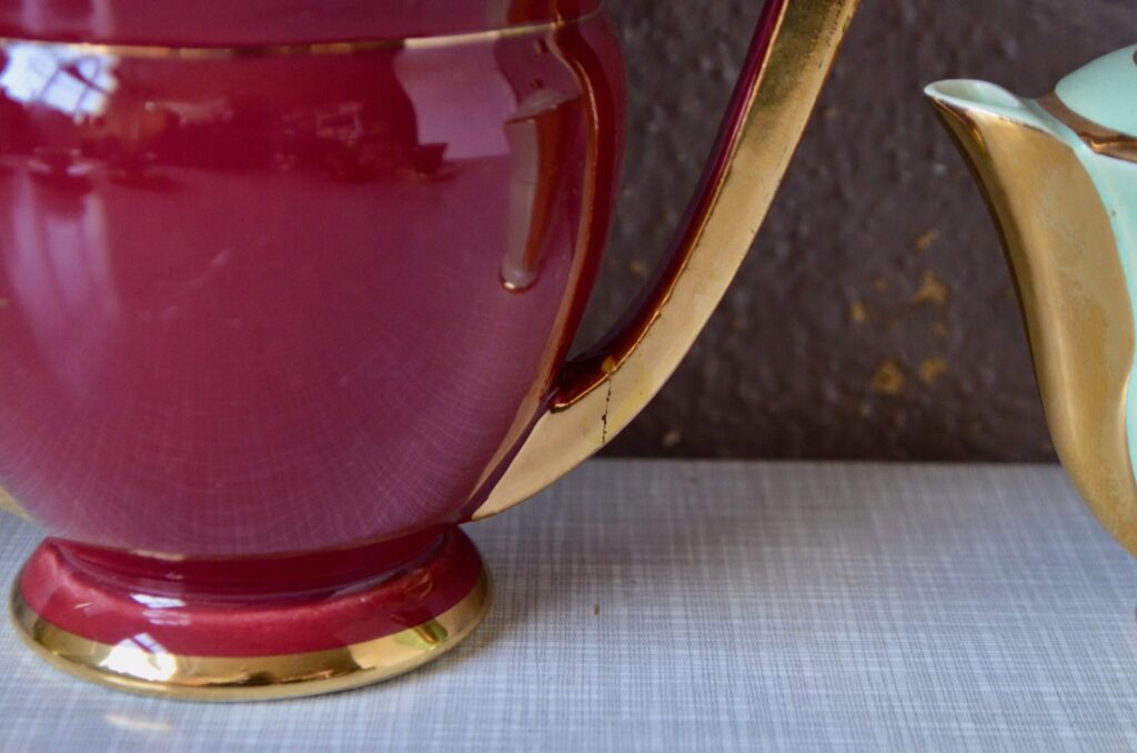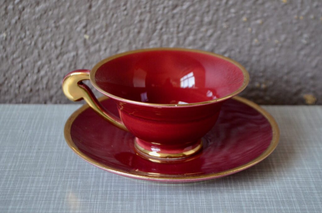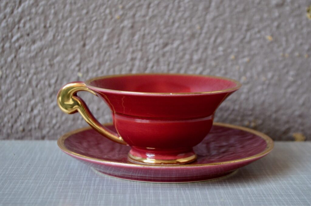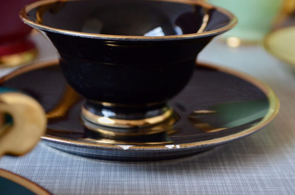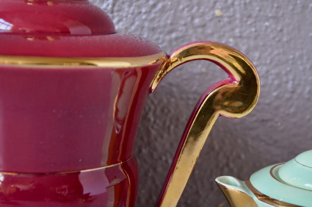 Voici un élégant service à café en porcelaine de style Art Déco, datant des années 1940. Cet ensemble se distingue par sa composition “harlequin”, offrant un assortiment de couleurs vives et contrastées. Il comprend une cafetière, sucrier et pot à lait ainsi que des tasses et leurs soucoupes respectives de teintes variées. Chaque pièce est unifiée par de généreux détails dorés qui soulignent les anses, les becs et les contours, conférant à l’ensemble une allure chic et graphique typique de son époque.