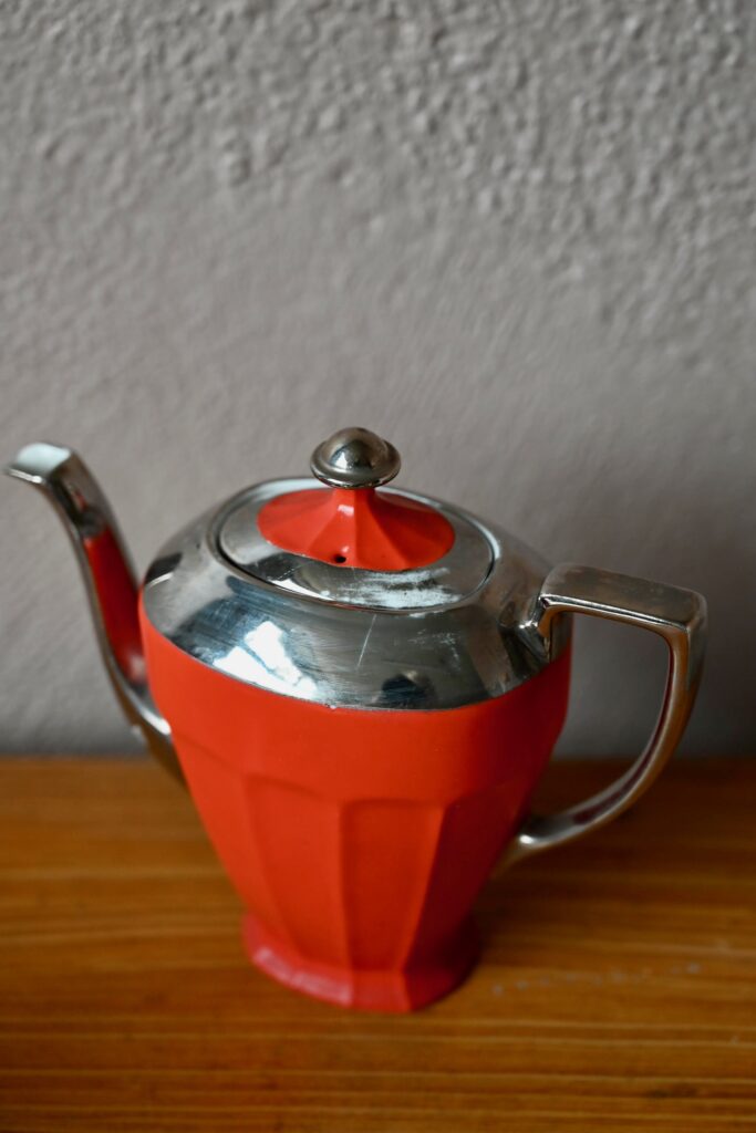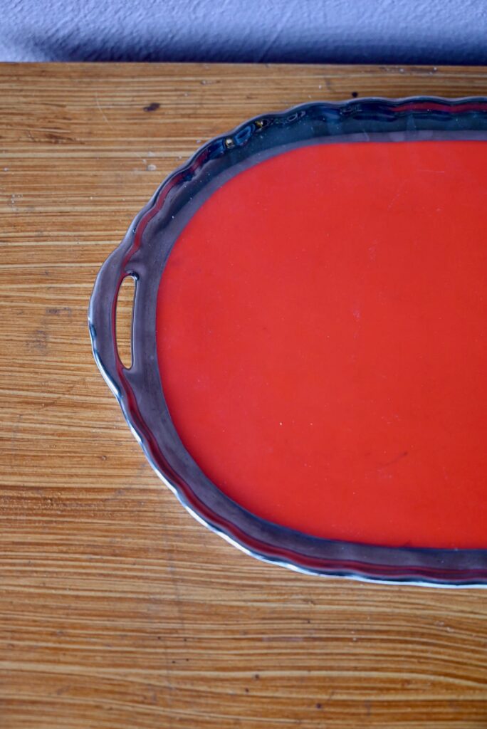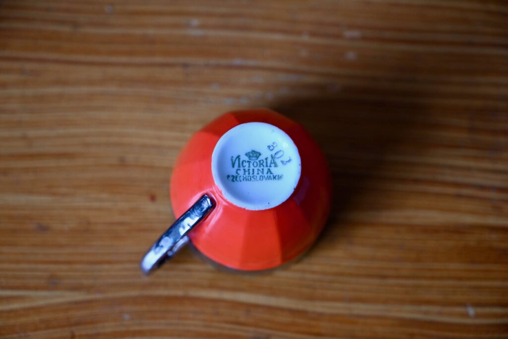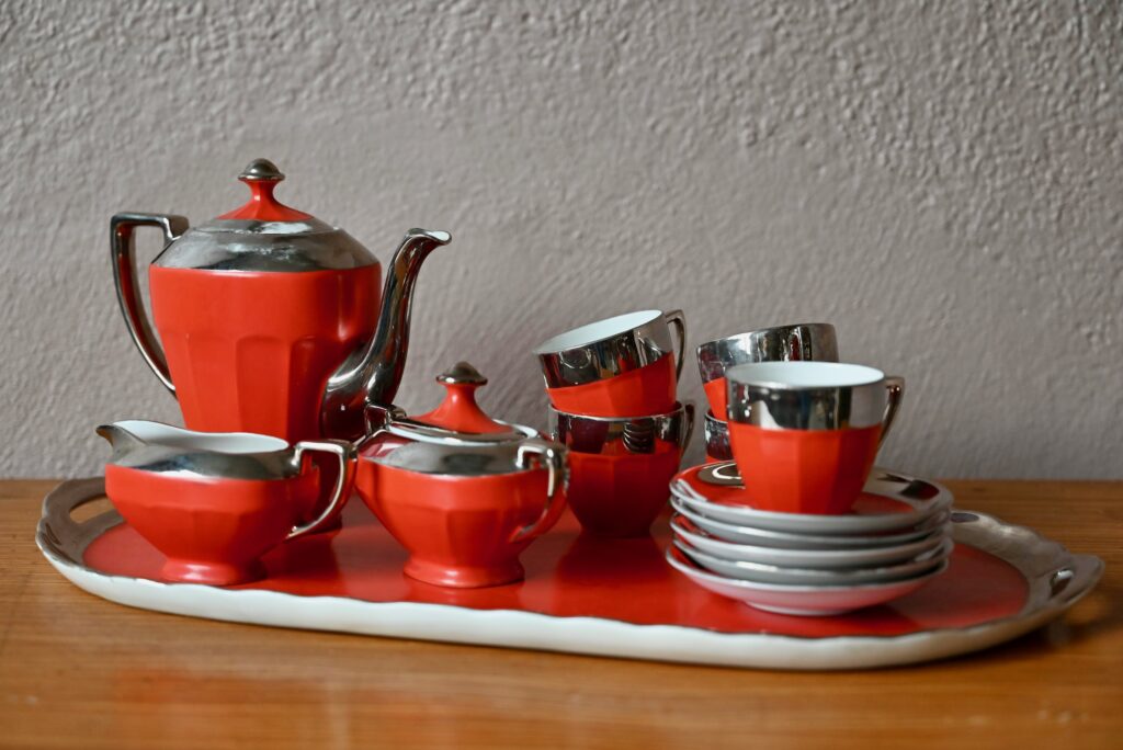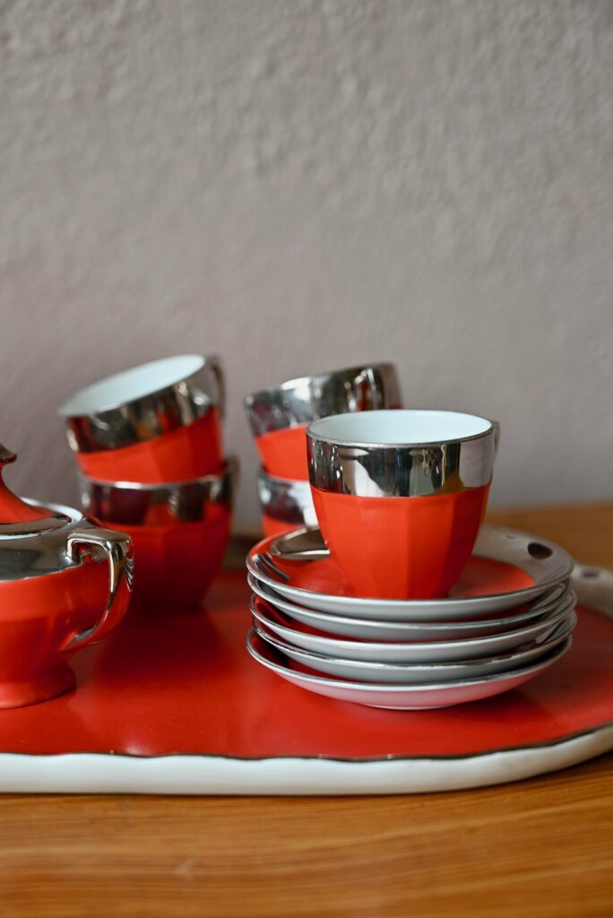 Production Tchèque de l’entre-deux-guerres, ce magnifique service à café sur plateau, aux coloris éclatants, se révèle dans un pur style Art Déco, à la fois énergique et élégant. Fabrique réputée et haut de gamme, Victoria China nous régalera avec ses couleurs et sa classe à l’heure des mokas et cafés crèmes.