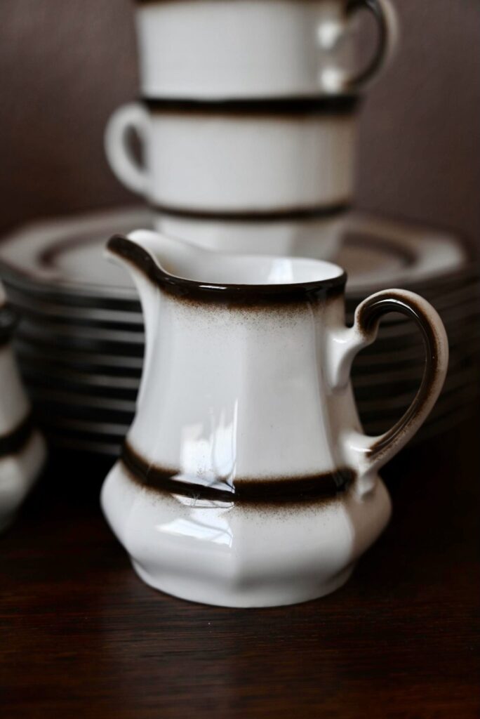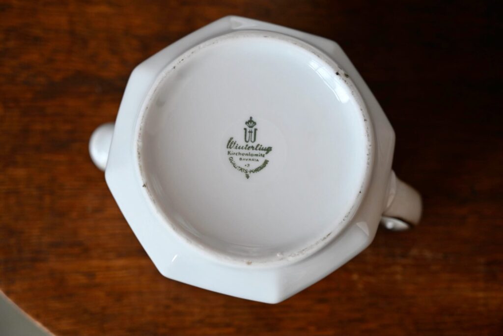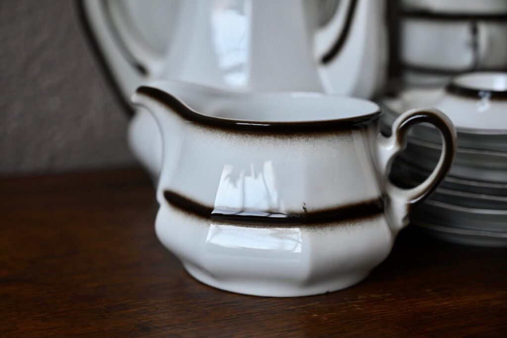 Le service est ancien et de belle facture, il est composé de 21 pièces. La porcelaine est fine, blanche et brillante. Un liseré marron sur les arêtes est présent sur les pièces. L’ensemble est composé de 8 tasses, une théière-cafetière, un pot à crème, un sucrier. L’ensemble a été utilisé mais est en très bel état. Il est estampillé porcelaine de Bavière Winterling.
