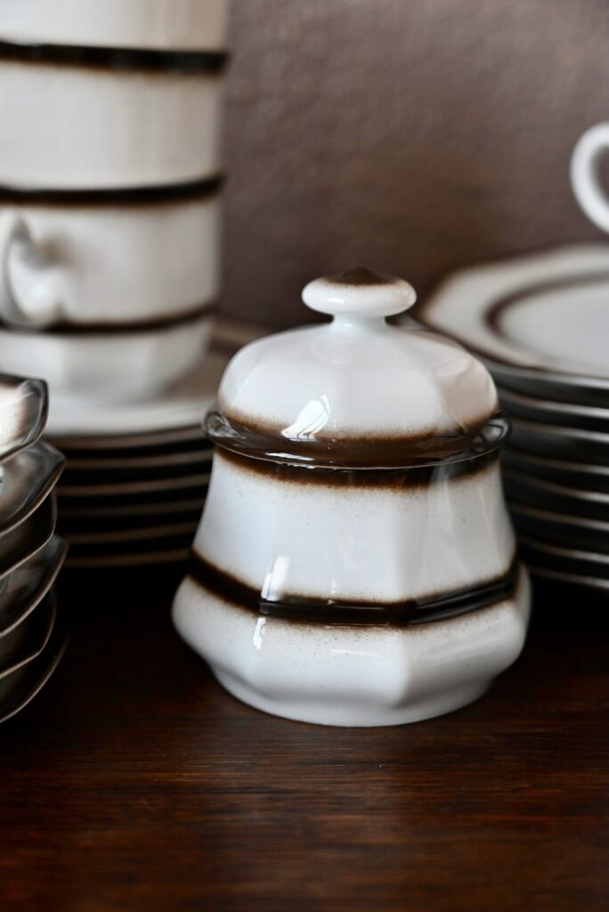 Élégance intemporelle à l’heure de la pause café avec ce superbe service. Très complet et comprenant même des coquetiers, on l’appréciera pour le brunch! La porcelaine blanche Winterling est très fine et brillante, les liserés marron façon “projeté” confèrent un petit air précieux et bohème à cette vaisselle au dessin parfait, sobre et élégant.