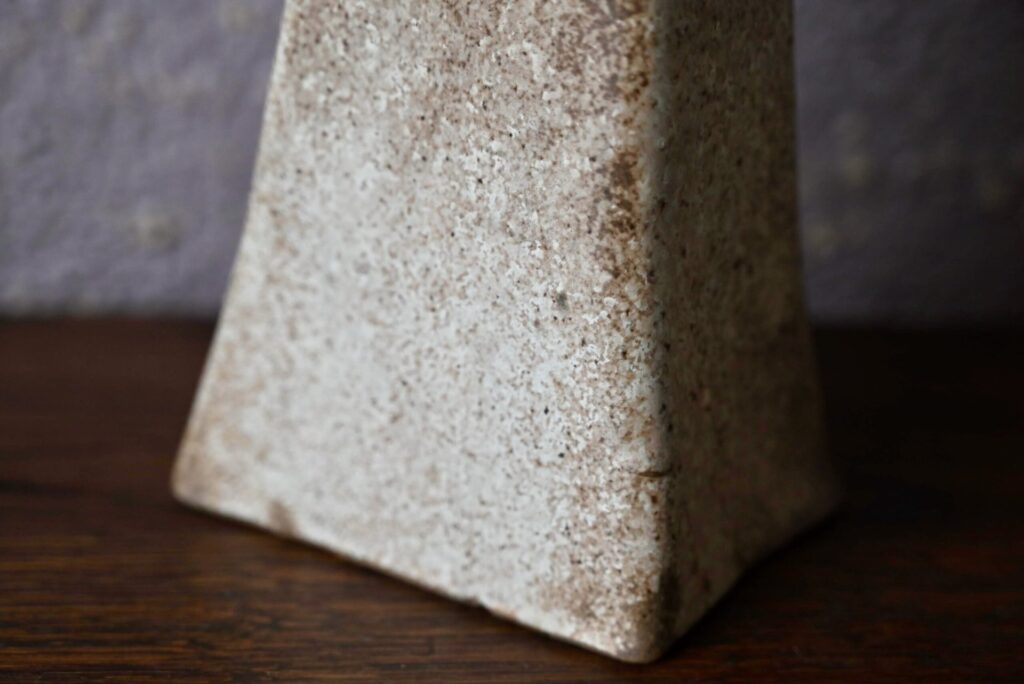 Le vase est en grès texturé beige, moucheté marron. Il est en bel état et signé sur le dessous.