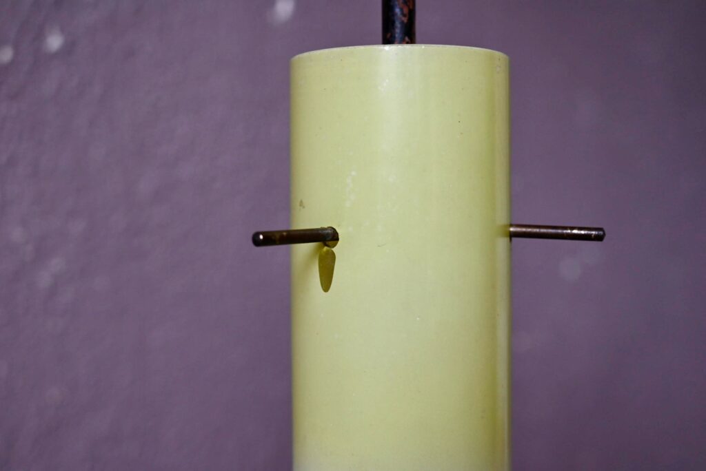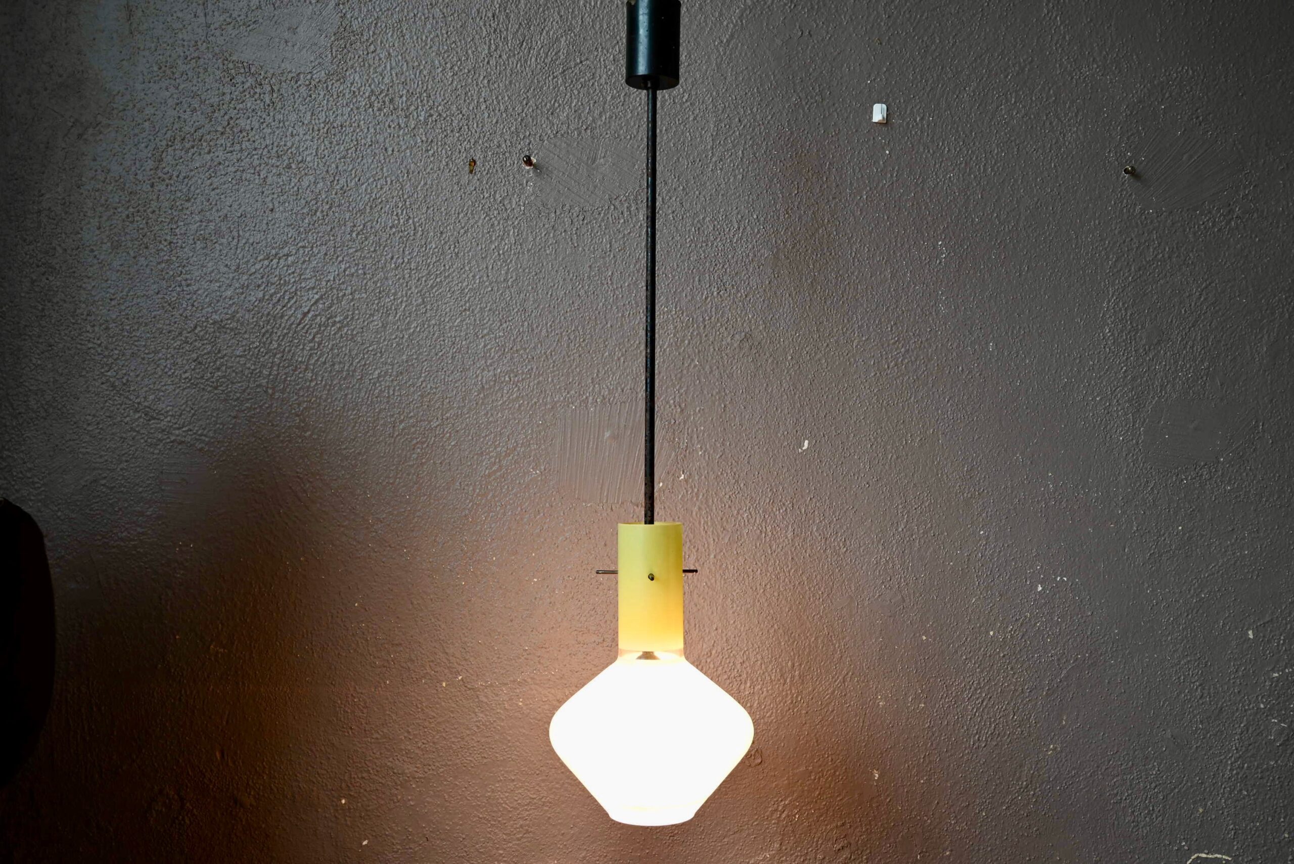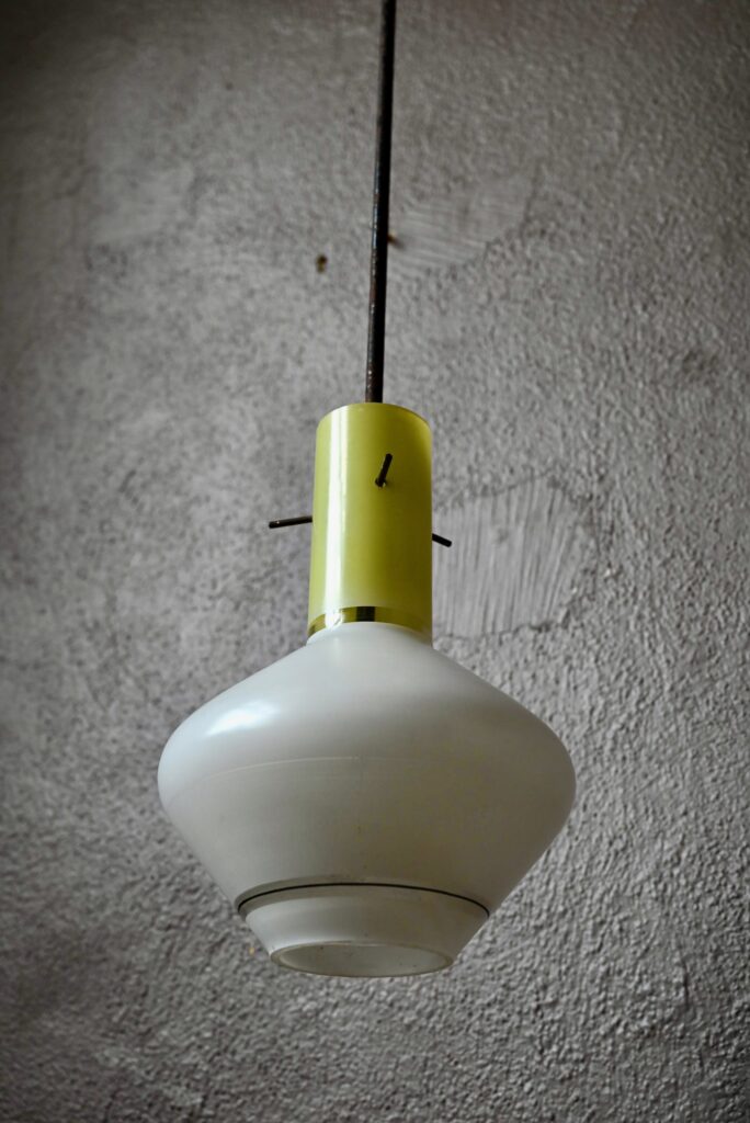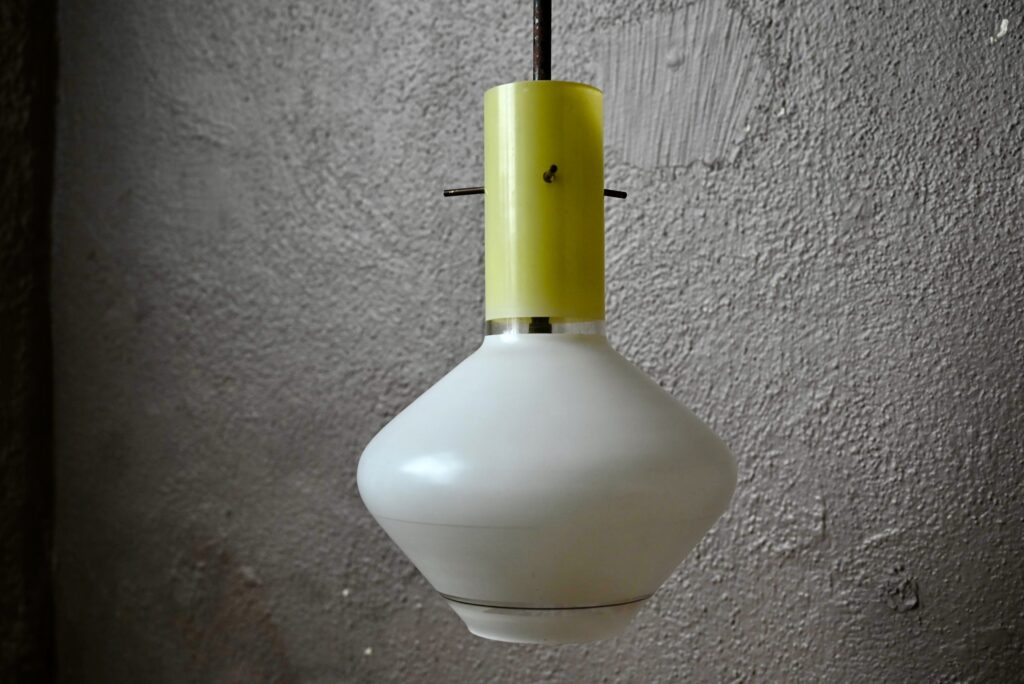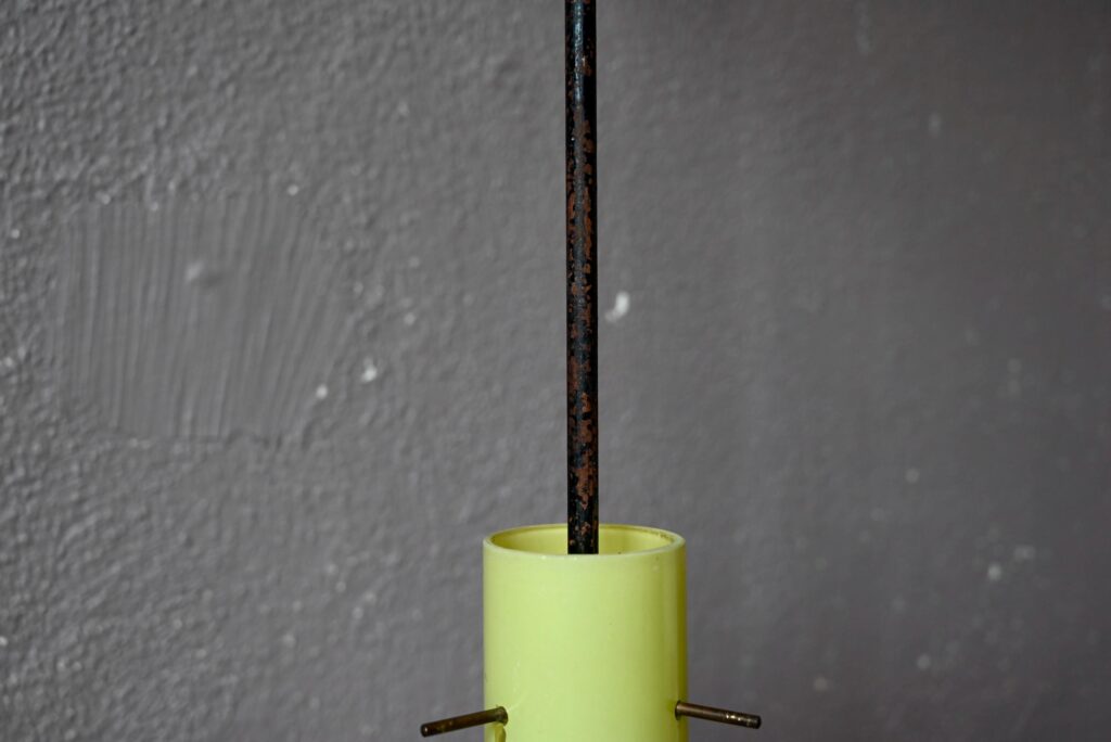 Le lustre est une production italienne des années 50. Il est en verre fin, partiellement coloré jaune-vert, détail liseré noir. Le déflecteur est maintenu à une tige en métal tubulaire noir par trois pattes en laiton à visser. L’ensemble est en bel état, des traces d’oxydation sont visibles sur la tige et un éclat de verre est visible sur le haut du déflecteur. L’électrification est d’origine et fonctionnelle.