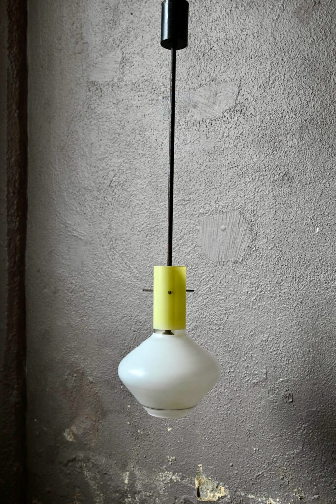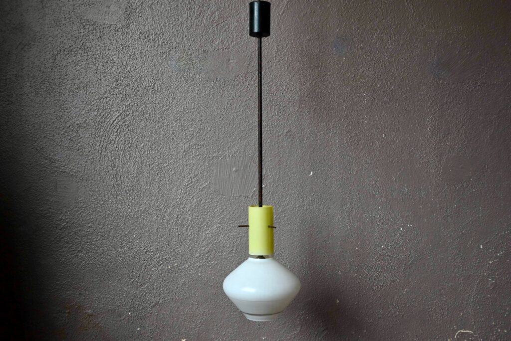 Cette magnifique suspension italienne des années 50 allie modernité et originalité. Dans un pur style midcentury, elle est constituée d’une pièce de verre opalin au décor coloré et graphique, fixe à une tige de métal tubulaire noir. Ce luminaire possède indéniablement le chic et l’audace à l’italienne….