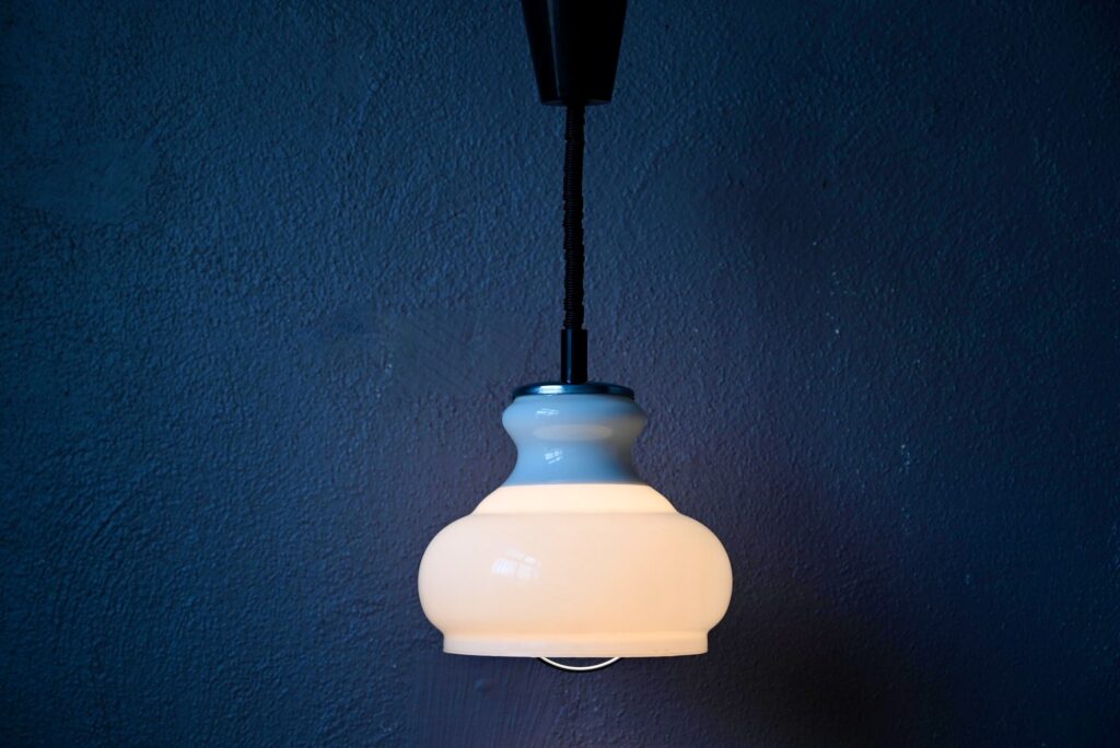 Cette suspension en verre opalin blanc est une production des années 70. Elle possède un design tout en arrondi, dans un esprit Space Age. Elle est dotée d’un système de réglage en hauteur italien, dit monte et baisse et est coiffée d’une pièce en métal chromé. La lampe possède de jolies formes qui jouent avec la lumière et diffusent une ambiance chaleureuse et forcément teintée de vintage.