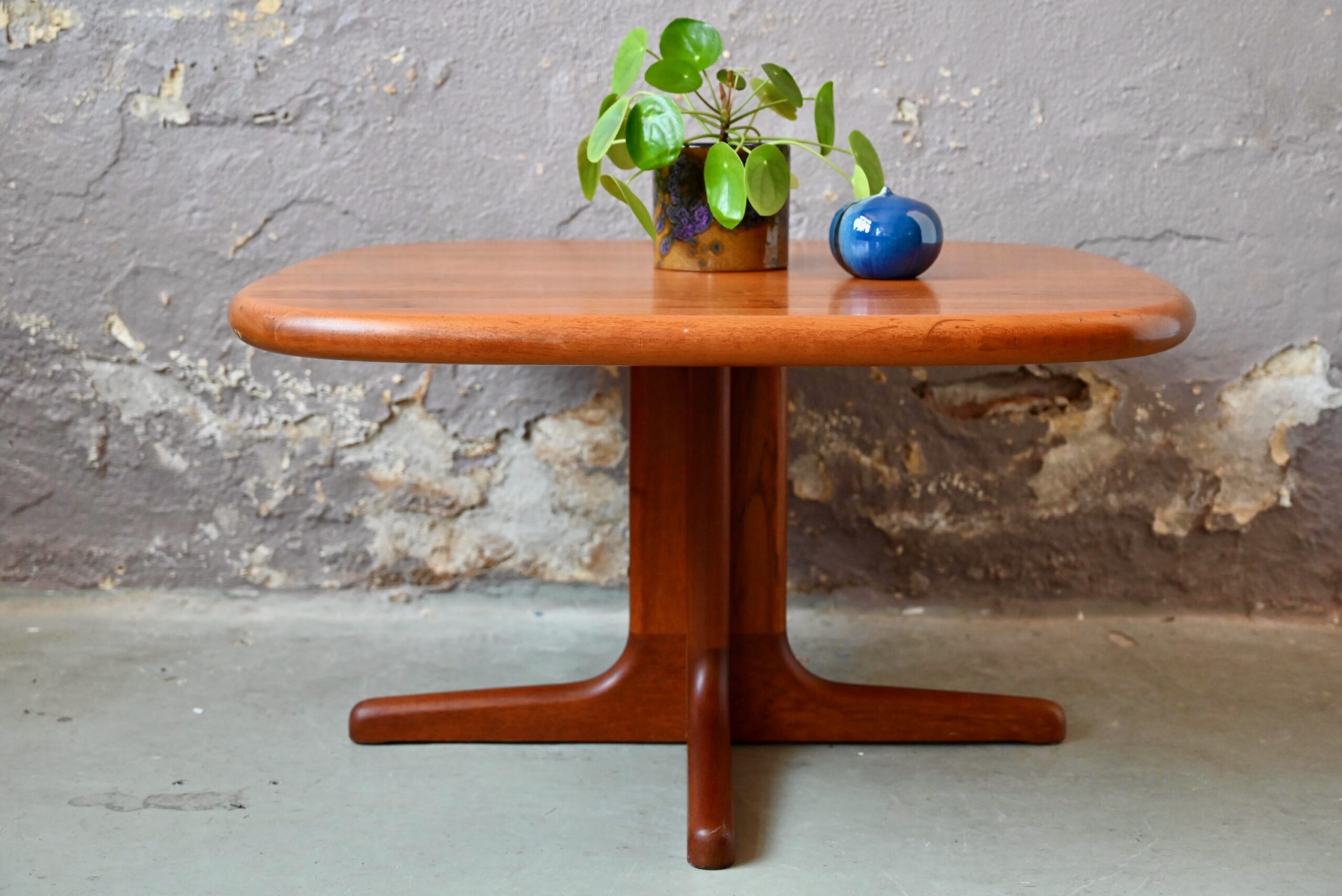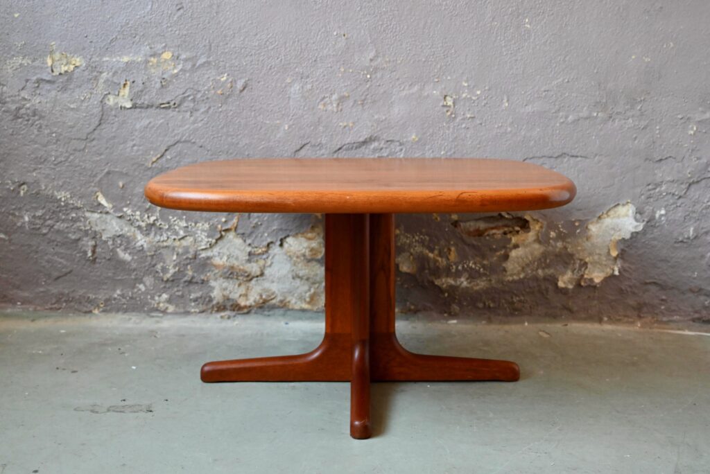 La table basse est réalisée entièrement en bois massif. Elle a été fabriquée au Danemark par le prestigieux éditeur Glostrup Møbelfabrik, un macaron de la marque est visible sur le dessous. Elle est en très bon état, quelques traces d’usage sont visibles sur ces tranches.